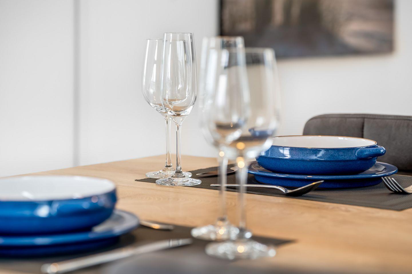 Das Herzstück der Wohnung ist das große Panoramafenster, das den lichtdurchfluteten Wohnbereich in eine echte Wohlfühloase verwandelt. Freuen Sie sich auf eine geschmackvolle Einrichtung, eine offene, voll ausgestattete Küche und einen praktischen Hochtisch, der sich ideal für gemeinsame Mahlzeiten oder ein Glas Wein am Abend eignet.