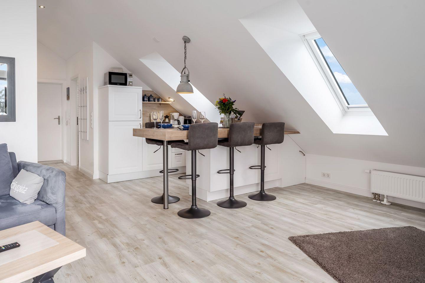 Willkommen in der modernen Ferienwohnung Inselkoje – einer stilvollen Dachgeschosswohnung für zwei Personen, die mit Komfort, heller Atmosphäre und ruhiger Lage überzeugt.