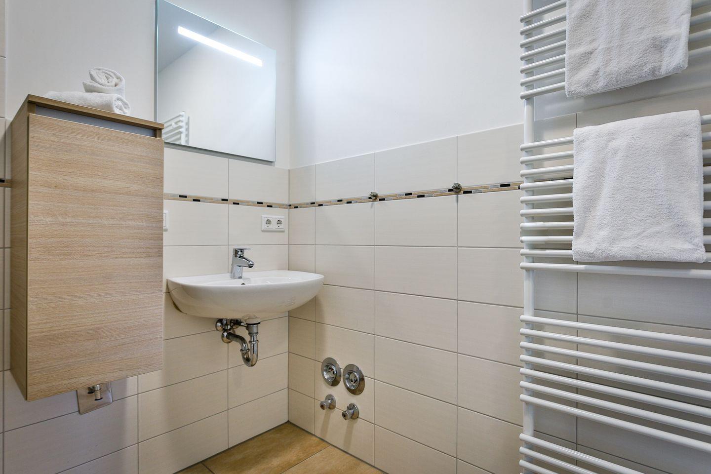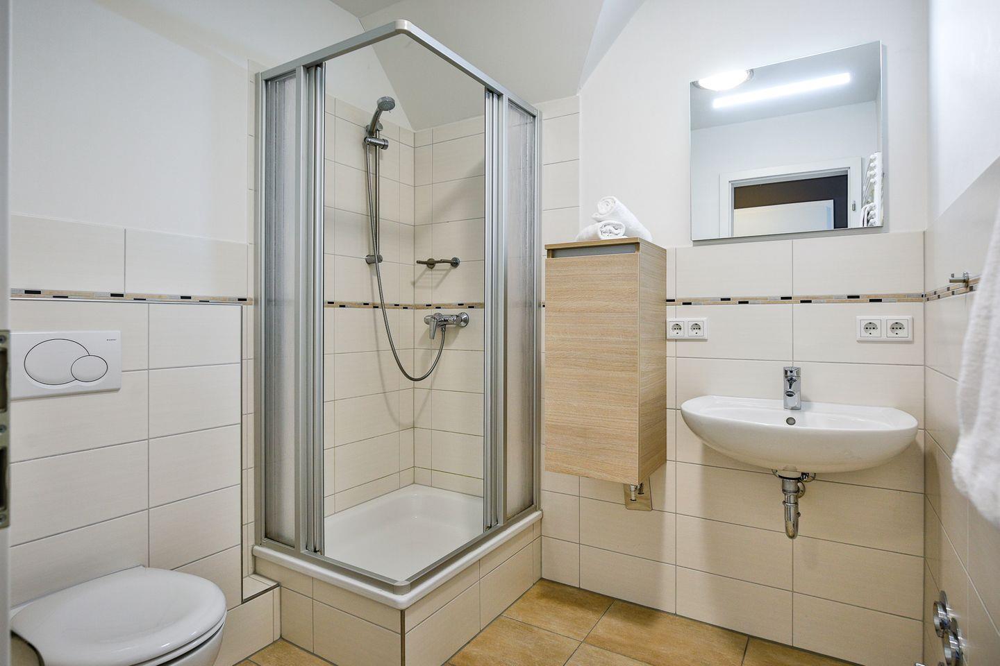 Einbauschränken. Das helle Tageslichtbad verfügt über eine Dusche und Toilette.
