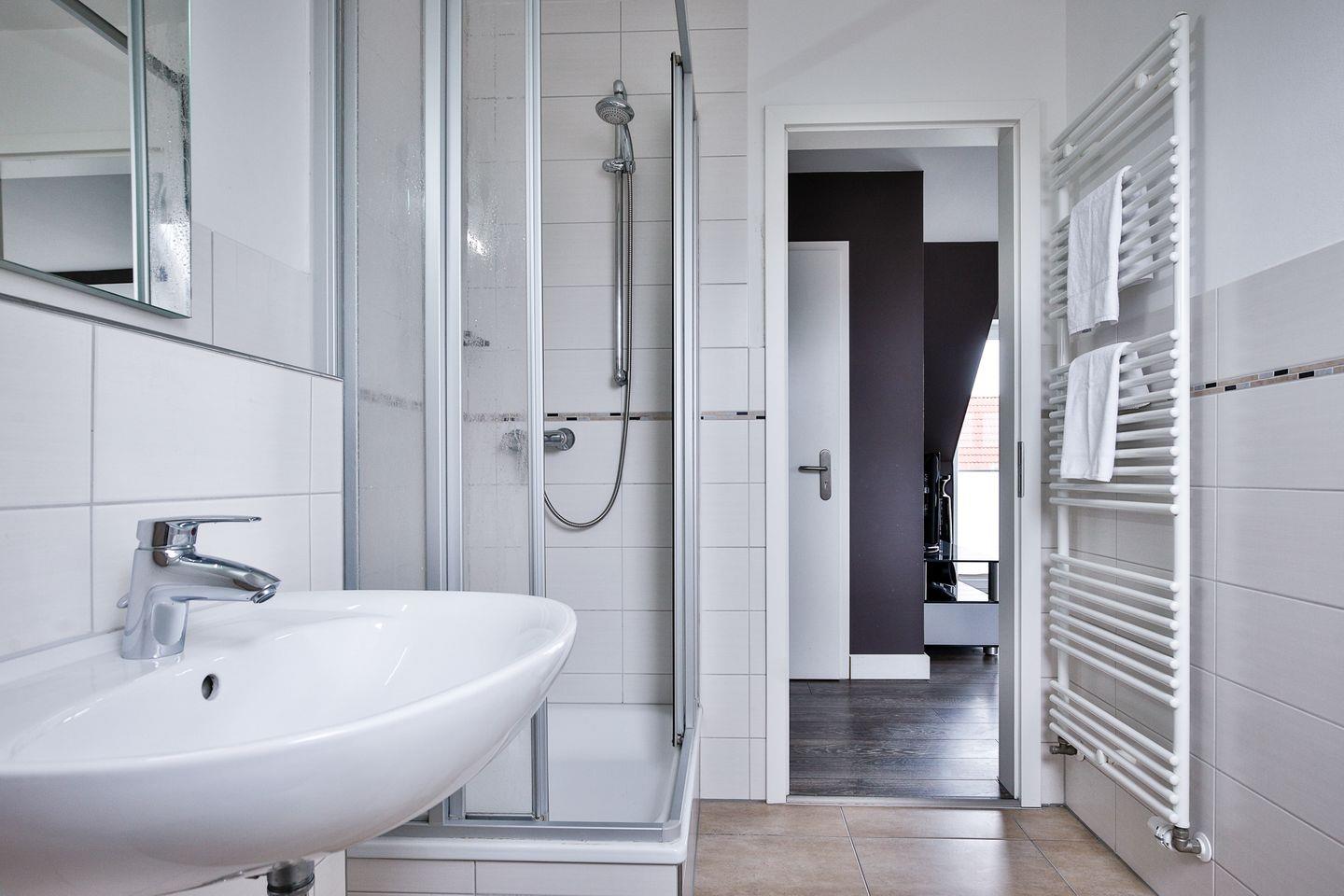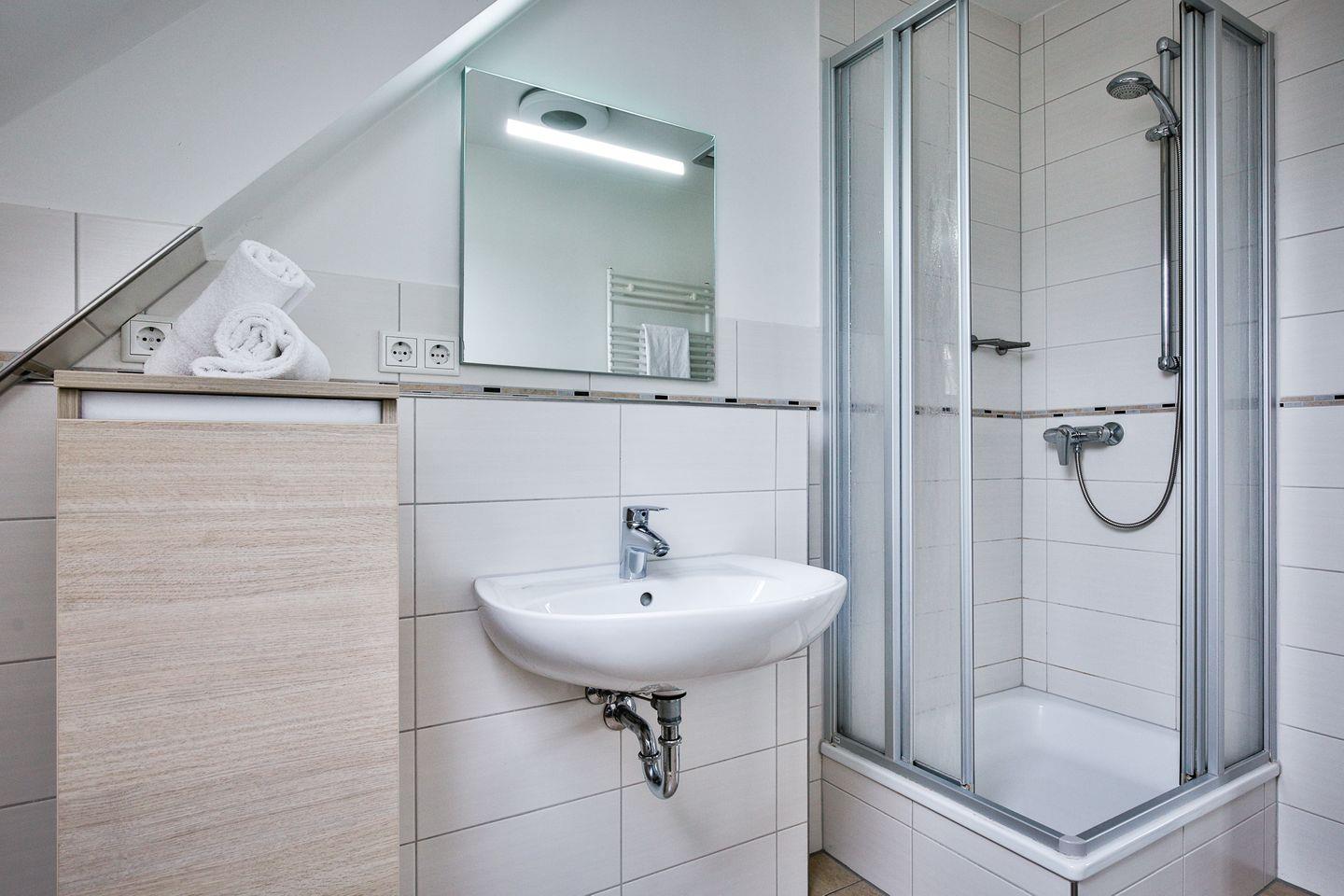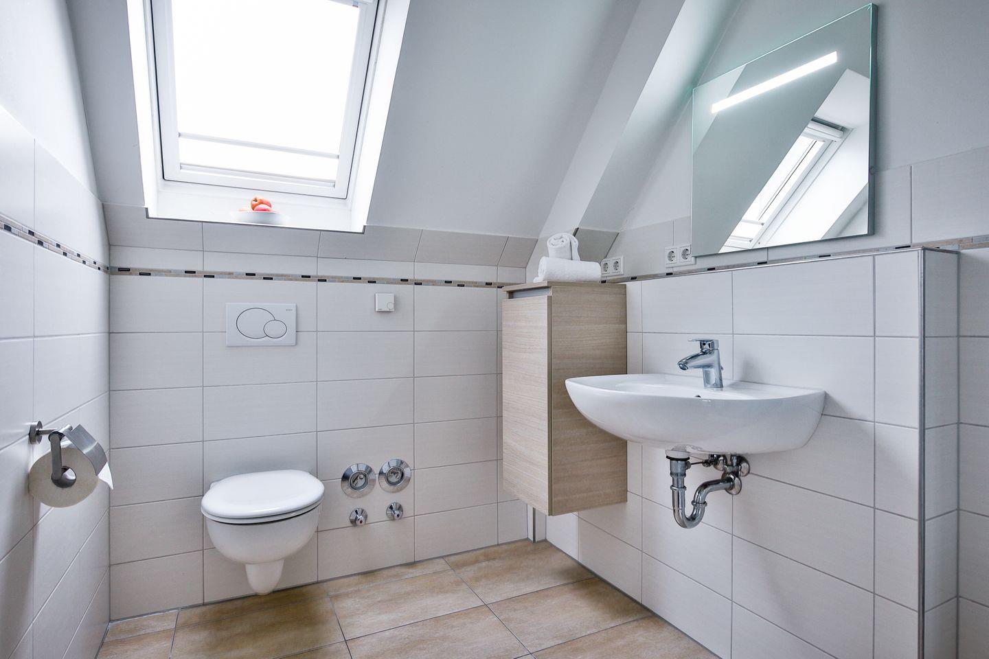 Einbauschränken. Das helle Tageslichtbad verfügt über eine Dusche und Toilette.