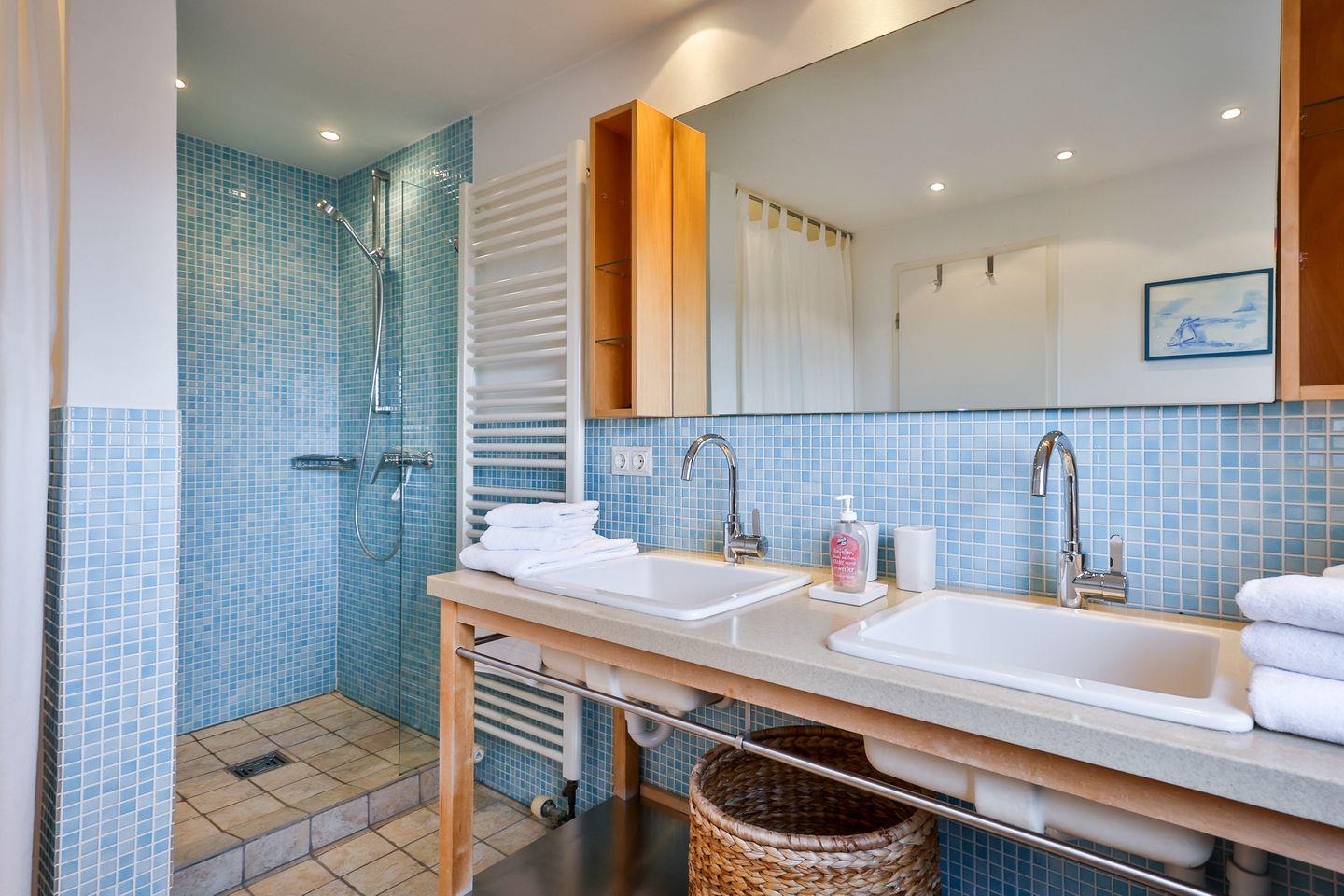 vor, sowie ein Badezimmer mit einem Doppelwaschtisch. Die zweite Ebene besteht