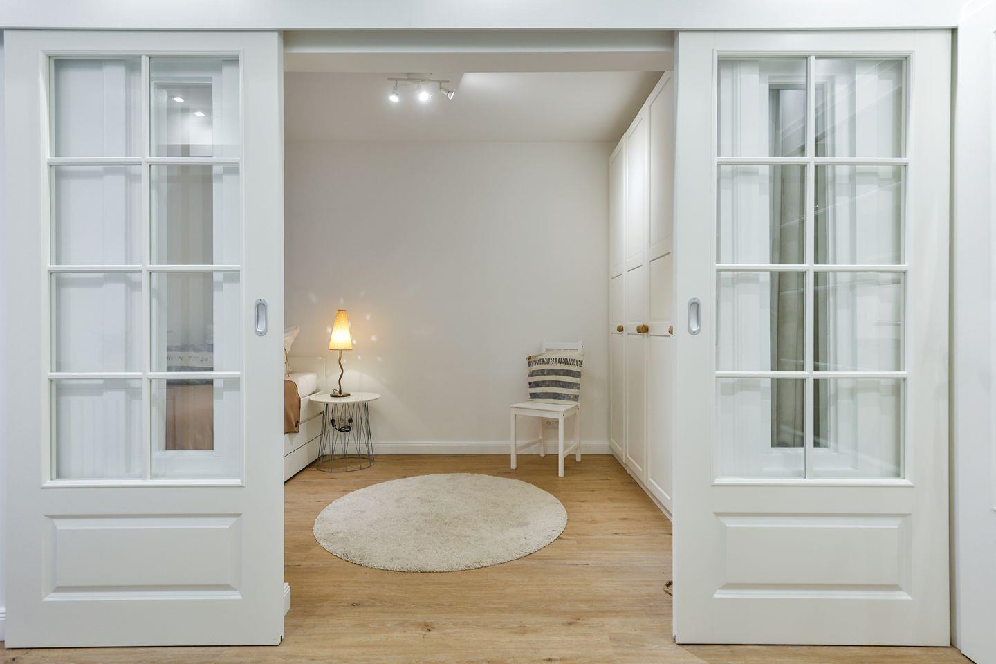 Zwei separate Schlafbereiche, jeweils durch Schiebetüren vom Wohnbereich abgetrennt, integrieren sich stilvoll in das Wohnkonzept und bieten angenehme Rückzugsorte.
