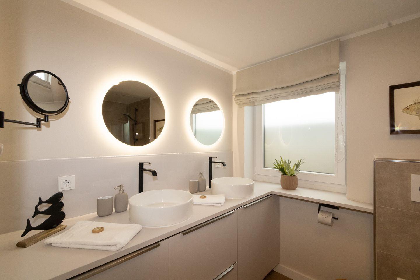 Die Ferienwohnung ist gemütlich eingerichtet und bietet Platz für 4 Personen. Im unteren Bereich der Wohnung finden Sie ein Schlafzimmer und das Duschbad. Das 2. Schlafzimmer befindet sich im oberen Bereich. Angrenzend an den großzügigen Wohnbereich liegt die offene Küche, die modern für den alltäglichen Bedarf eingerichtet ist. Das Schwimmbad und die Sauna können im Nachbarhaus kostenfrei genutzt werden. Ein besonderes Highlight ist die große Terrasse, die zum Südwesten ausgerichtet ist und die viel Platz für einen sommerlichen Essplatz und einen Strandkorb bietet. Hier kann man die absolute Ruhe mit Blick ins Grüne genießen und die Seele baumeln lassen.