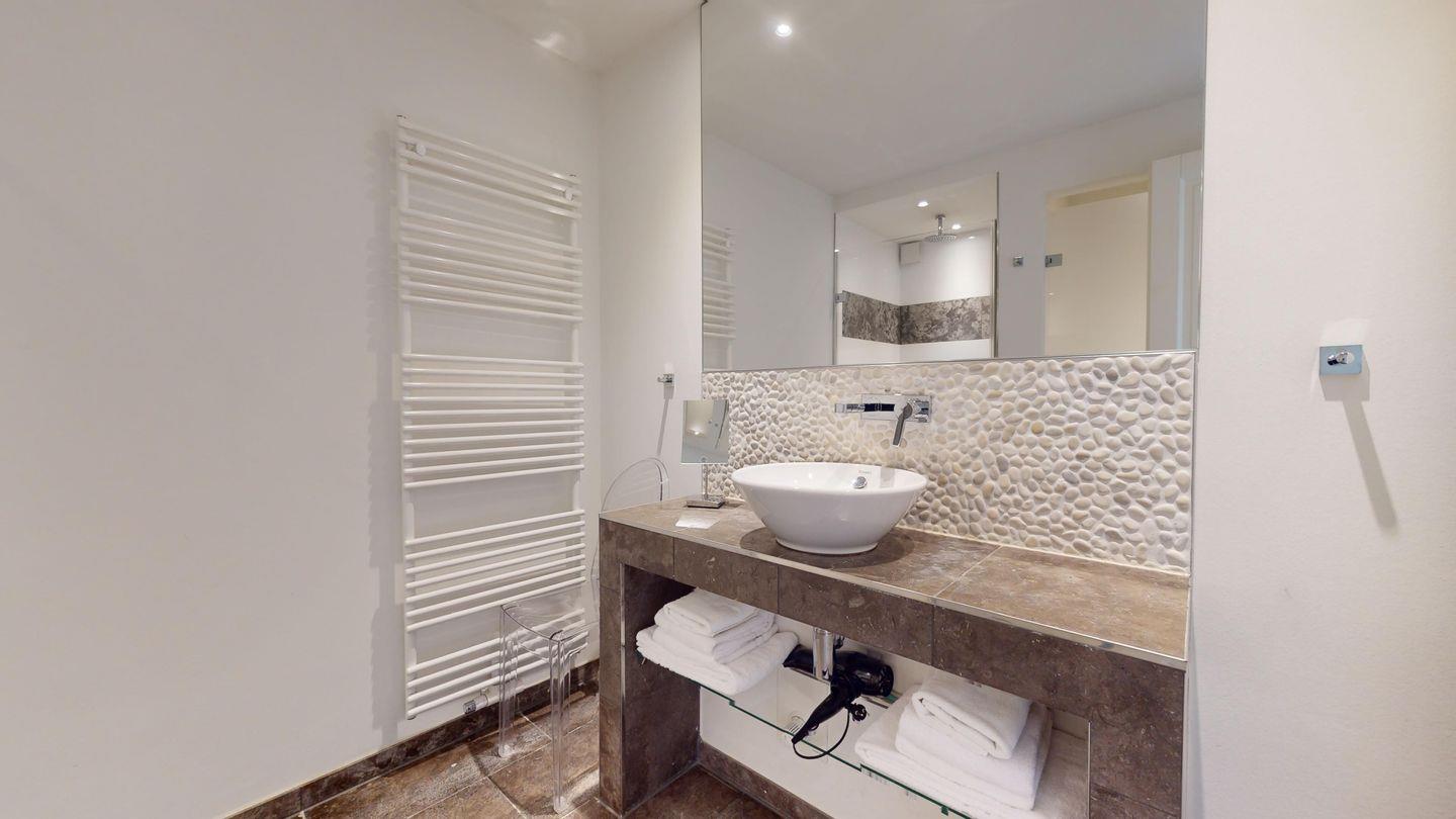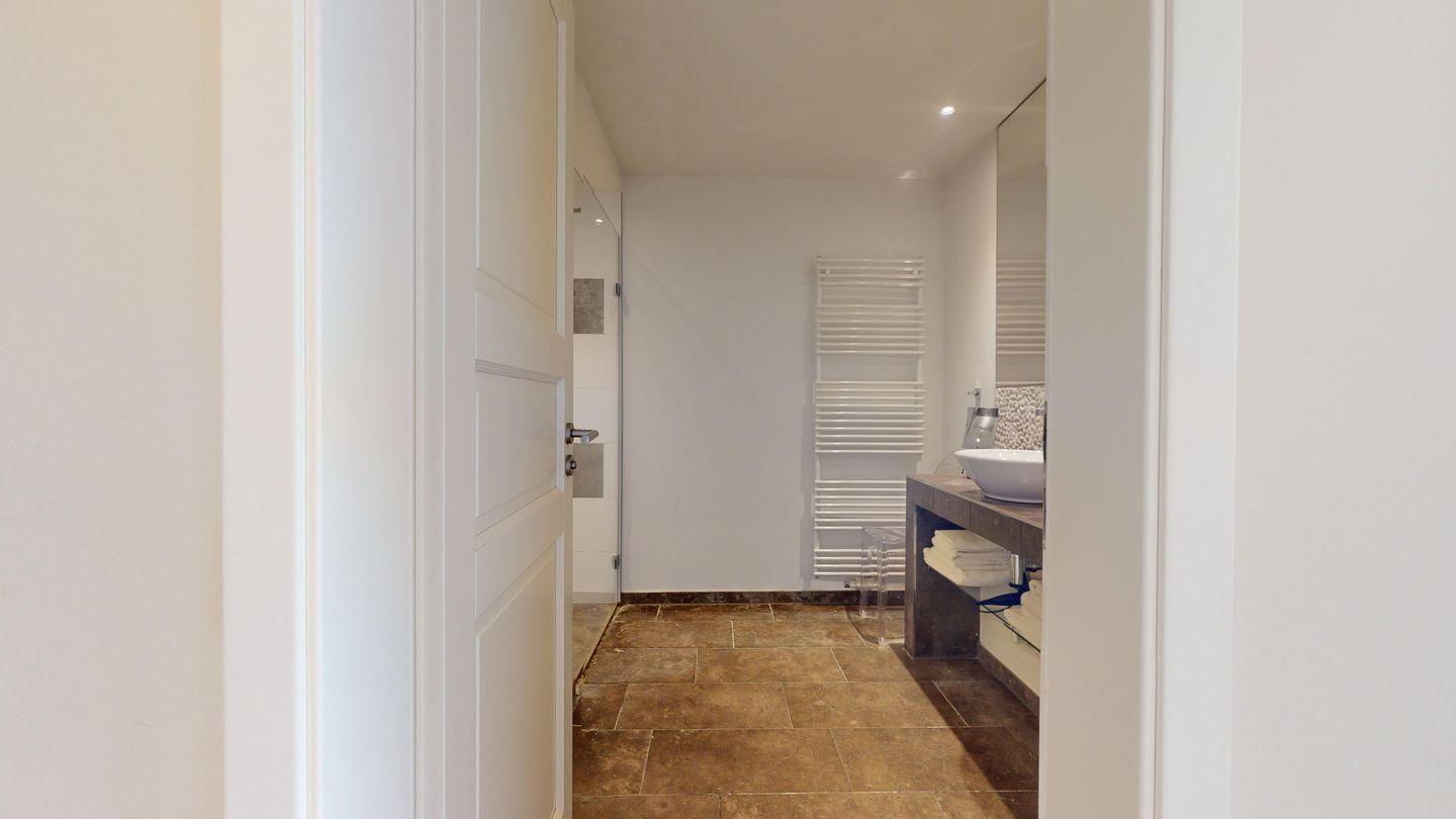 Das Badezimmer ist ein wahrer Ort der Entspannung, ausgestattet mit einer großzügigen Dusche, die Ihnen eine erfrischende Erholung nach einem Tag am Strand bietet. Ein zweites Schlafzimmer mit zwei gemütlichen Einzelbetten und einem begehbaren Kleiderschrank bietet Ihnen und Ihren Gästen ausreichend Platz und Komfort.
