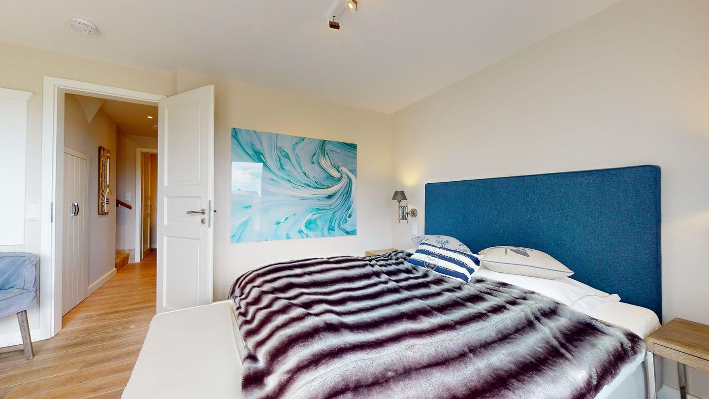 Die Wohnung verfügt über ein geräumiges Schlafzimmer mit einem luxuriösen Doppelbett, das nur darauf wartet, Ihnen erholsame Nächte zu bescheren. Direkt vom Schlafzimmer aus gelangen Sie auf Ihre private Terrasse, auf der ein bequemer Strandkorb auf Sie wartet. Hier können Sie die salzige Meeresbrise genießen, während Sie den Klang der Wellen im Hintergrund vernehmen.