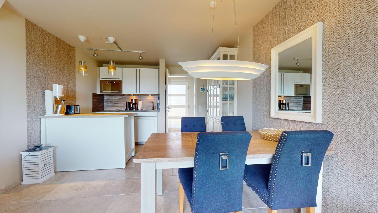 Die offene Küche ist mit allem ausgestattet, was Sie benötigen, um köstliche Mahlzeiten zuzubereiten. Die hochwertigen Geräte und die stilvolle Einrichtung schaffen eine inspirierende Atmosphäre für Ihre kulinarischen Abenteuer. Der Wohn- und Essbereich ist einladend gestaltet und öffnet sich zu einem eigenen Balkon. Hier können Sie Ihre Mahlzeiten genießen oder einfach nur entspannen, während Sie den Blick über das Dünental zum Golfplatz Budersand und zu den Inseln Föhr und Amrum schweifen lassen können.