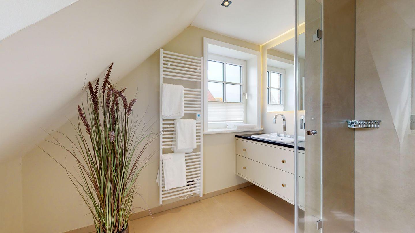 Das moderne Badezimmer ist mit einer Regendusche ausgestattet und verfügt über Tageslicht, das eine angenehme Atmosphäre schafft.
