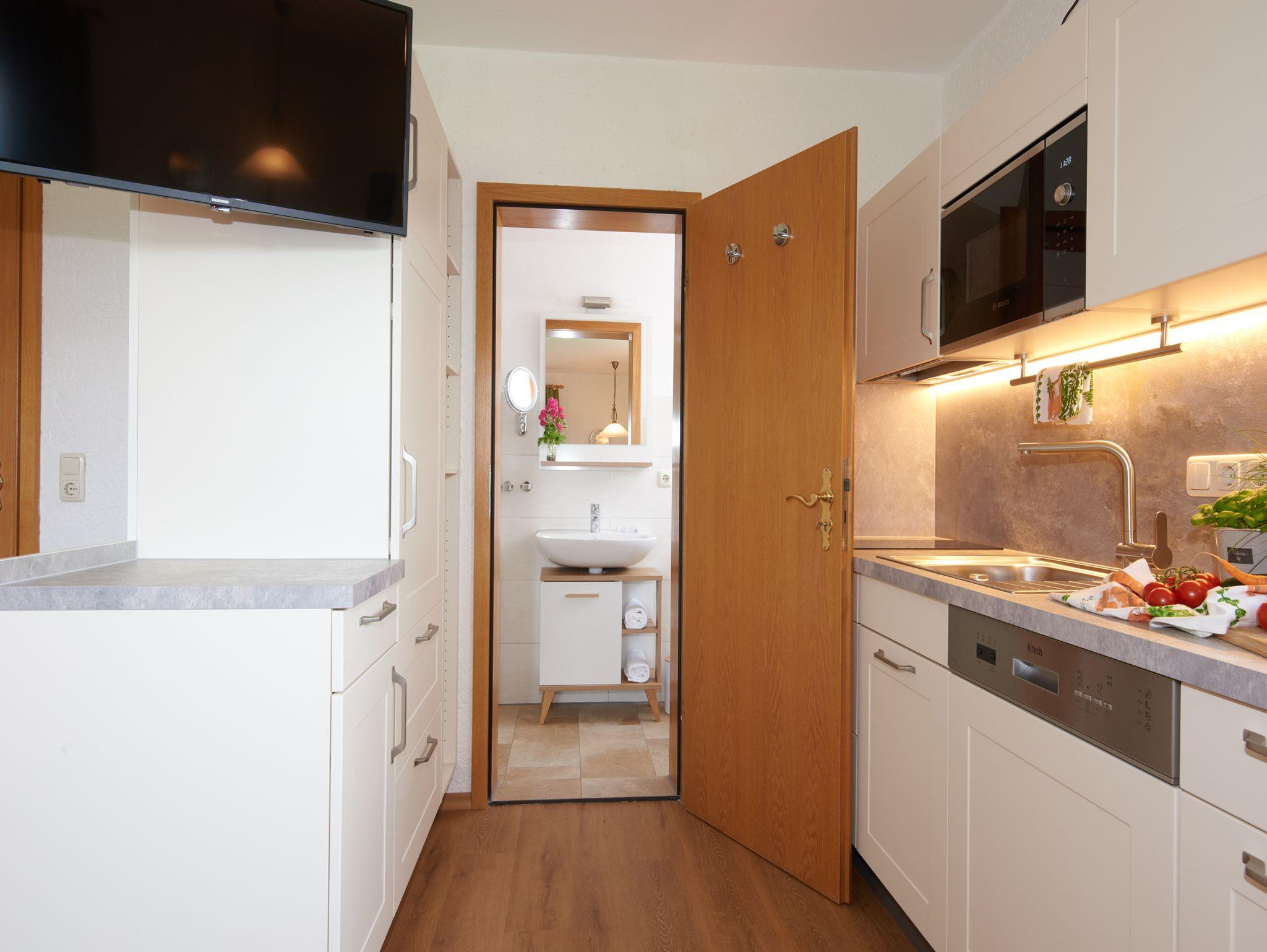 Das 2021 liebevoll renovierte Appartement Apfelblüte, liegt im 1. Stock unseres Hauses. Im Wohnschlafraum befinden sich neben einem Doppelbett mit BS-Matratzen, Schrank, eine gemütliche Essecke, Verdunkler, SAT-TV und ein CD-Player. Eine gutausgestattete Küche mit Spülmaschine, Cerankochfeld, Mikrowelle und einem Kühlschrank mit Gefrierfach ist ebenfalls im Wohnschlafraum. Auf dem großzügigen Südbalkon mit Berg- und Panoramablick können Sie die Sonne genießen. Das Bad mit Fenster ist mit Dusche, WC, Handtuchtrockner, Kosmetikspiegel und Fön eingerichtet.