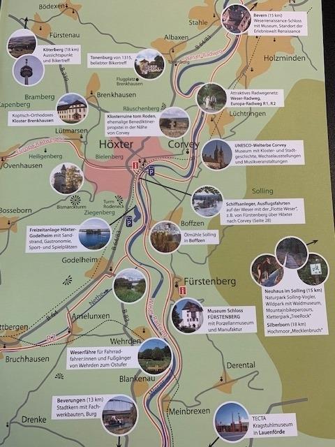 Der Fahrradweg liegt direkt vor der Tür - die Weser in unmittelbarer, fußläufiger Entfernung ebenso wie das Weltkulturerbe ,Schloss Corvey' und die Stadt hat vieles zu bieten - Schwimmbäder, das Jacob-Pins-Museum (um nur einiges zu nennen) viel Natur im Weserbergland zum Durchatmen und Seele baumeln lassen.