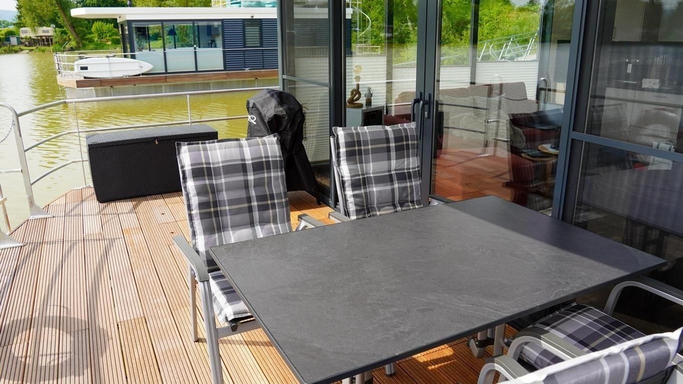 Aus dem Wohn- und Essbereich gelangen Sie auf die Terrasse. Hier können Sie Ihre Mahlzeiten genießen. Erleben Sie das Gefühl von Freiheit auf dem Wasser!