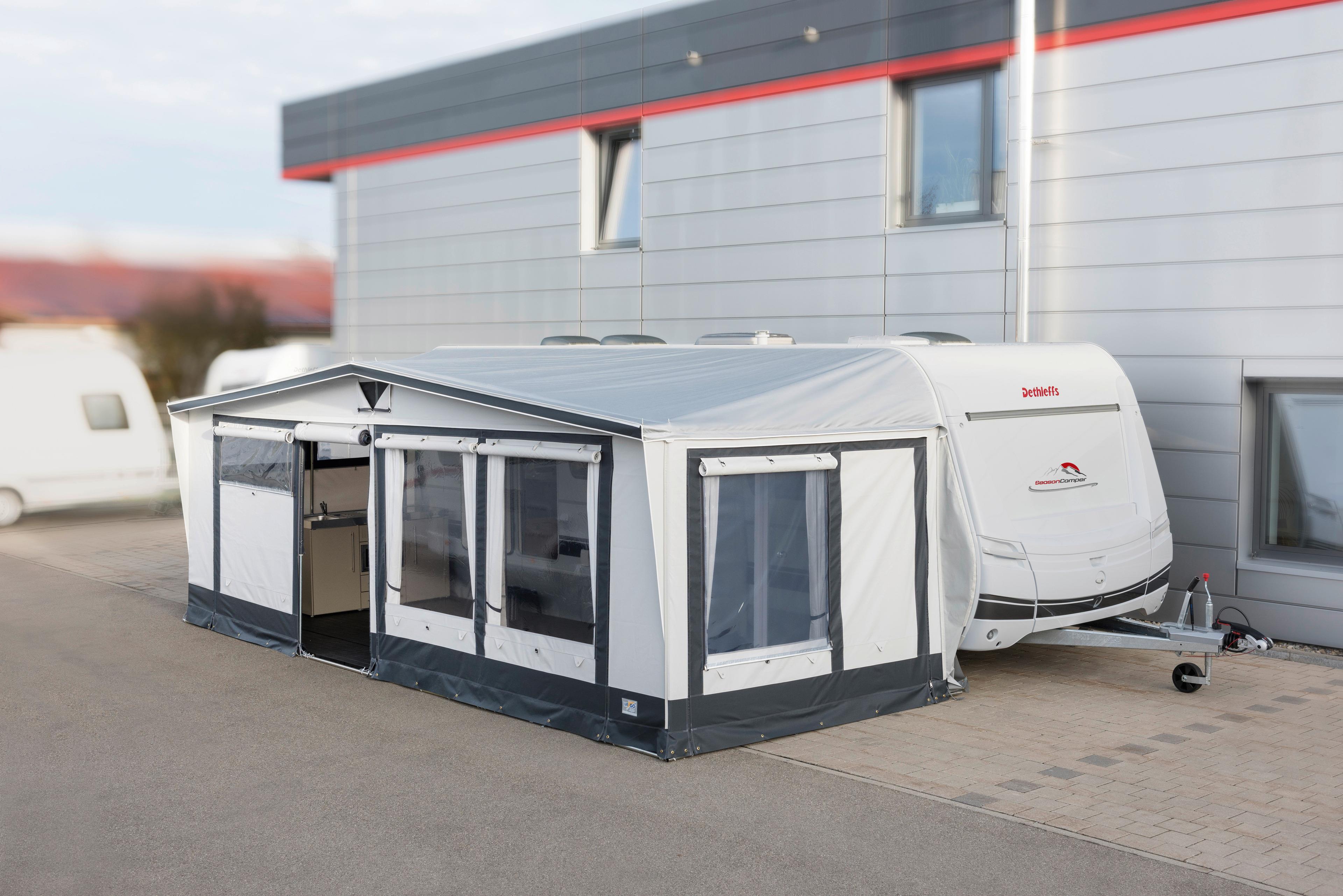 Küchenzeile mit Spüle & Küchenschränken, Kochfeld, Kühlschrank, Kaffeemaschine, Wasserkocher, Toaster, Besteck, Geschirr, Bettwäsche, TV, Heizung, Dusche im Vorzelt, Toilette im Wohnwagen, Tisch & Stühle
