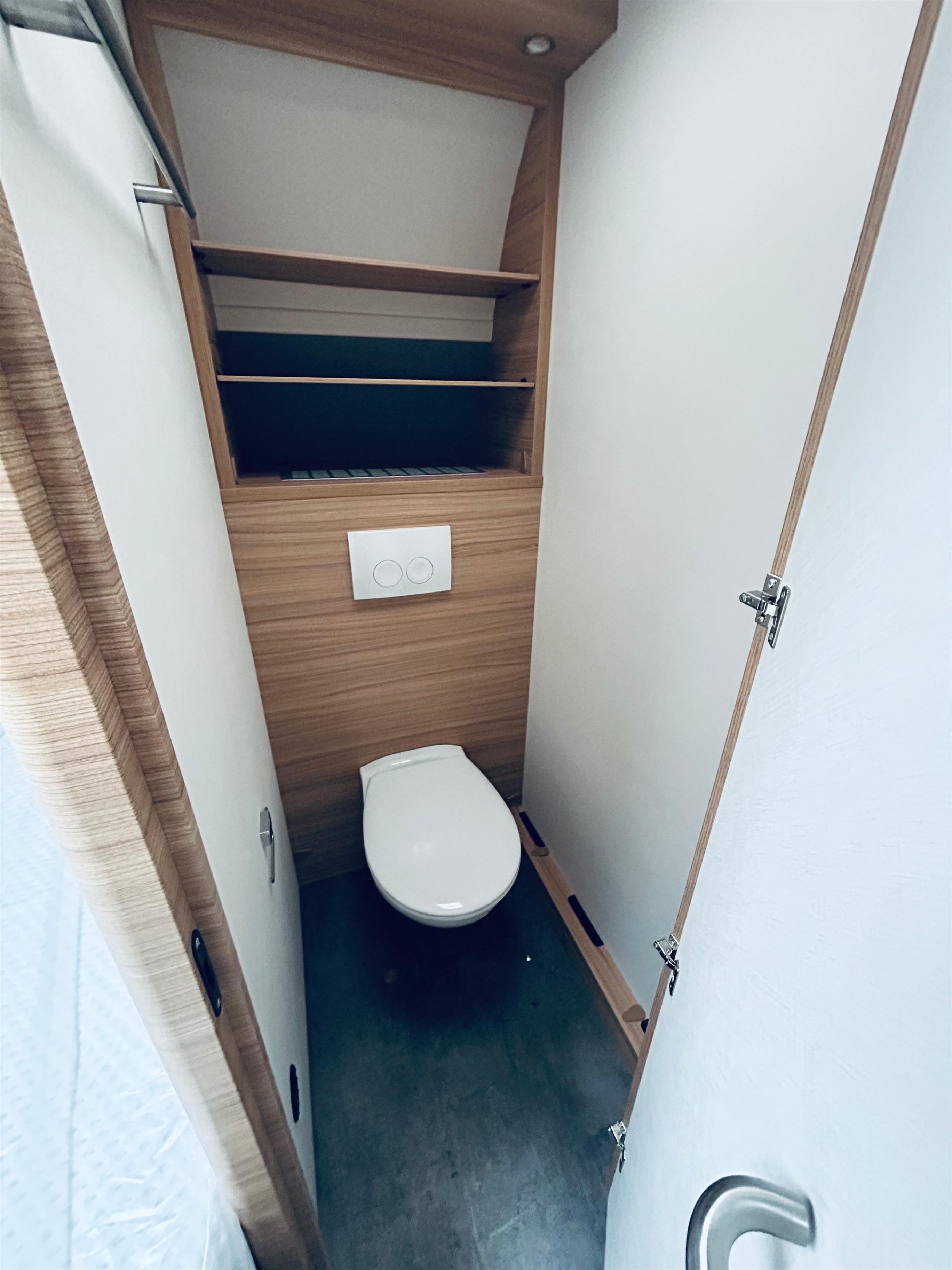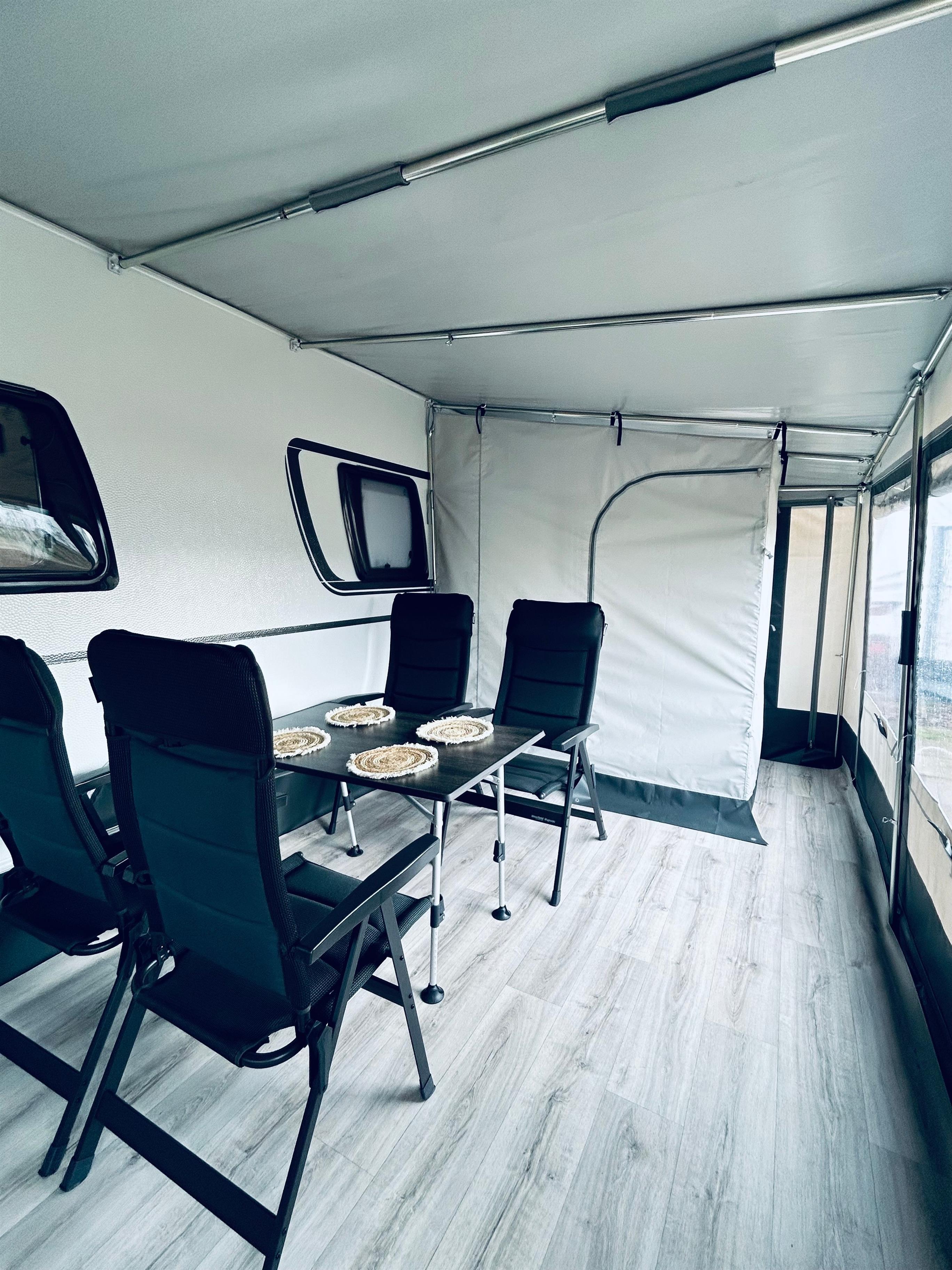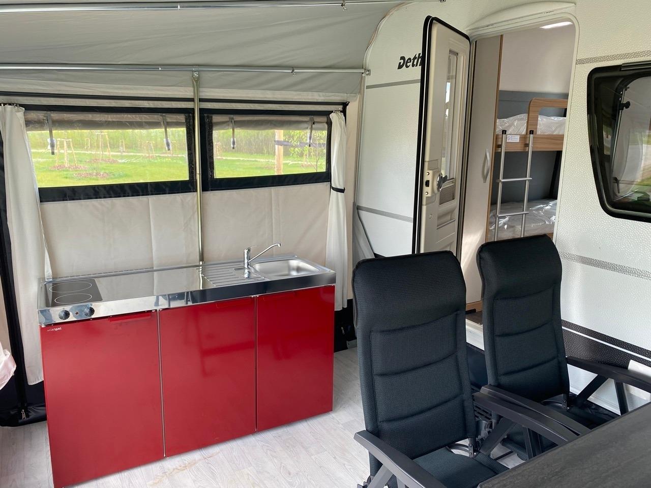 Küchenzeile mit Spüle & Küchenschränken, Kochfeld, Kühlschrank, Kaffeemaschine, Wasserkocher, Toaster, Besteck, Geschirr, Bettwäsche, TV, Heizung, Dusche im Vorzelt, Toilette im Wohnwagen, Tisch & Stühle
