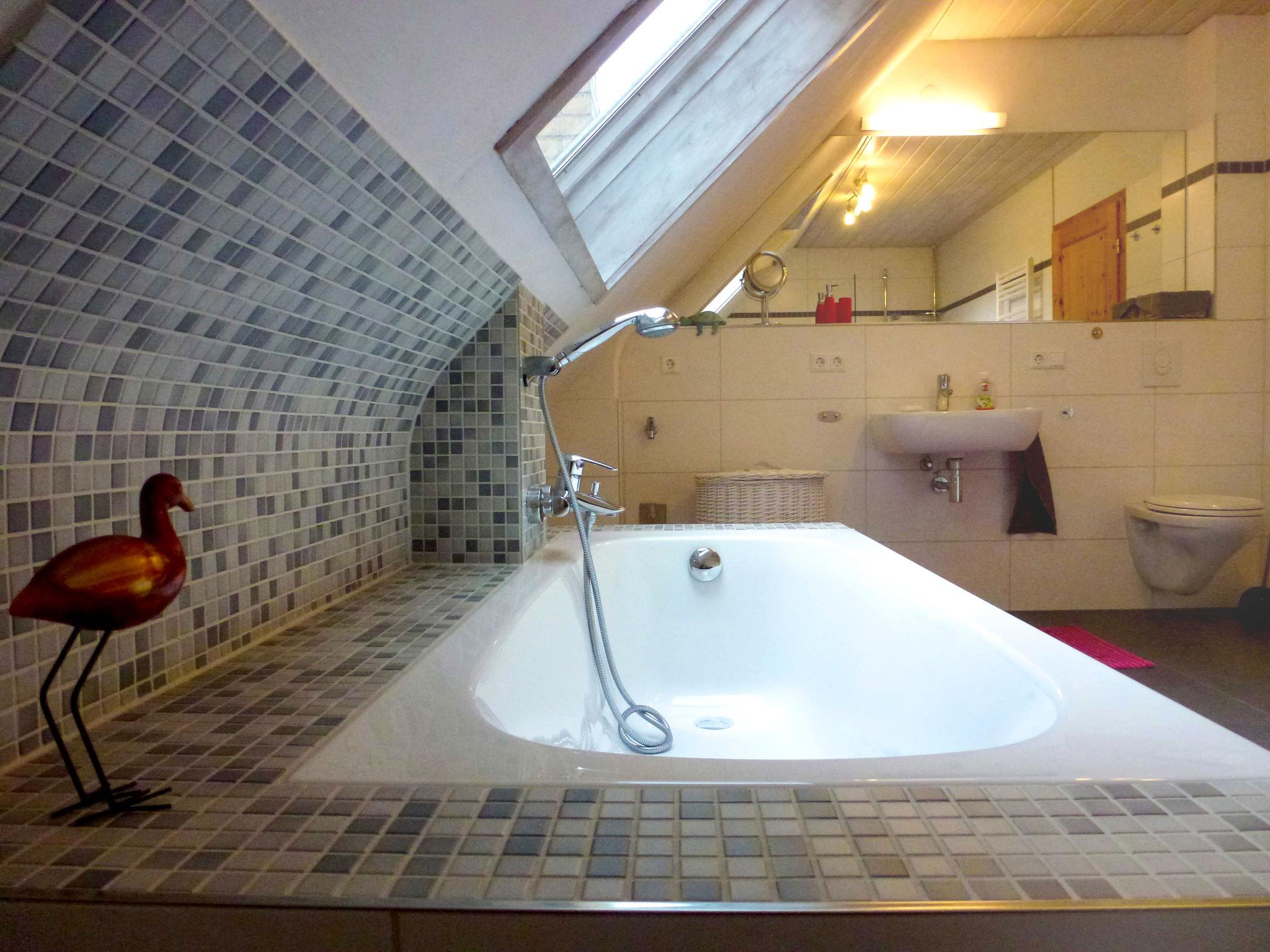 3-room semi-detached house 130 m2 on 2 levels, on the ground floor. Object suitable for 4 adults + 2 children. Stylish and cosy furnishings: living/dining room 38 m2 with Scandinavian wood stove and satellite TV (flat screen). Exit to the terrace. Large, open kitchen 15 m2 (oven, dishwasher, 4 ceramic glass hob hotplates, microwave, freezer, electric coffee machine). Sep. WC. Upper floor: walk-through room 22 m2, with sloping ceilings with 1 double bed (120 cm, length 200 cm), 2 sleeping facilities (180 cm, length 200 cm). 1 room 16 m2, with sloping ceilings with 1 double bed (180 cm, length 200 cm). Bath/shower/WC. Large terrace 20 m2, small patio 6 m2. Terrace furniture, barbecue (portable), deck chairs (2), box-room. Facilities: iron, children's high chair, hair dryer. Internet (WiFi, free). Please note: non-smoking house. Maximum 2 pets/ dogs allowed. Smoke alarm. Water bed available (2 sleeping possibilities in the walk-through room). Entrance area (12 m2) with office furniture and access to the upper floor. As an alternative to the walk-through room with 4 beds there is a double sofa bed (160 cm, length 200 cm) in the living / dining room.