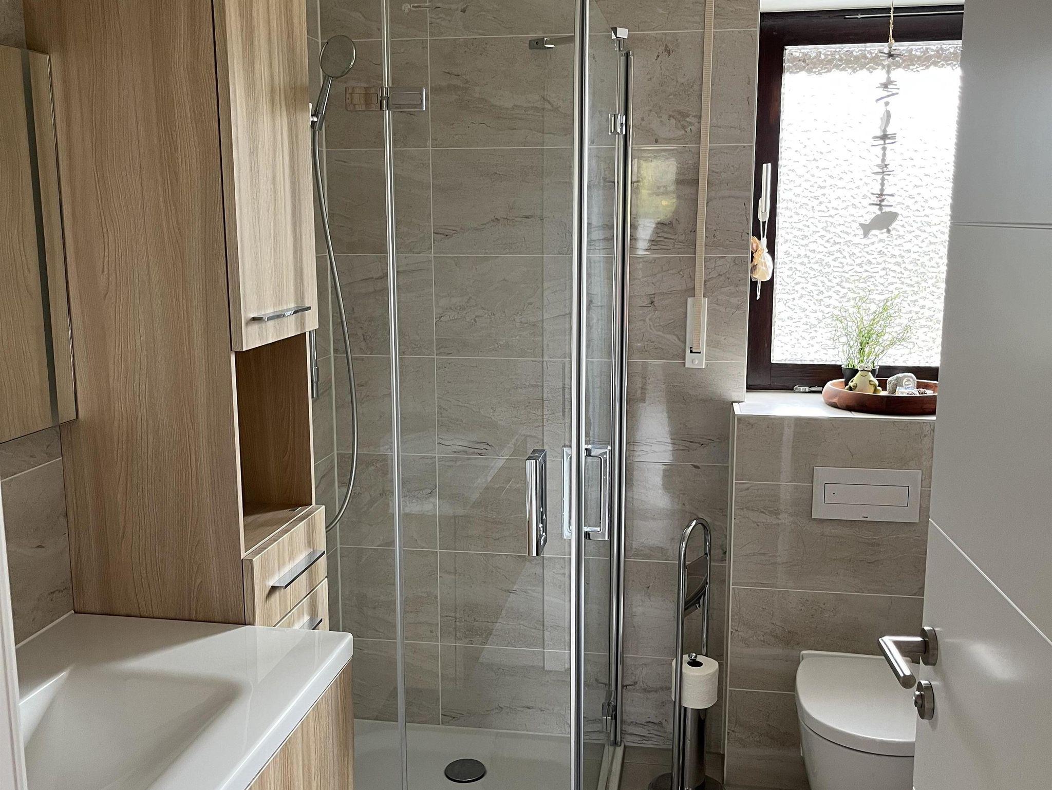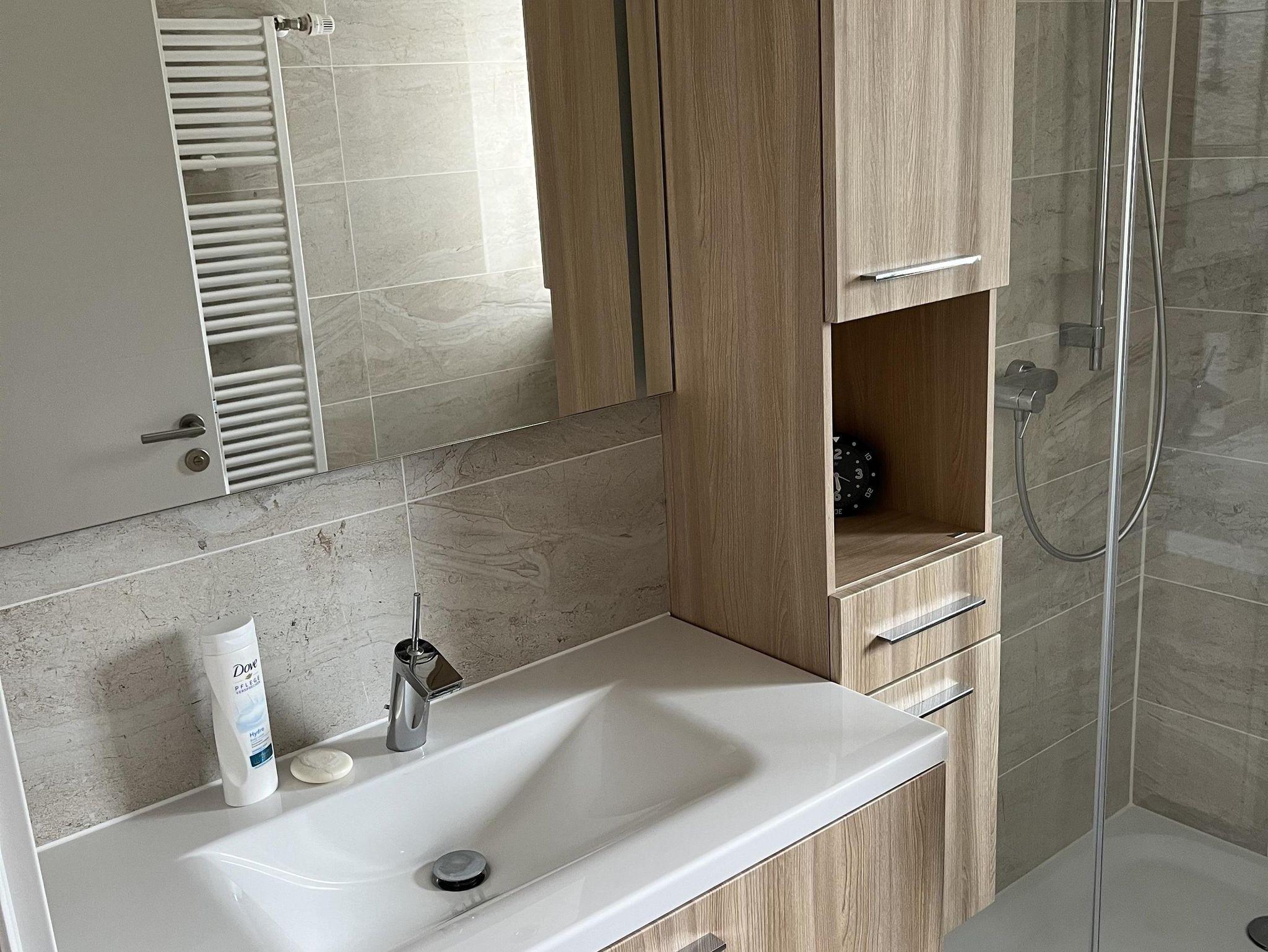 Das Badezimmer ist mit einer begehbare Dusche, WC, Waschbecken, Handtuch-Heizkörper, Spiegel und Fön ausgestattet.