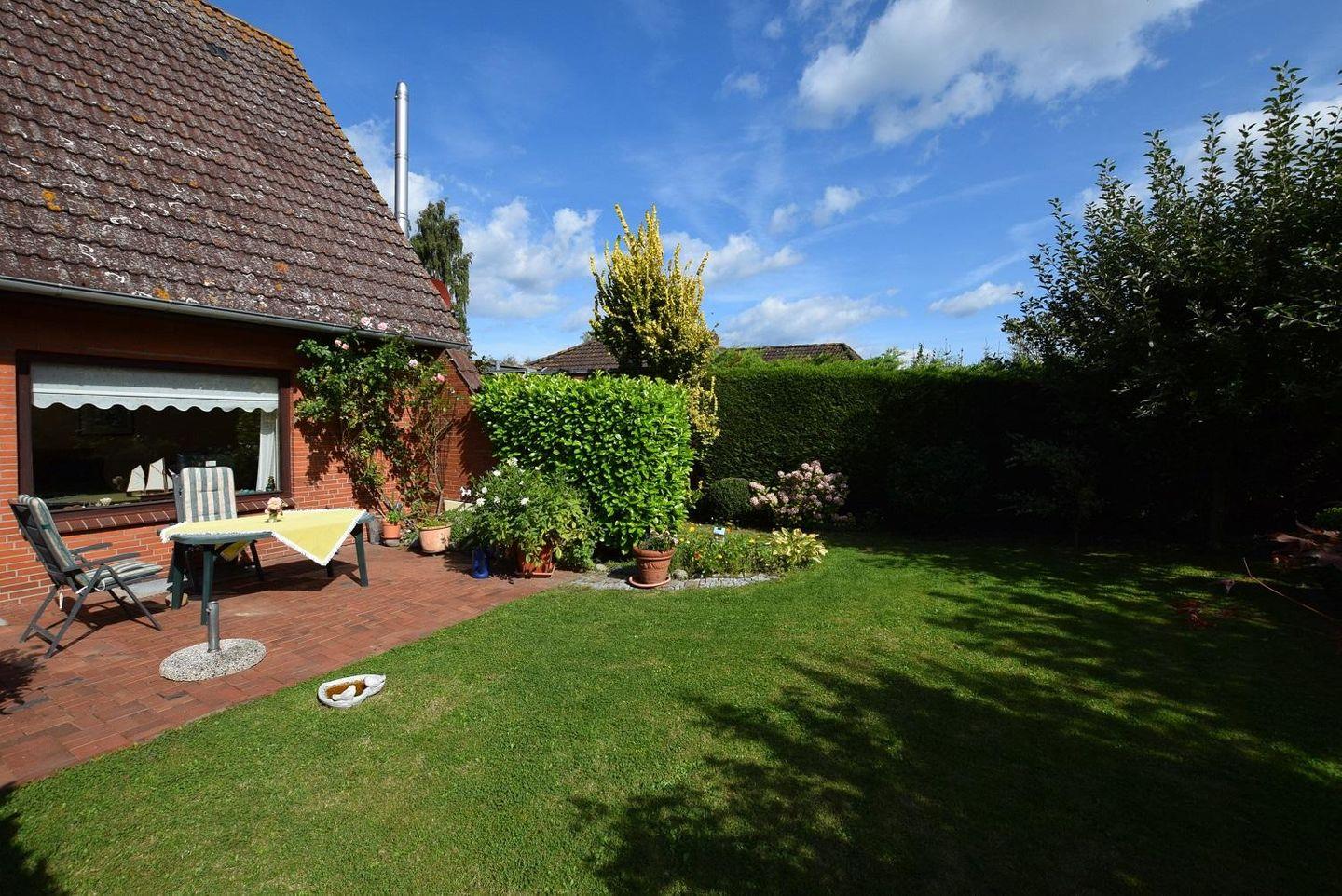Vom Wohnzimmer erreichen Sie die große Terrasse mit Blick in den Garten - kein Seeblick.