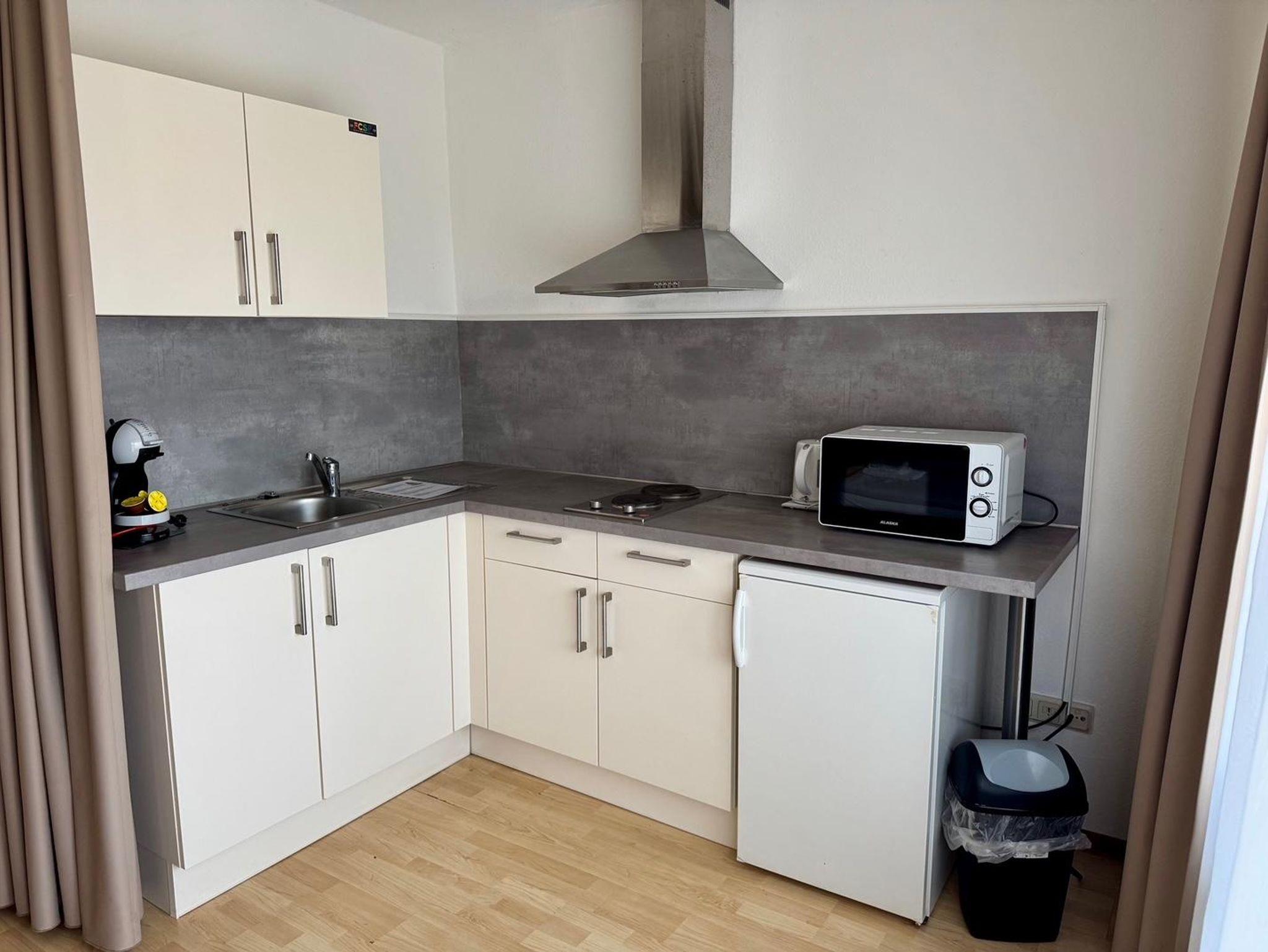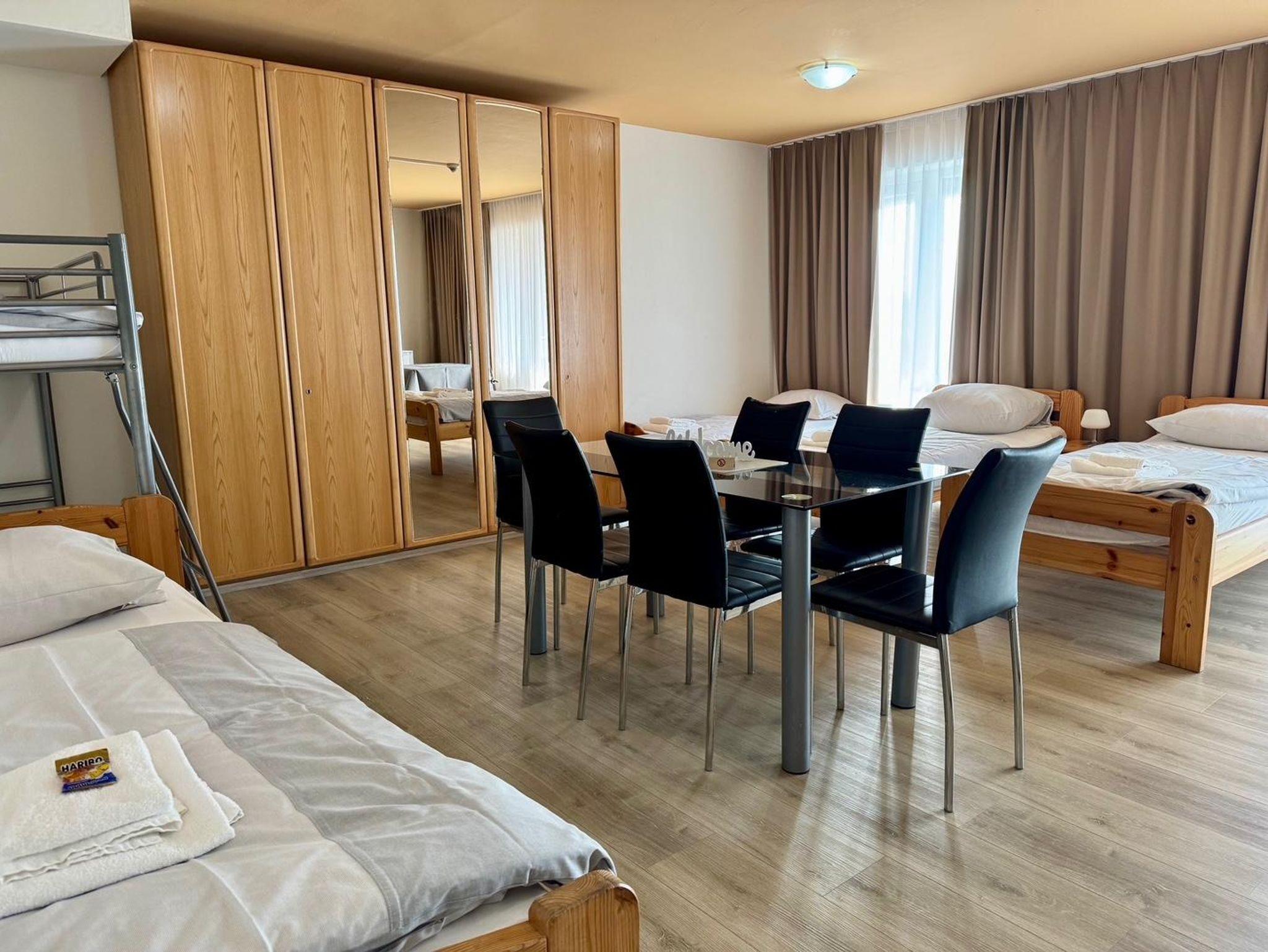 Unsere Mehrbettzimmer befinden sich im 2. OG und sind mit Dusche/WC, Handtücher, Kaffeemaschine, TV, Balkon und Miniküche ausgestattet. Kostenloses WLAN. Das Zimmer kann mit 4 - 6 Personen belegt werden.