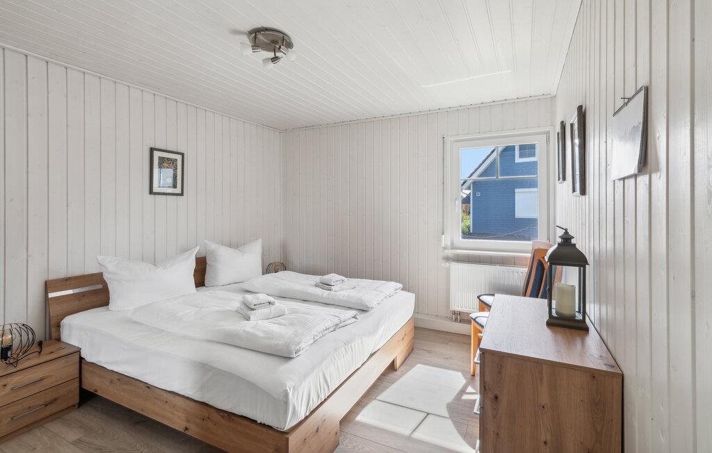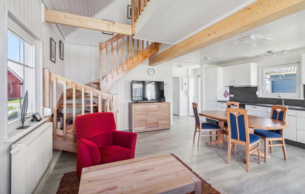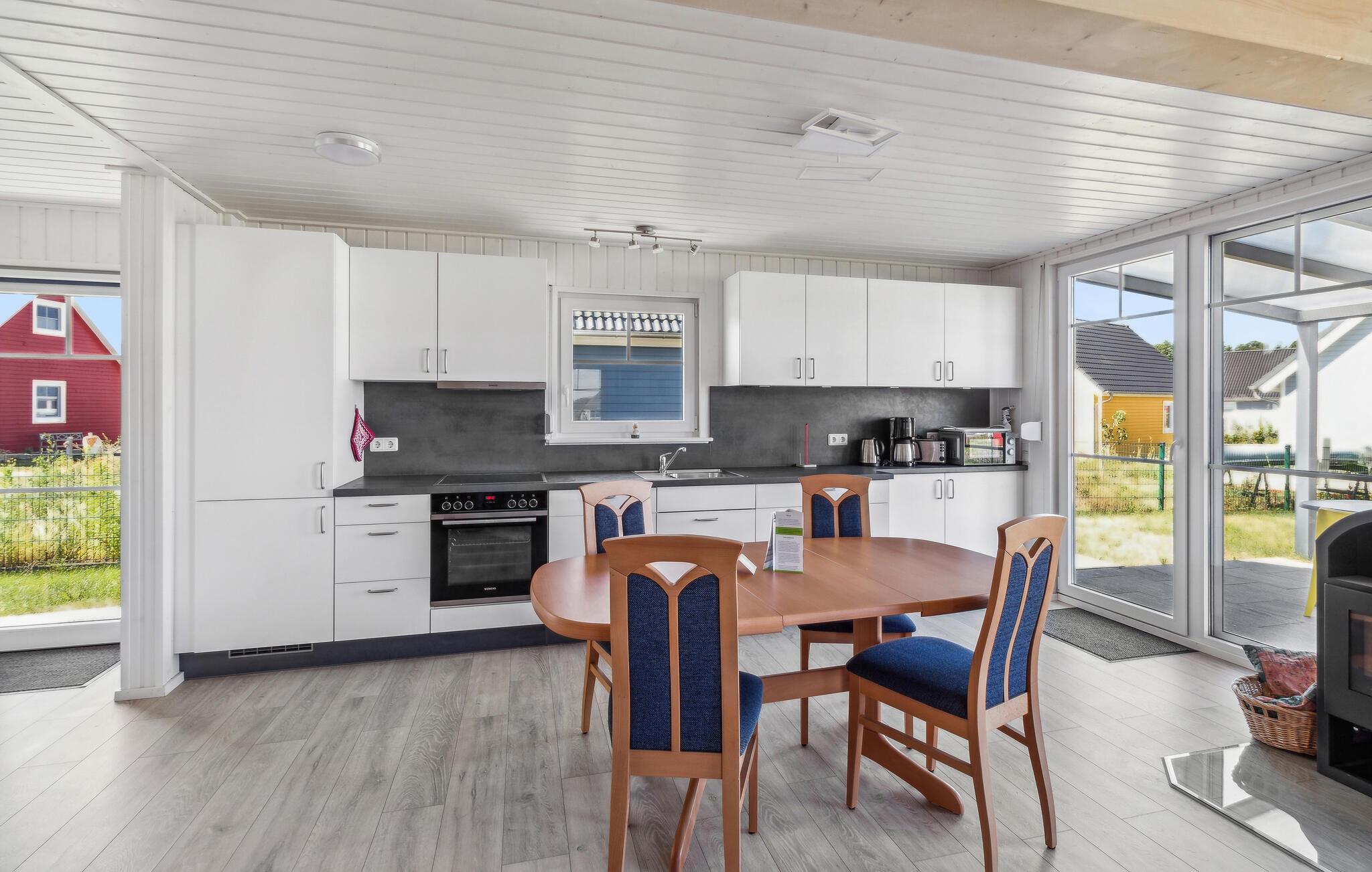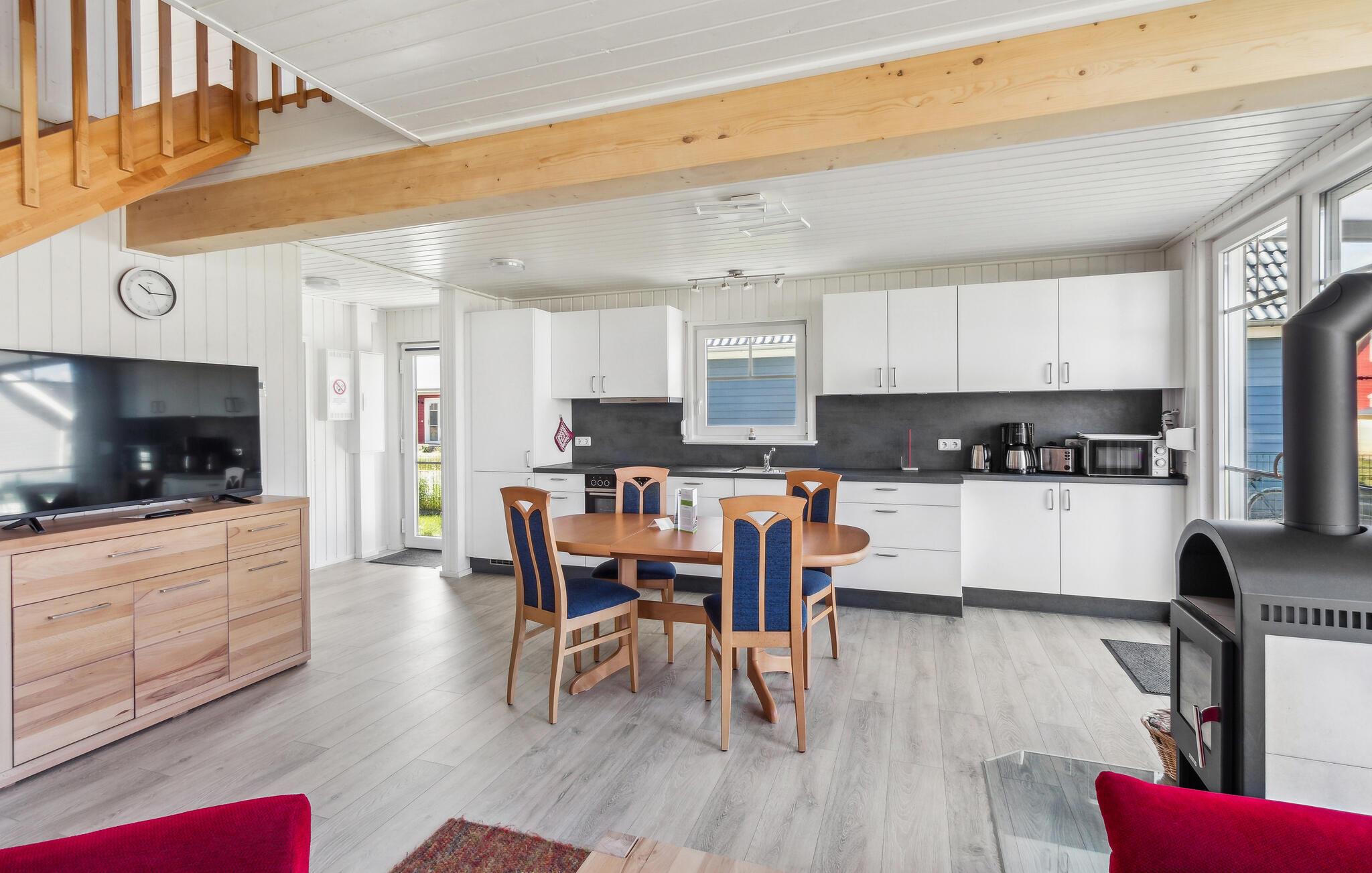 Det hyggelige og smagfuldt indrettede træferiehus ligger tæt ved vandet og byder på en vidunderlig udsigt over landskabet. Gennem de enorme panoramavinduer, der strækker sig fra gulv til tag, falder udsigten over det fortryllende landskab igen og igen og alle vegne fra. På alle tider af året kan I finde jer tilpas efter lange dage i naturen i den hyggelige stue i stueetagen. Når temperaturen falder, er der ikke noget hyggeligere end at læse en bog foran den brusende pejs eller lave mad og spille brætspil med familien.