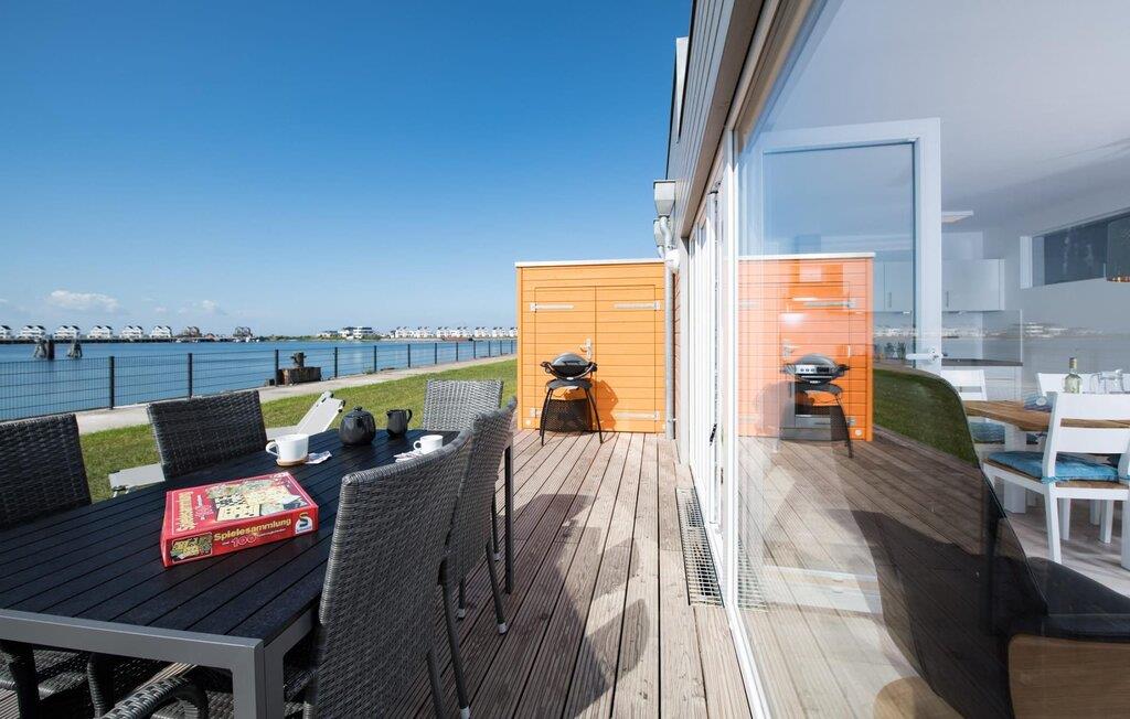 Fantastisk udsigt åbner op fra opholdsstuen og på den tilstødende terrasse med udsigt over lystbådehavnen. Havnebiografen sørger for underholdning under en hyggelig grillaften med Weber el-grill eller en romantisk middag i levende lys med en uforglemmelig solnedgang.