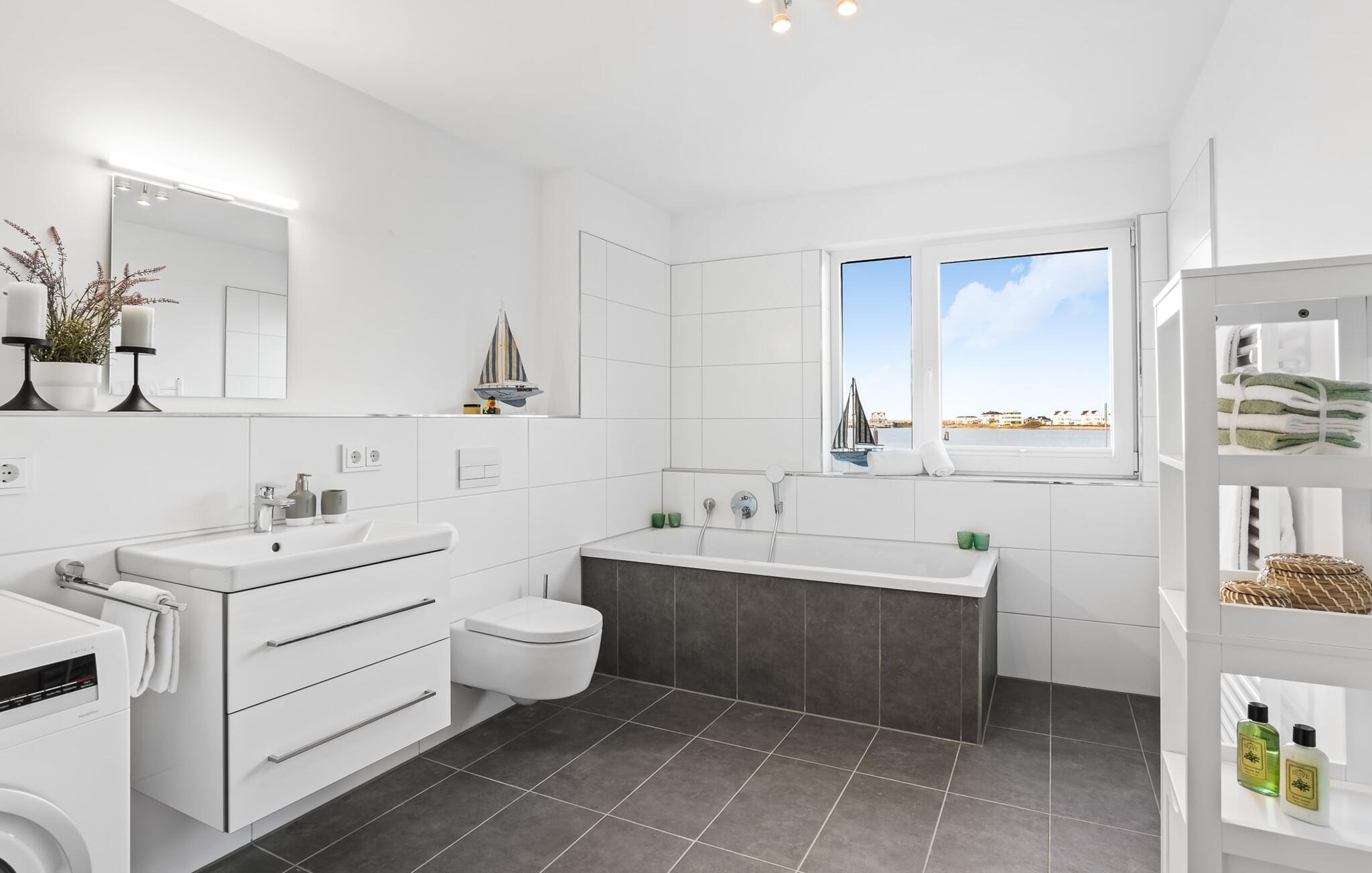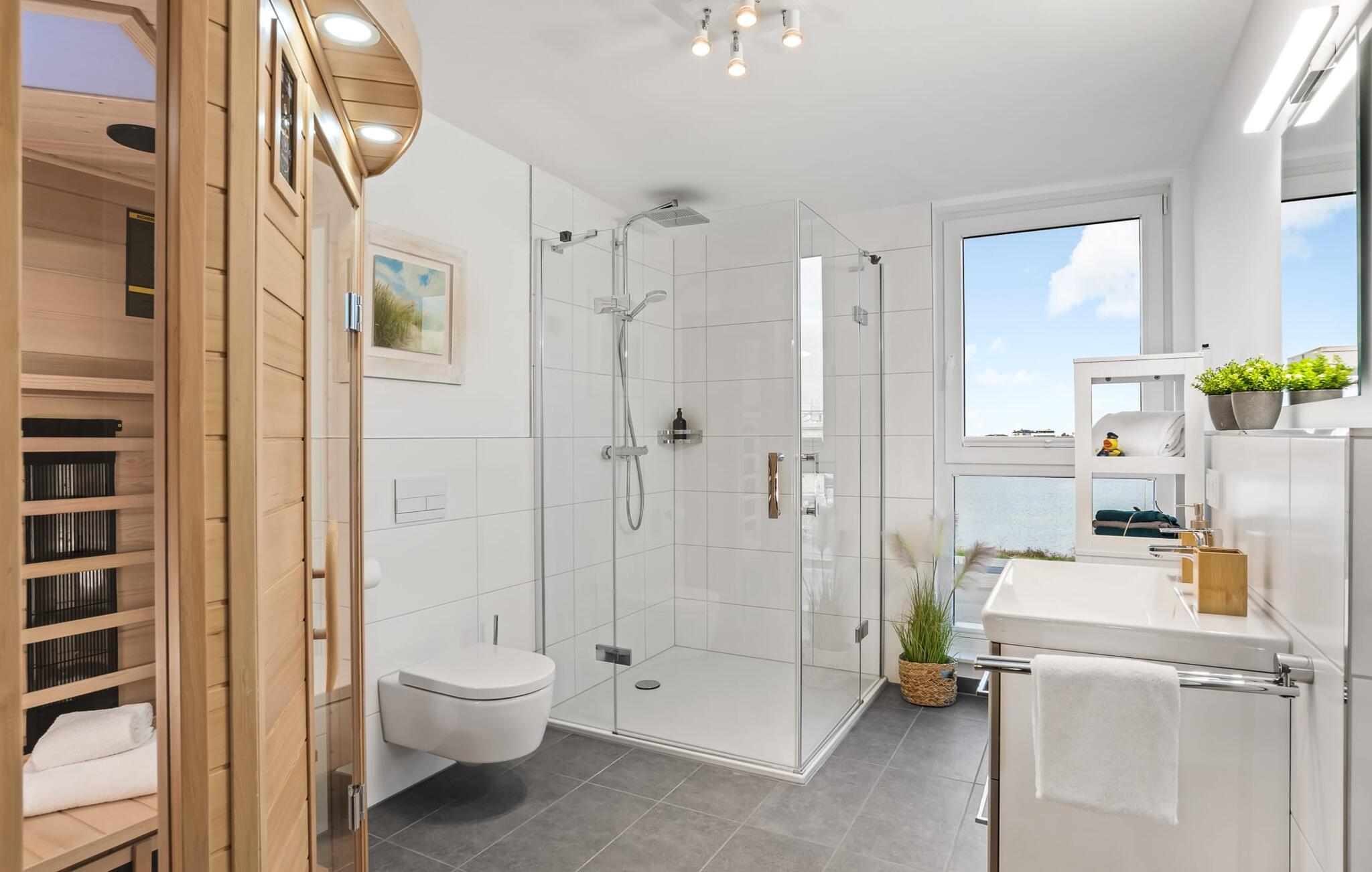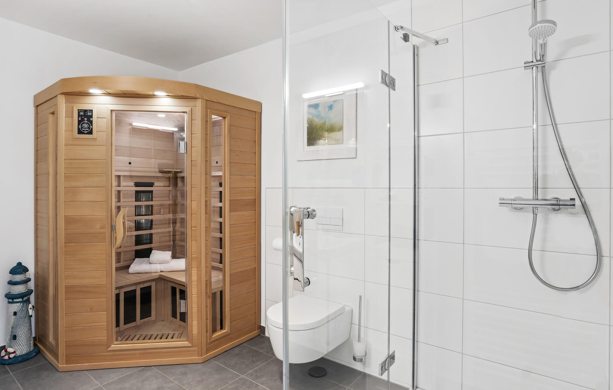HAFENOASE er en rummelig og rummelig maisonette ferielejlighed på første og anden sal. Havnepromenaden i OstseeResort Olpenitz med dets voksende udbud og indkøbsmuligheder samt sejl- og sportsbådshavnen i OstseeResort Olpenitz kan nås til fods. Den maritime minigolfbane ligger i umiddelbar nærhed og byder på sjov for hele familien. Et særligt kendetegn er, at HAFENOASE er placeret i første række til havnen. Den uhindrede udsigt over havnen er derfor et særligt højdepunkt på HAFENOASE. Når I træder ind i ferielejligheden på første sal, begynder nedbremsningen fra allerførste øjeblik. I er direkte i lejlighedens afslapningsområde. Lejlighedens tre soveværelser er placeret på denne etage. Uanset hvilket soveværelse I vælger, kan I være sikker på en afslappende søvn. To soveværelser er hver udstyret med en dobbeltseng og et fjernsyn til alternativ underholdning. Det tredje soveværelse er indrettet med to enkeltsenge og et fjernsyn. I opholdsområdet kan opholdsområdet omdannes til to mere komfortable sovepladser med blot et par enkle trin. Der er også et veludstyret badeværelse med badekar på denne etage. En gang på anden sal lever HAFENOASE op til sit navn. Her bliver I budt velkommen af gulv-til-loft vinduesfronten med den tilstødende terrasse. At komme ind og straks føle sig hjemme er én ting. At slappe af i den hyggelige opholdsstue, nyde naturens fred og ro ud af vinduet eller se tv er ren afslapning og rekreation! Hverdagen bliver mere og mere fjern... Skulle vejret nogensinde blive nordisk, vil pejsen med sin brølende ild give yderligere hygge. Det integrerede køkken er perfekt udstyret, og det er sjovt at lave mad sammen. Så nyd de færdige lækkerier på terrassen eller start en hyggelig grillaften. I kommer direkte ind på den store sydvestvendte terrasse fra opholdsstuen. Her kan I tilbringe mange afslappende timer med heldagssol. Et andet komplet badeværelse med bruser på gulvniveau og infrarød sauna runder den komplette pakke af til en afslappende ferie. I finder jeres egen parkeringsplads foran ferielejligheden. Vores foretrukne sted: at tilbringe solrige og afslappende timer på terrassen og nyde fordelene ved HAFENOASE... Bemærk venligst: OstseeResort Olpenitz er meget populært, og der bygges fortsat i parken. Ikke desto mindre kan I se frem til en 5-stjernet standard og et førsteklasses ophold. Byggeaktiviteterne kommer ikke til at forstyrre jer på ferien, og derfor gives der ikke yderligere afslag i prisen.
