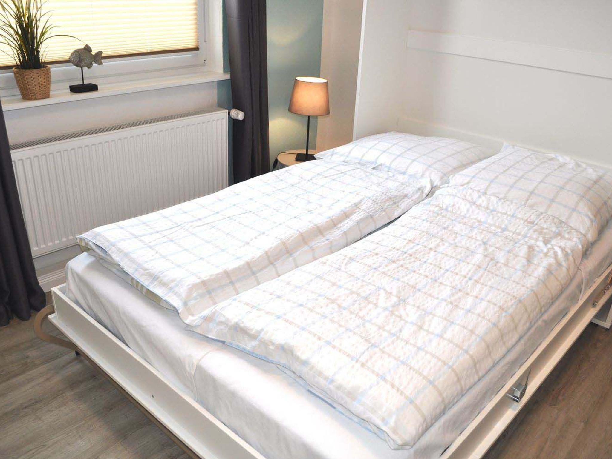 Schlafzimmer 1: 2 Ablagen, 3 Wandlampen, Doppelbett 2,00 x 1,80 m, 2 Matratzen, Einzelbett 2,00 x 0,90 m, Flachbildschirm, Kabel-TV, Kleiderschrank, Kommode, Verdunklungsplissee