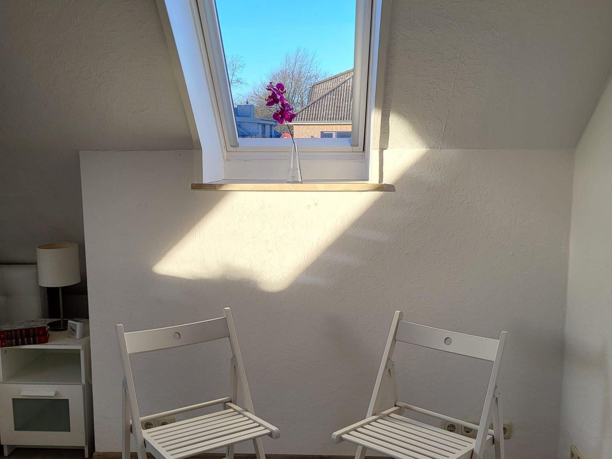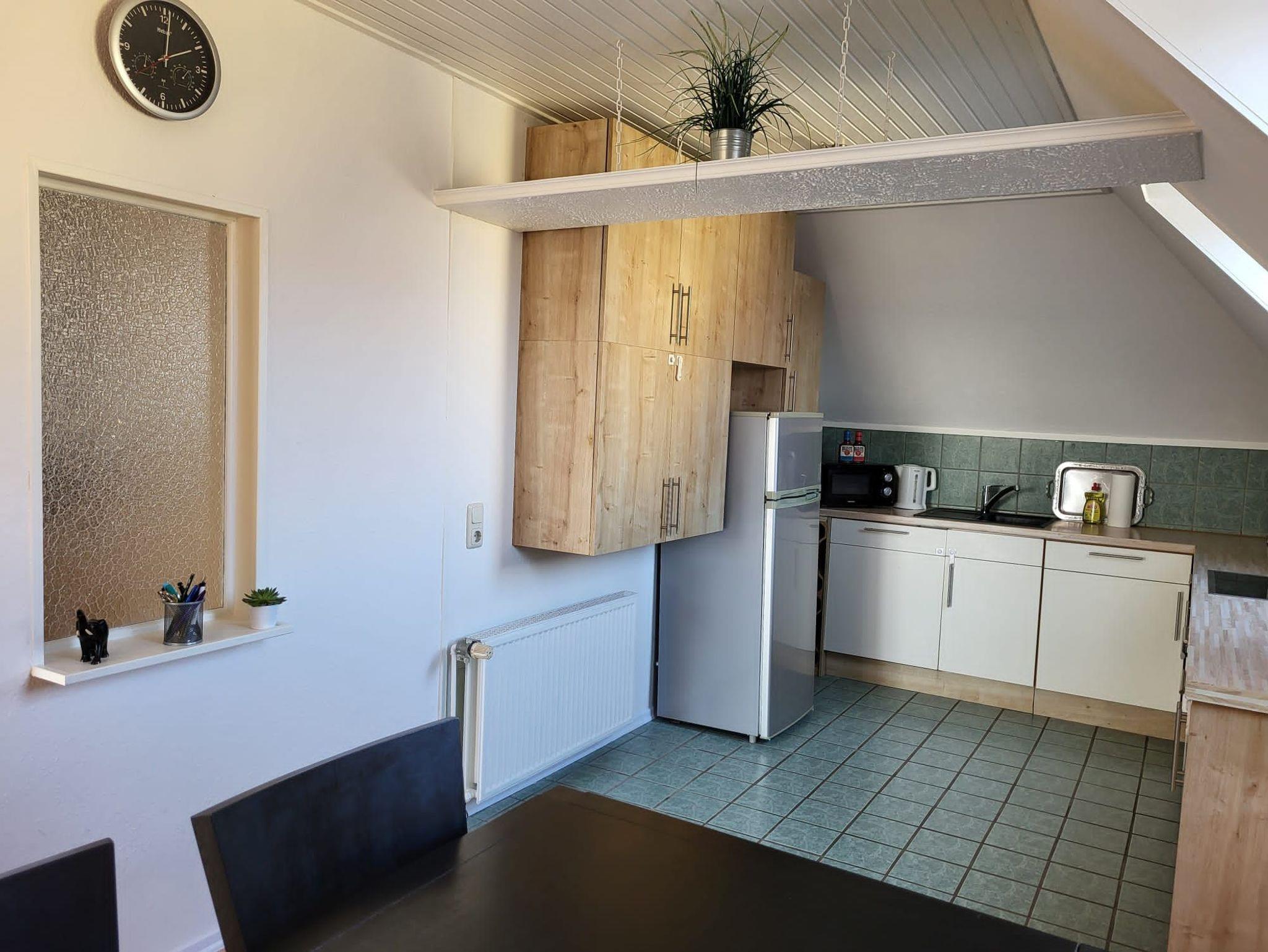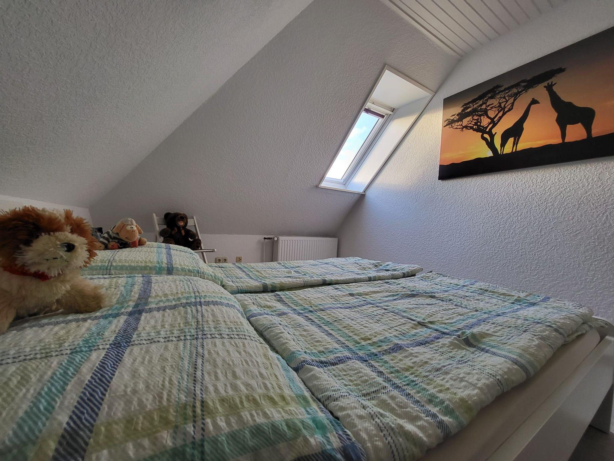 Die Dachwohnung befindet sich im 1. Stock mit einem schönen Ausblick auf den Garten. Das Wohnzimmer verfügt über eine Fernsehecke mit 55 Zoll TV, einem Essbereich und einer Schlafcouch im vorderen Bereich, worüber man auf die Loggia gelangen kann. Die Küche verfügt über eine Spülmaschine, Kaffeemaschine, Kühlschrank mit Gefrierfach, Wasserkocher, u v. m. Im großen Schlafzimmer befindet sich ein Doppelbett (200x180 cm) und im kleineren Schlafzimmer ein französisches Bett (200x140 cm). Das Bad ist mit Dusche, WC und einem Waschtisch ausgestattet.