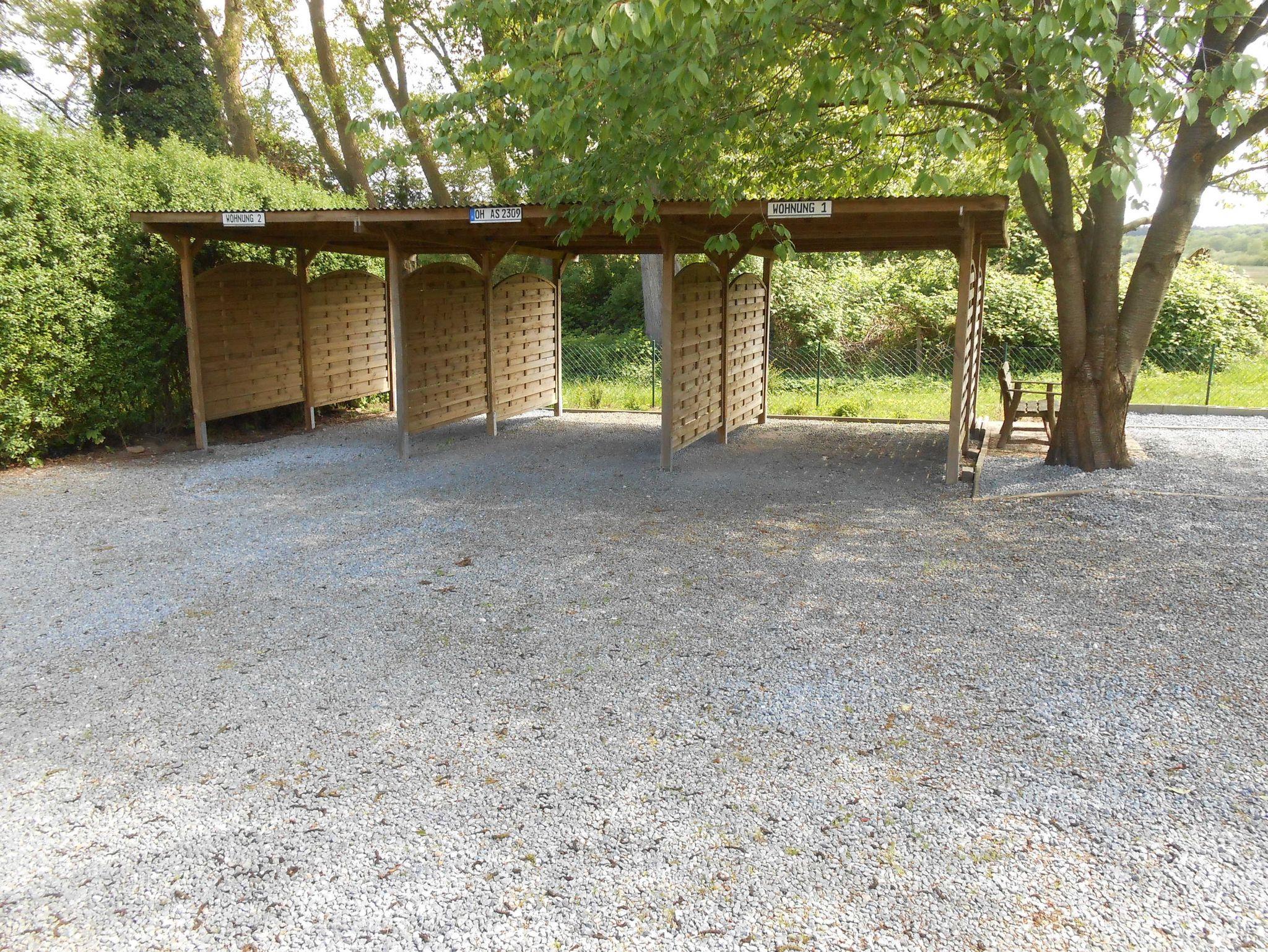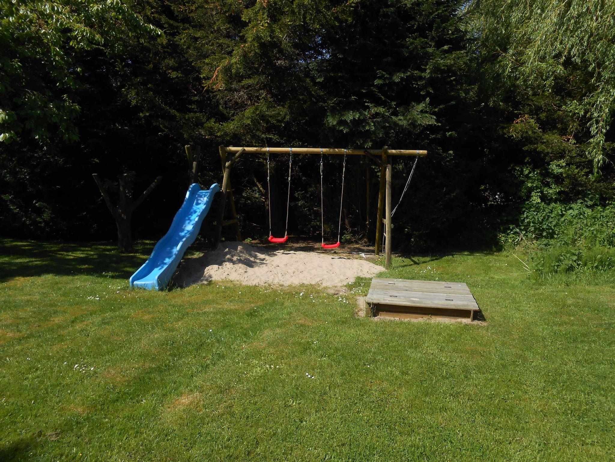 Ein Kinderspielplatz mit Schaukel und Sandkiste befindet sich im hinteren Teil des Gartens, wo auch ein Auto oder die Fahrräder im Carport stehen können.