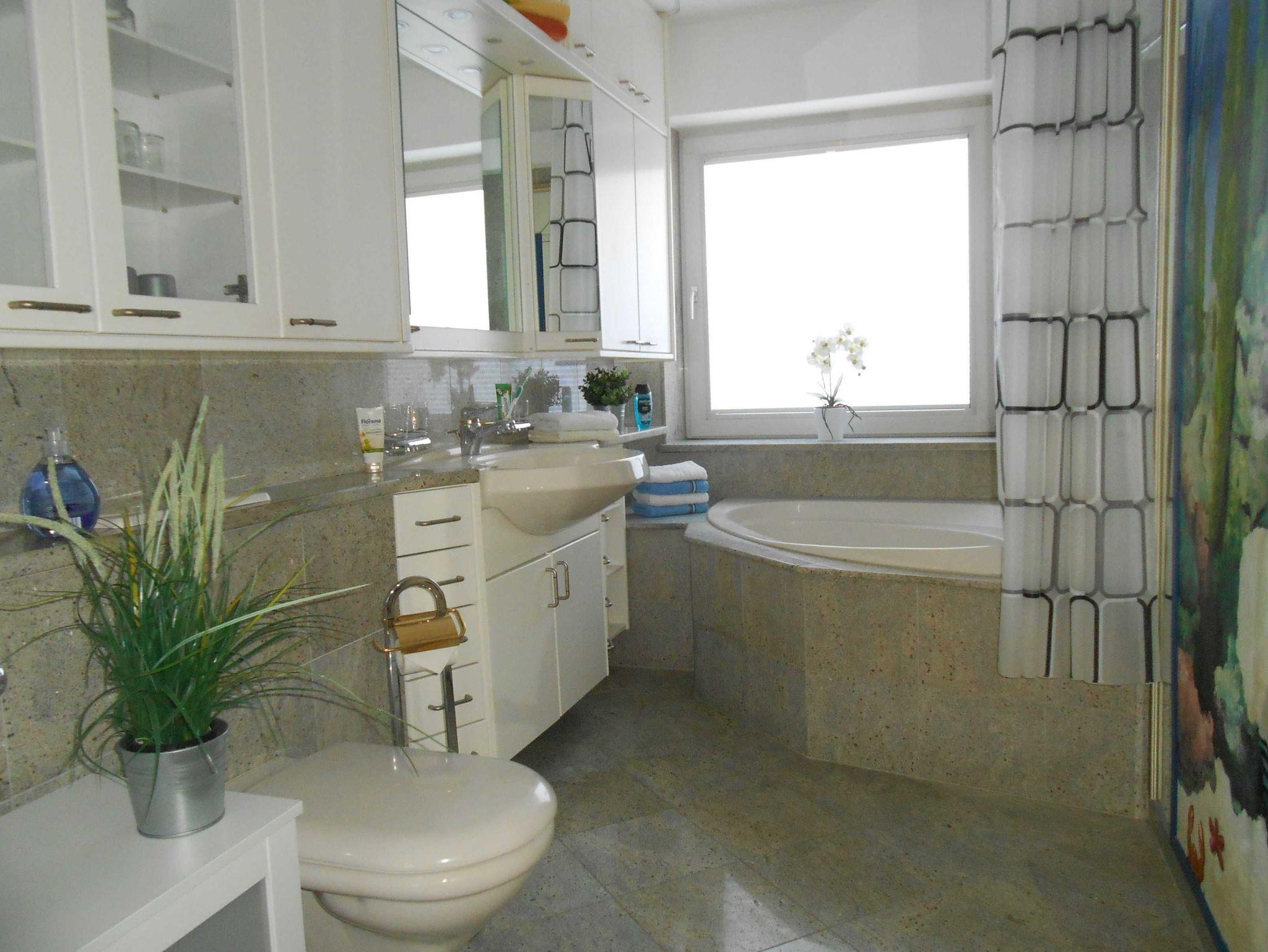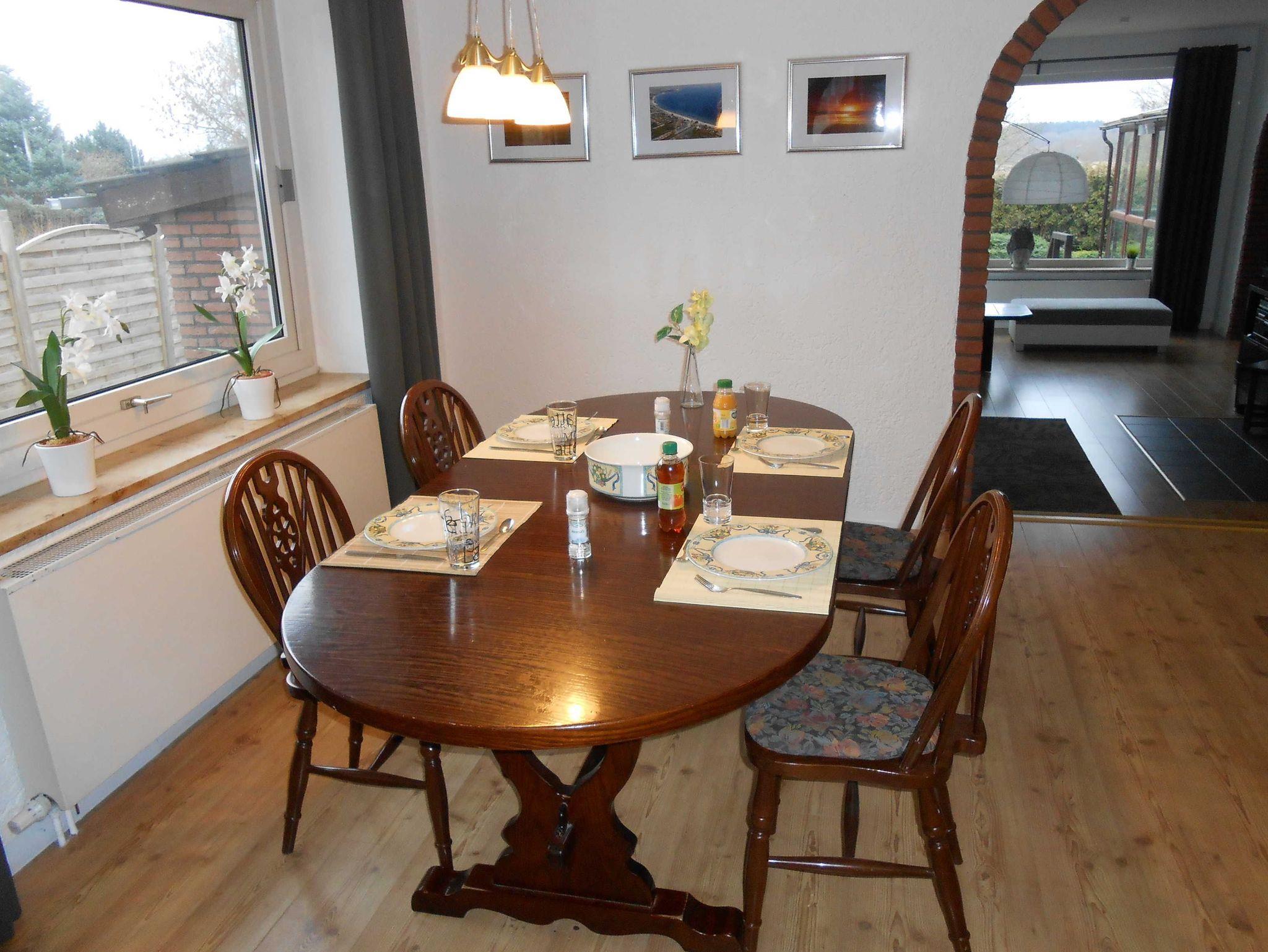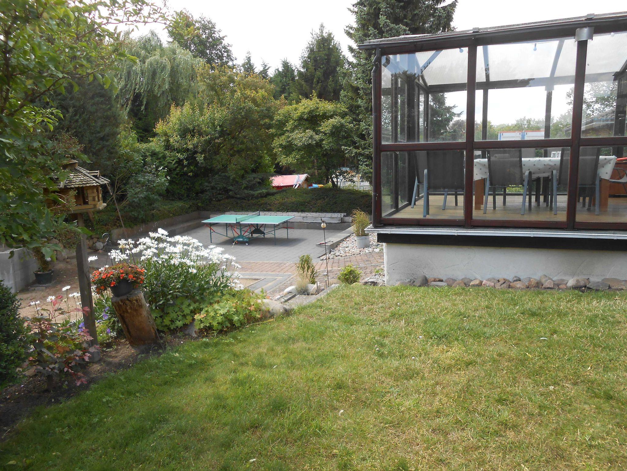Die Ferienwohnung hat ein Bad mit Badewanne sowie eine Gästetoilette. Die Küche (mit Spülmaschine) und Flur besitzen Bodenfliesen, im Rest der Wohnung ist Laminat verlegt worden. Zwei Schlafzimmer haben französische Betten (140 x 200 cm), ein weiteres Schlafzimmer hat ein Bett (180 x 200 cm). Im Anbau im Wohnzimmer steht zusätzlich noch eine Schlafcouch für zwei Personen. Direkt vom Anbau gelangt man in den 20 m² großen Wintergarten, der einen direkten Zugang in den Garten hat. Dort gibt es einen Platz im Carport für ein Fahrzeug. Der Kamin steht leider nicht zur Benutzung zur Verfügung. Im Garten kann man die Seele baumeln lassen. Ein Kinderreisebett (ohne Bettwäsche!!!!) und ein Kinderstuhl werden gerne kostenlos zur Verfügung gestellt.