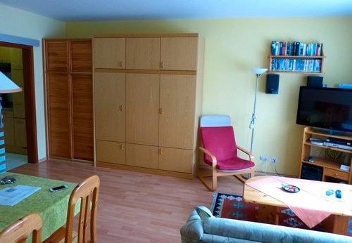 Die Wohnung ist gut ausgestattet mit Telefon, einem Tresor, kostenlosem Internet und telefonieren innerhalb Deutschlands. Sie hat eine separate Einbauküche mit Geschirrspüler, Mikrowelle, Wasserkocher, Kaffeemaschine, Heißluftfriteuse, viel Geschirr. Das Wohnzimmer hat eine Sitz-und Essgruppe und ein Schrankbett für zwei Erwachsen. Im kleinen Schlafzimmer stehen zwei Einzelbetten und ein Kleiderschrank.