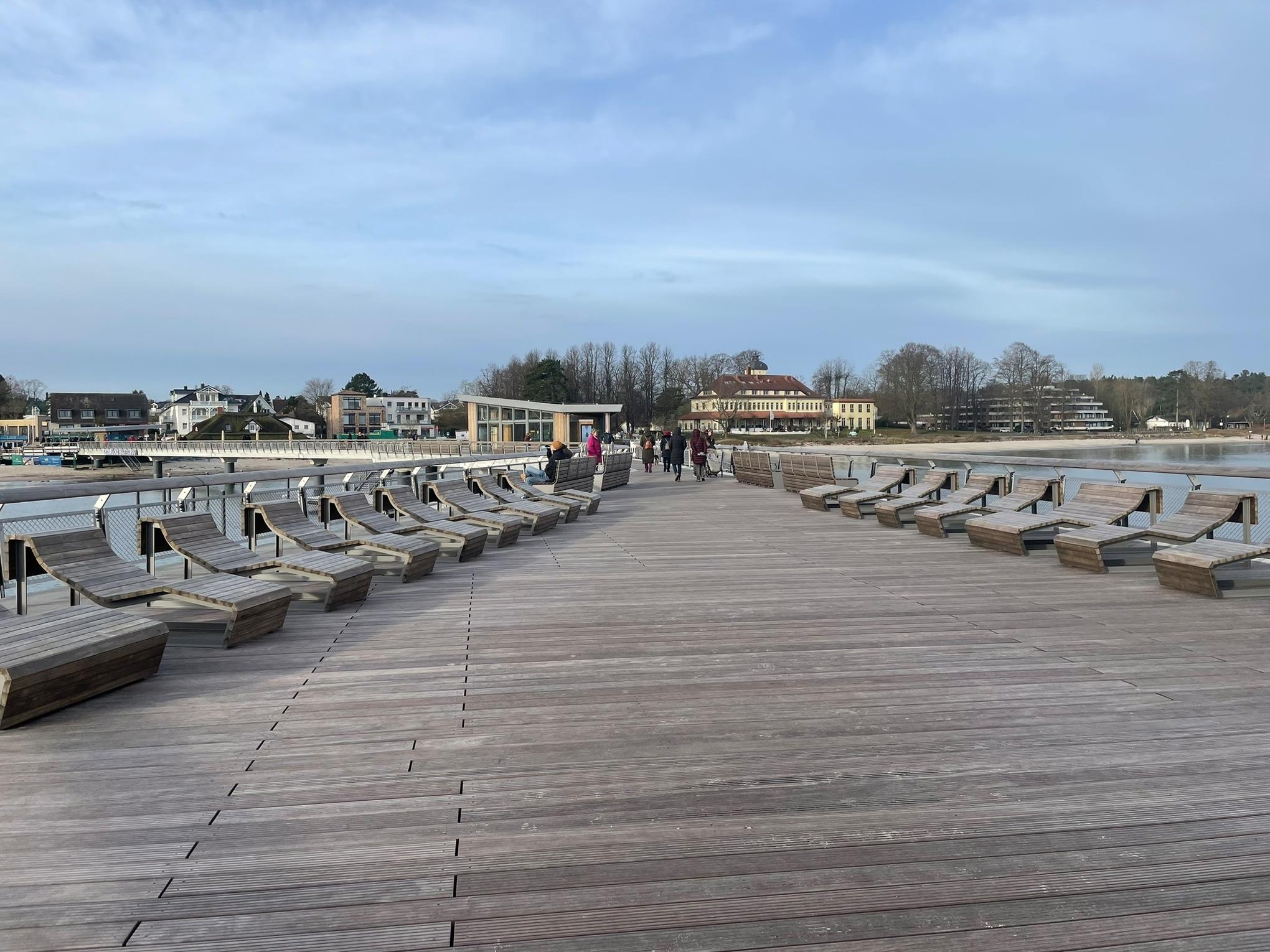 Eine schöne, neue Seebrücke mit Sitzmöglichkeiten und Holzliegen.