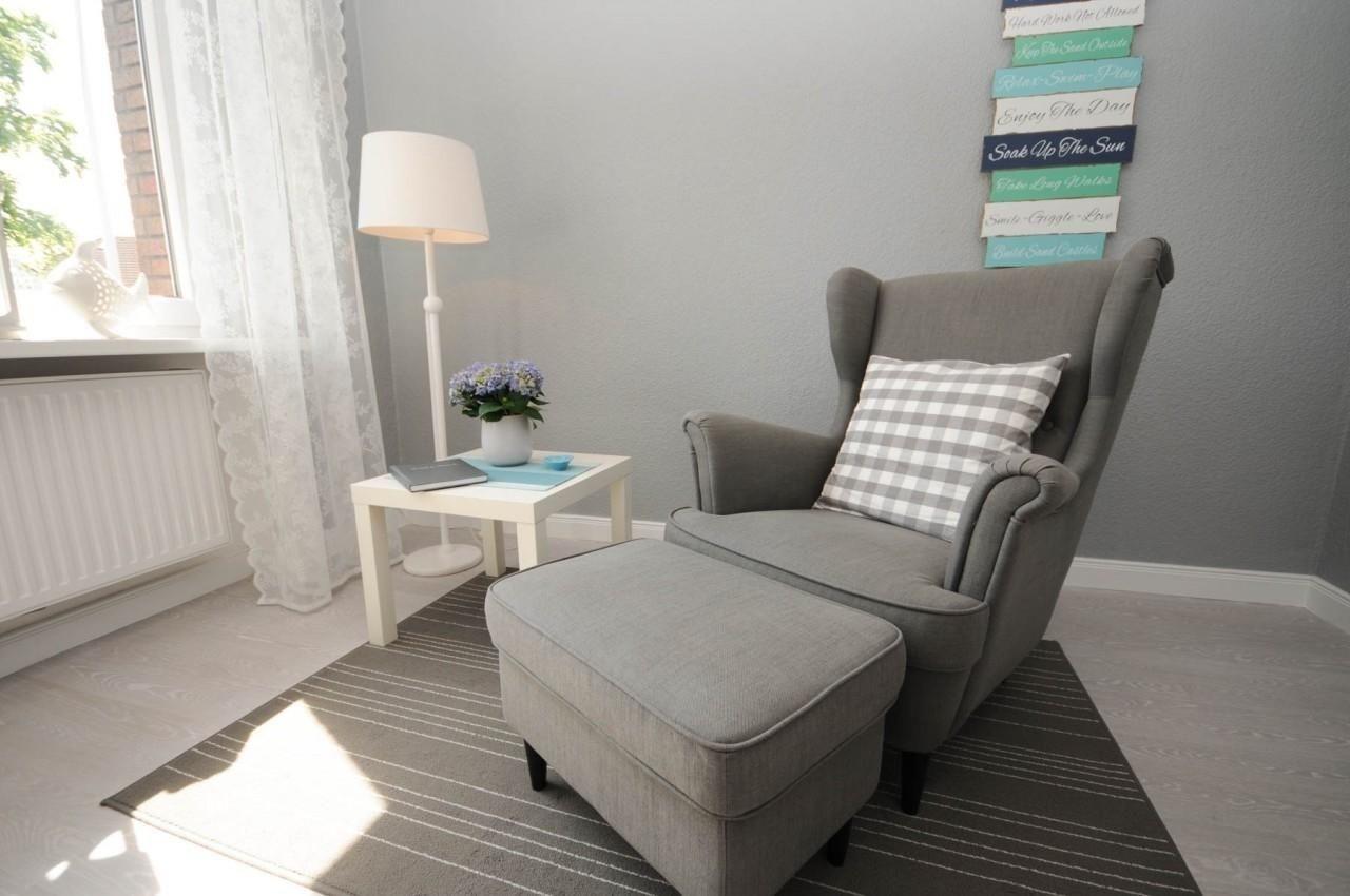 Der Flur der Wohnung bietet Zugang zu jedem Zimmer. Das helle und freundliche Wohnzimmer ermöglicht, auch wenn das Wetter mal nicht so mitspielt, die Zeit zu genießen. Das Ecksofa lädt nach langen Strandspaziergängen zum Fernsehen und Lesen ein. Die separate Küche ist komplett ausgestattet. Am gemütlichen Esstisch finden Sie genug Platz, um gemeinsam beisammenzusitzen um zu spielen, zu essen und sich vielleicht auch der einen oder anderen kulinarischen Köstlichkeit des Nordens hinzugeben. Zur Ausstattung gehört ebenfalls ein Trip Trap Hochstuhl. Auch auf der Terrasse wurde an einen weiteren Esstisch gedacht.