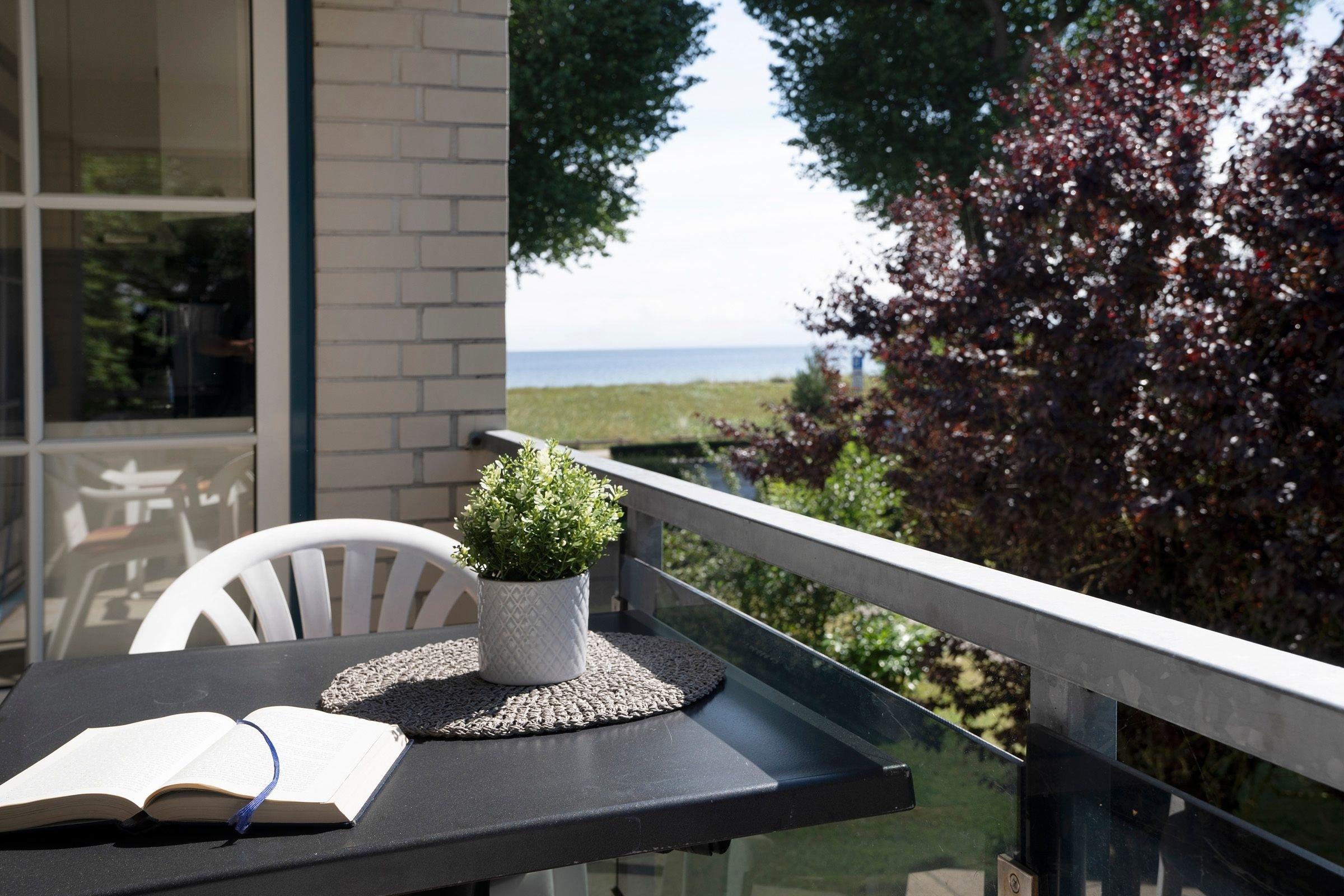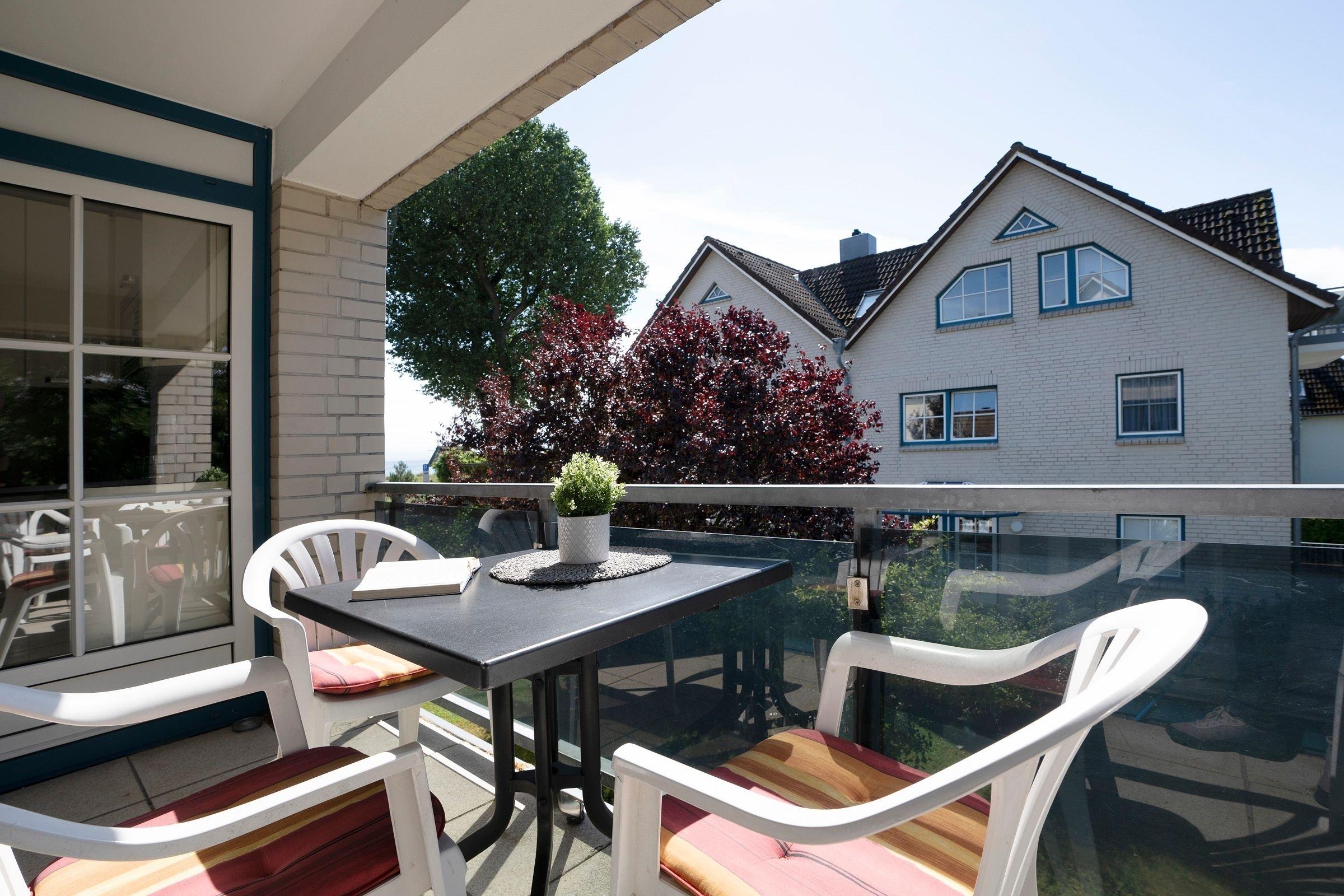 Es ist modern und sehr geschmackvoll eingerichtet. Das Appartement liegt in der 1. Etage und verfügt über einen Balkon mit seitlichem Meerblick sowie Gartenmöbeln. Im Wohnraum befindet sich eine Schlafcouch (140x200 cm) für 2 Personen. Außerdem befinden sich hier ein TV-Gerät, ein DVD-Player und eine Stereoanlage. Die neue komfortable Küchenzeile (Backofen, Mikrowelle, Cerankochfeld, Geschirrspüler, Kaffeemaschine, Wasserkocher, Toaster) ist mit dem Essplatz im Wohnraum integriert. Das Schlafzimmer ist mit einem Doppelbett (2x 80x200 cm) und einem Kleiderschrank möbliert. Duschbad/WC.