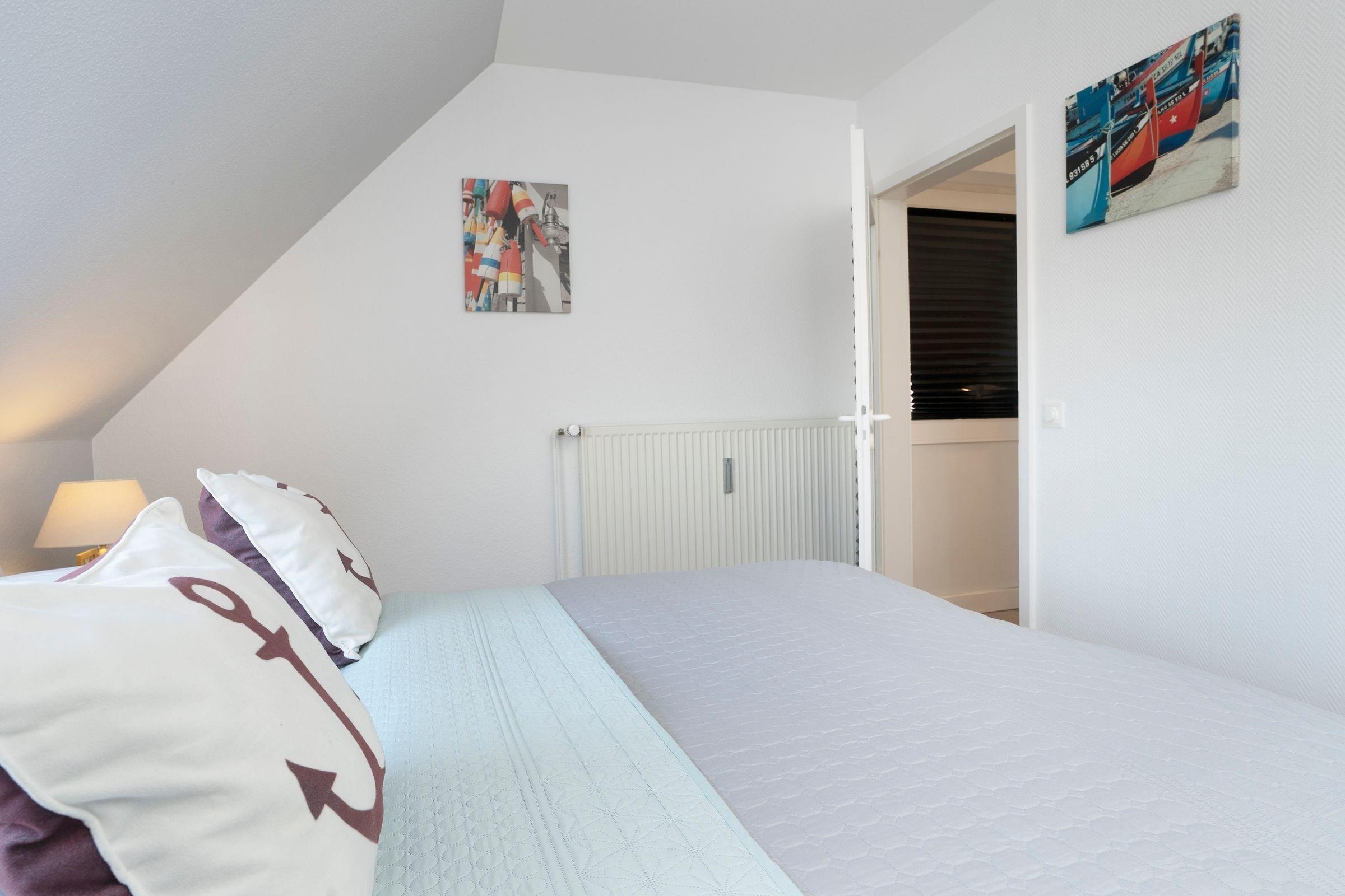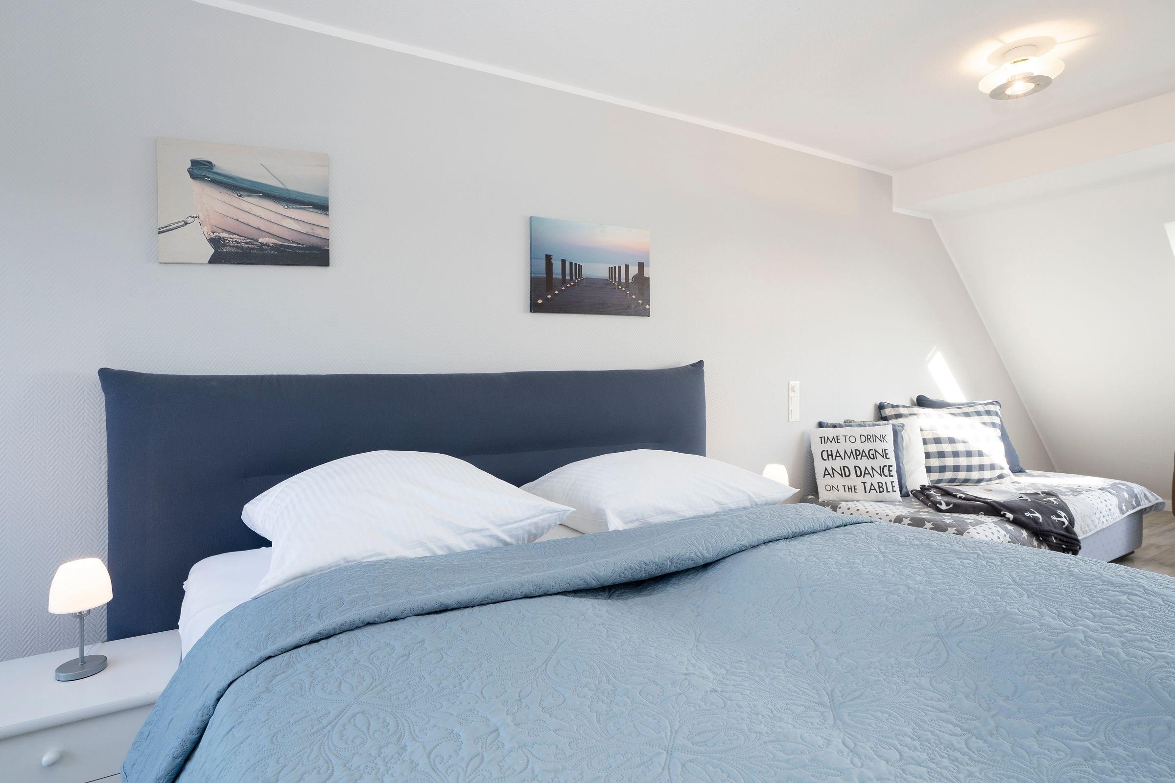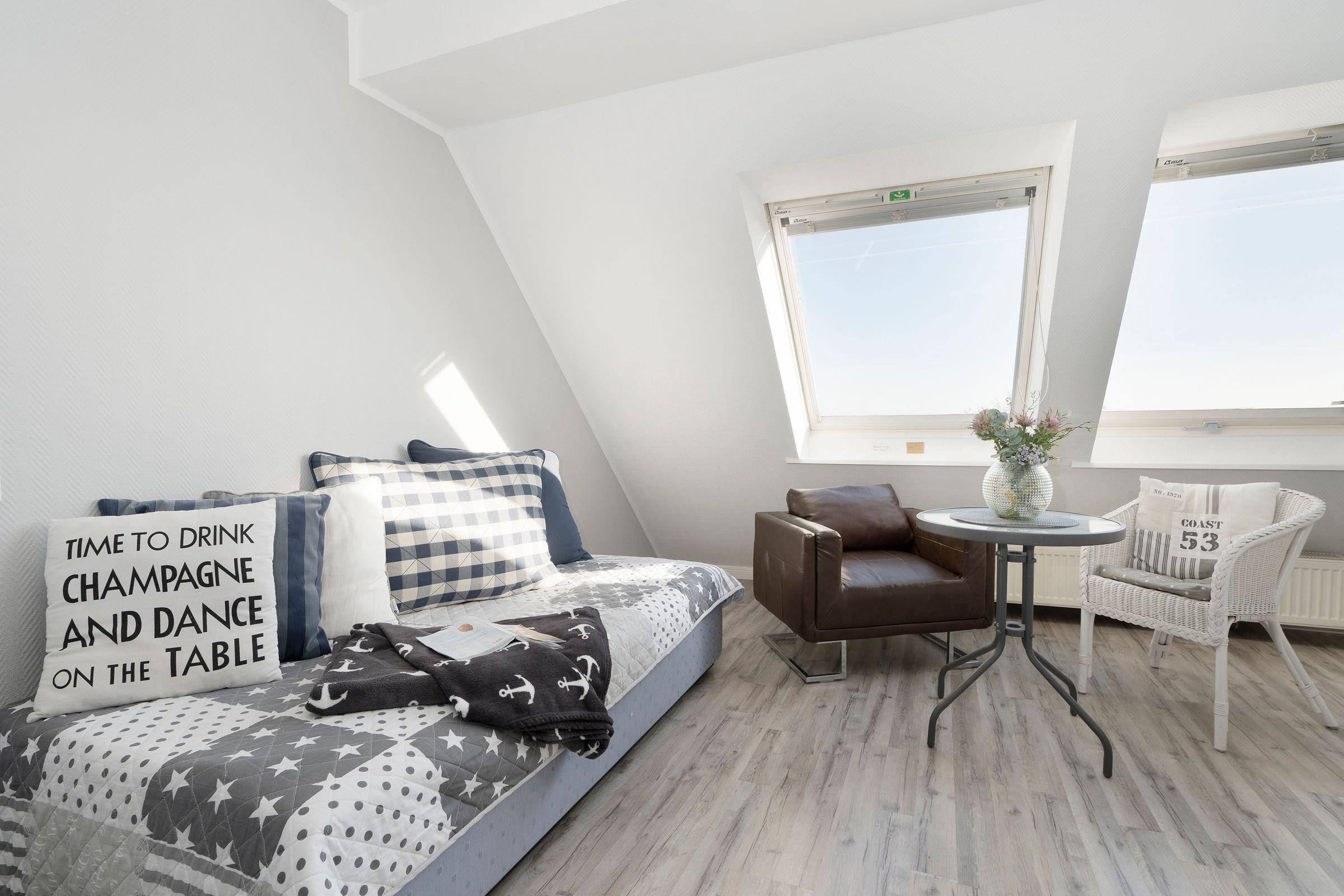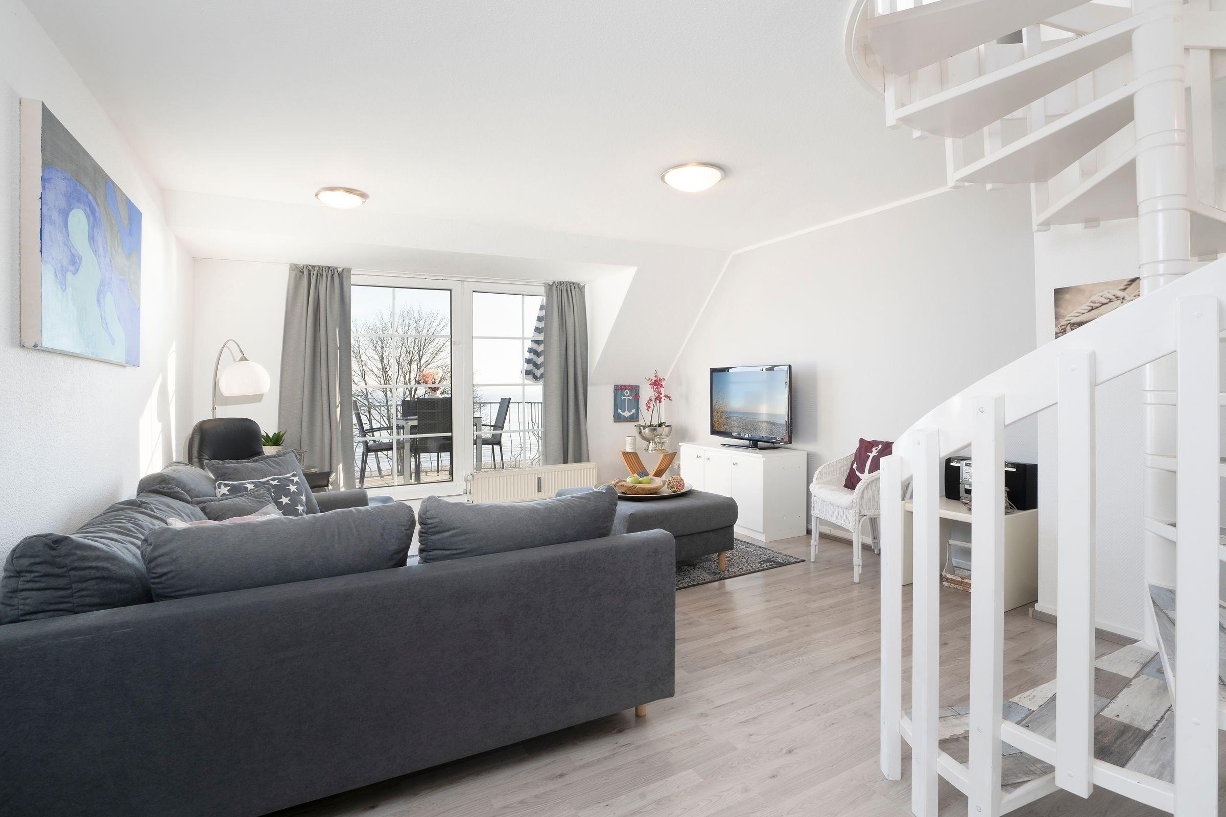 Der freundlich helle Wohnbereich lädt mit großer Couch zum Kuscheln vor dem Fernseher ein. Von hier gelangen Sie auf den Balkon, auf dem Sie schon morgens beim Frühstück den fantastischen Blick auf das Meer genießen können. Dank der gut ausgestatteten Küche können Sie selbst entscheiden, ob Sie das tolle kulinarische Angebot der Region nutzen oder sich doch lieber selbst versorgen möchten. Nach einem ereignisreichen Urlaubstag entspannen Sie im Doppelbett (2x 90x200 cm) im separaten Schlafzimmer. Auf dieser Etage befindet sich außerdem ein Duschbad. Über eine Wendeltreppe erreichen Sie das OG, wo ein weiteres Schlafzimmer mit Doppelbett (2x 90x200 cm) wartet. Genießen Sie nach dem Aufwachen die gute Ostseeluft auf einem eigenen kleinen Balkon. Auch diese Etage verfügt über ein Duschbad.