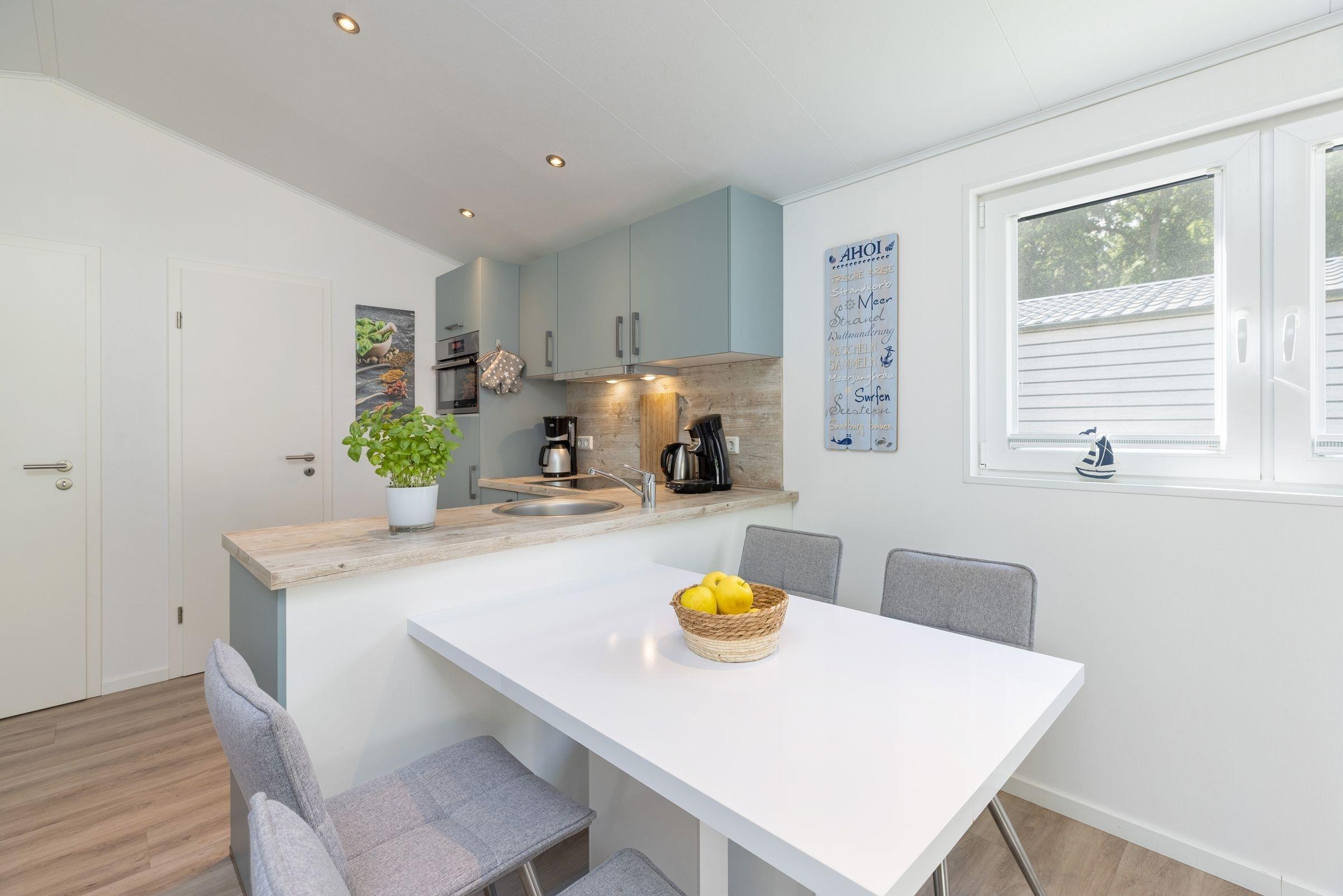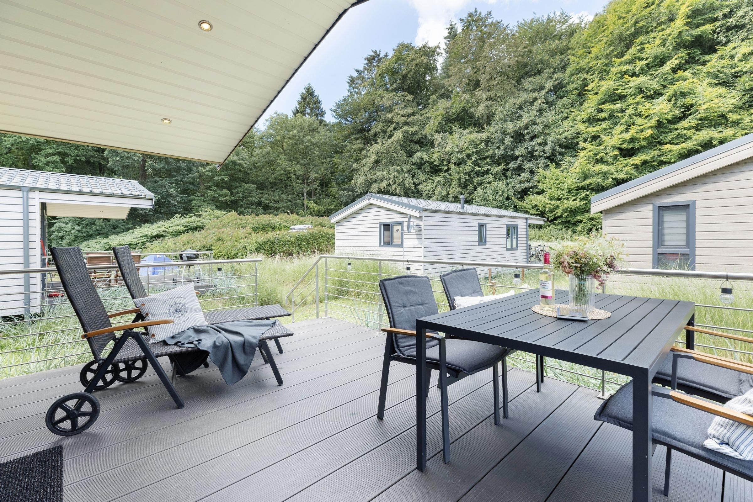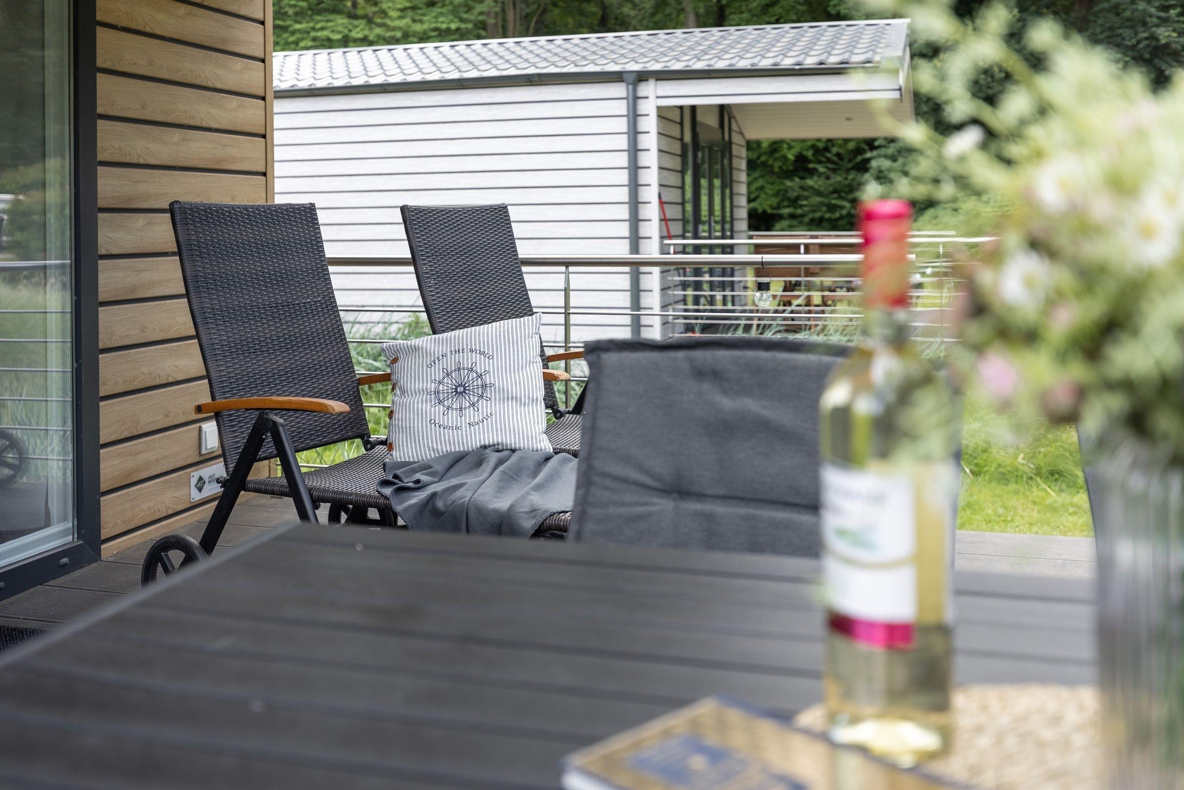 Im offenen Wohnbereich mit Essplatz und Küche trifft sich die Familie und findet hier viele Annehmlichkeiten, um die Urlaubstage komfortabel zu gestalten. Kuscheln Sie sich gemeinsam auf das gemütliche Sofa und verbringen Sie gesellige Stunden vor dem Fernseher oder genießen Sie selbst zubereitete Köstlichkeiten am Esstisch. In der Küche finden Sie hierfür alles, was Sie zur Zubereitung Ihrer Speisen benötigen: Einen Herd mit 4 Kochfeldern, eine Mikrowelle (Kombigerät mit Backofenfunktion), eine Spülmaschine, Kaffeemaschine, Wasserkocher und Toaster. Vom lichtdurchfluteten Wohnbereich gelangen Sie auch auf die tolle möblierte Terrasse mit Blick in den angrenzenden Garten. Für gemeinsame Grillabende steht Ihnen ein Weber Kugelgrill zur Verfügung. Das Rauschen des Waldes sorgt am Abend für herrliche Entspannung, wenn Sie gemeinsam draußen sitzen. Als als Blick- und Windschutz wurde für Sie eine ausziehbare Seitenjalousie installiert. Zur Nachtruhe können Sie sich ins separate Schlafzimmer mit Doppelbett (2x 80x200 cm) und Kleiderschrank zurückziehen. 2 weitere Schlafplätze in Form von 2 Einzelbetten (je 80x200 cm) laden in einem weiteren Schlafzimmer mit Kleiderschrank zum Träumen ein. Auch das Tageslichtbad mit bodentiefer Dusche und Handtuchheizkörper lässt keine Wünsche offen. Der WLAN-Anschluss ist inklusive.
