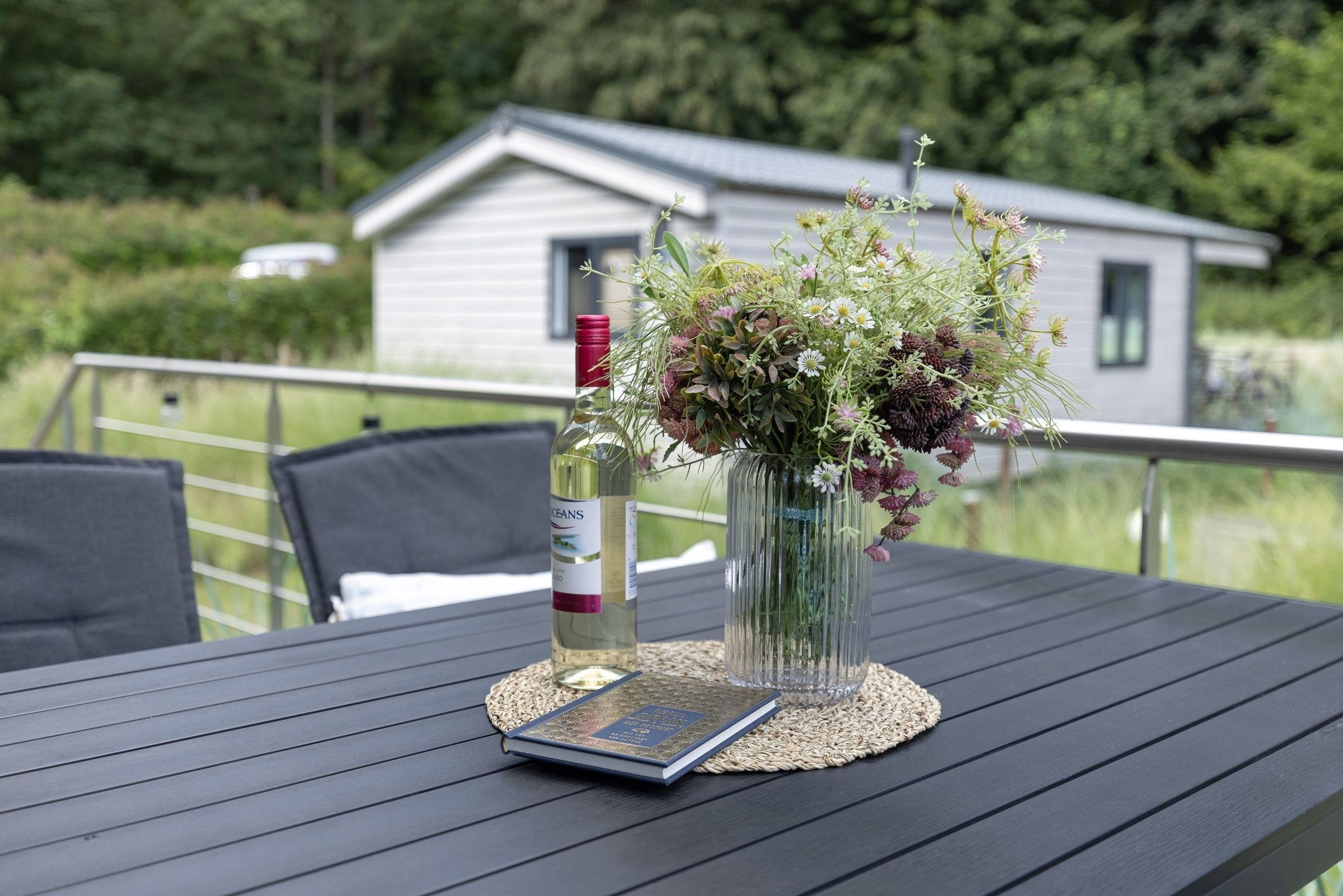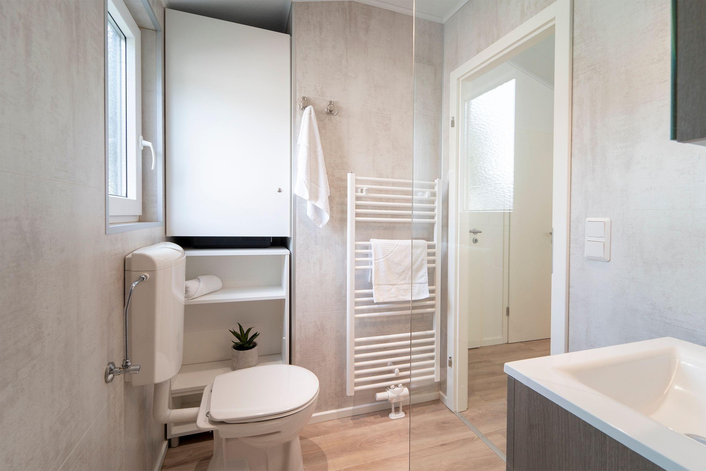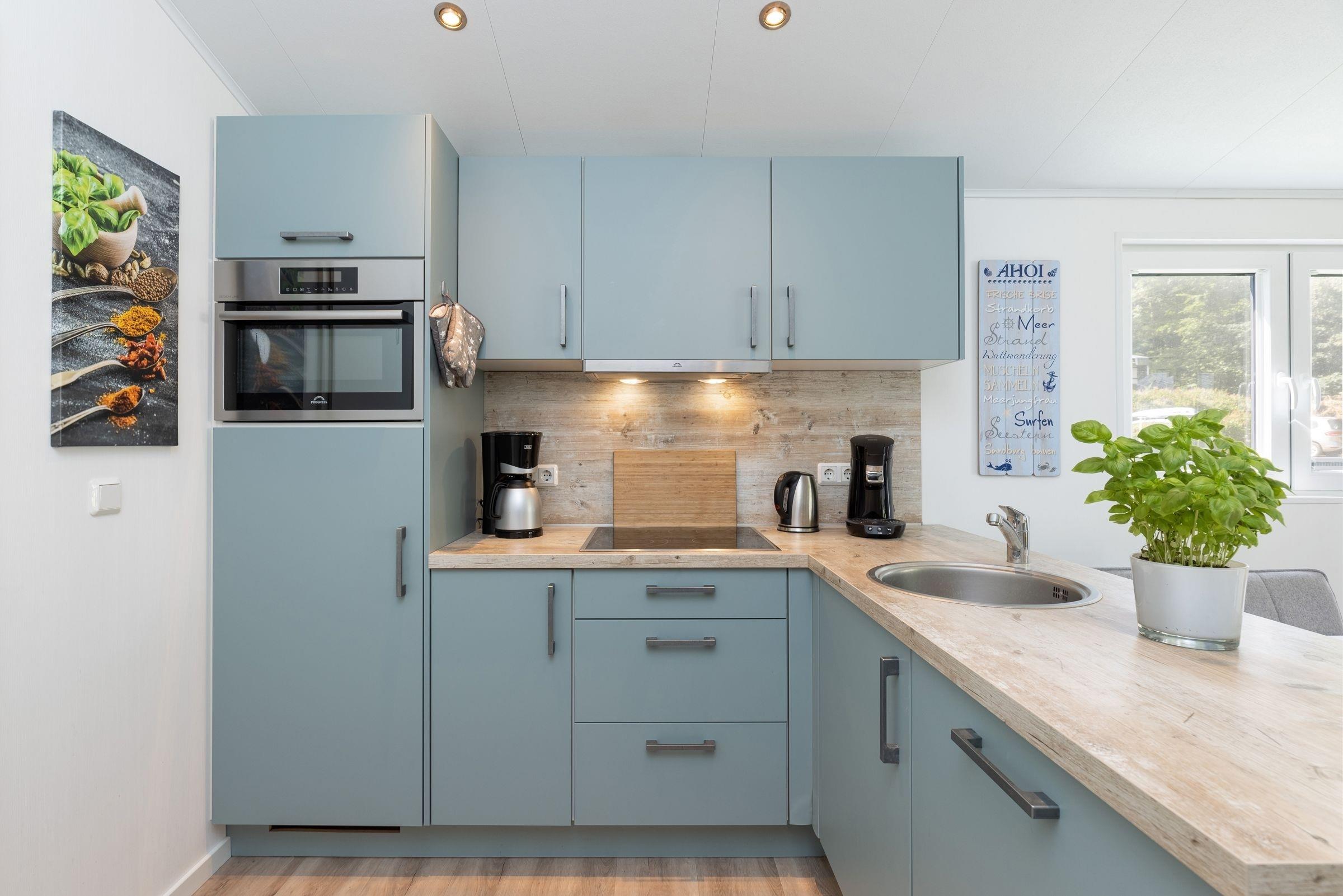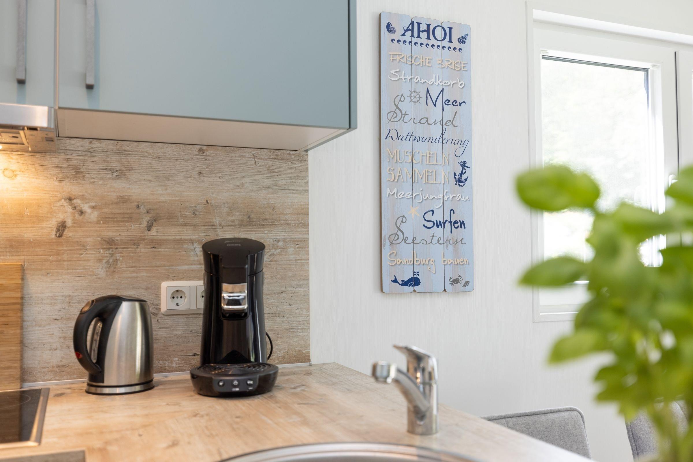 Im offenen Wohnbereich mit Essplatz und Küche trifft sich die Familie und findet hier viele Annehmlichkeiten, um die Urlaubstage komfortabel zu gestalten. Kuscheln Sie sich gemeinsam auf das gemütliche Sofa und verbringen Sie gesellige Stunden vor dem Fernseher oder genießen Sie selbst zubereitete Köstlichkeiten am Esstisch. In der Küche finden Sie hierfür alles, was Sie zur Zubereitung Ihrer Speisen benötigen: Einen Herd mit 4 Kochfeldern, eine Mikrowelle (Kombigerät mit Backofenfunktion), eine Spülmaschine, Kaffeemaschine, Wasserkocher und Toaster. Vom lichtdurchfluteten Wohnbereich gelangen Sie auch auf die tolle möblierte Terrasse mit Blick in den angrenzenden Garten. Für gemeinsame Grillabende steht Ihnen ein Weber Kugelgrill zur Verfügung. Das Rauschen des Waldes sorgt am Abend für herrliche Entspannung, wenn Sie gemeinsam draußen sitzen. Als als Blick- und Windschutz wurde für Sie eine ausziehbare Seitenjalousie installiert. Zur Nachtruhe können Sie sich ins separate Schlafzimmer mit Doppelbett (2x 80x200 cm) und Kleiderschrank zurückziehen. 2 weitere Schlafplätze in Form von 2 Einzelbetten (je 80x200 cm) laden in einem weiteren Schlafzimmer mit Kleiderschrank zum Träumen ein. Auch das Tageslichtbad mit bodentiefer Dusche und Handtuchheizkörper lässt keine Wünsche offen. Der WLAN-Anschluss ist inklusive.