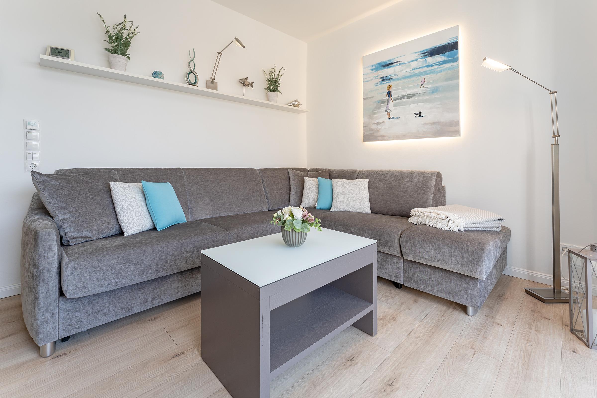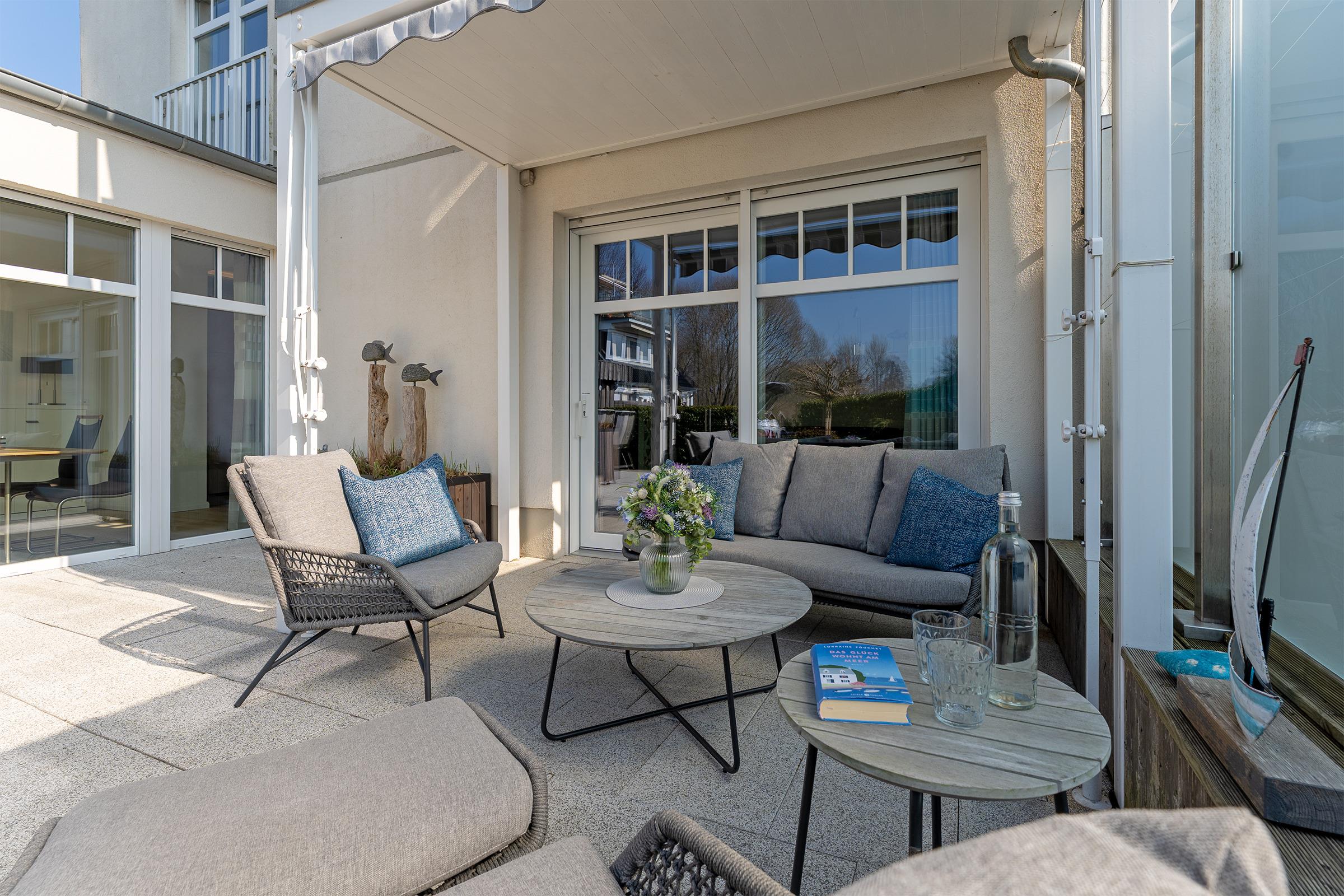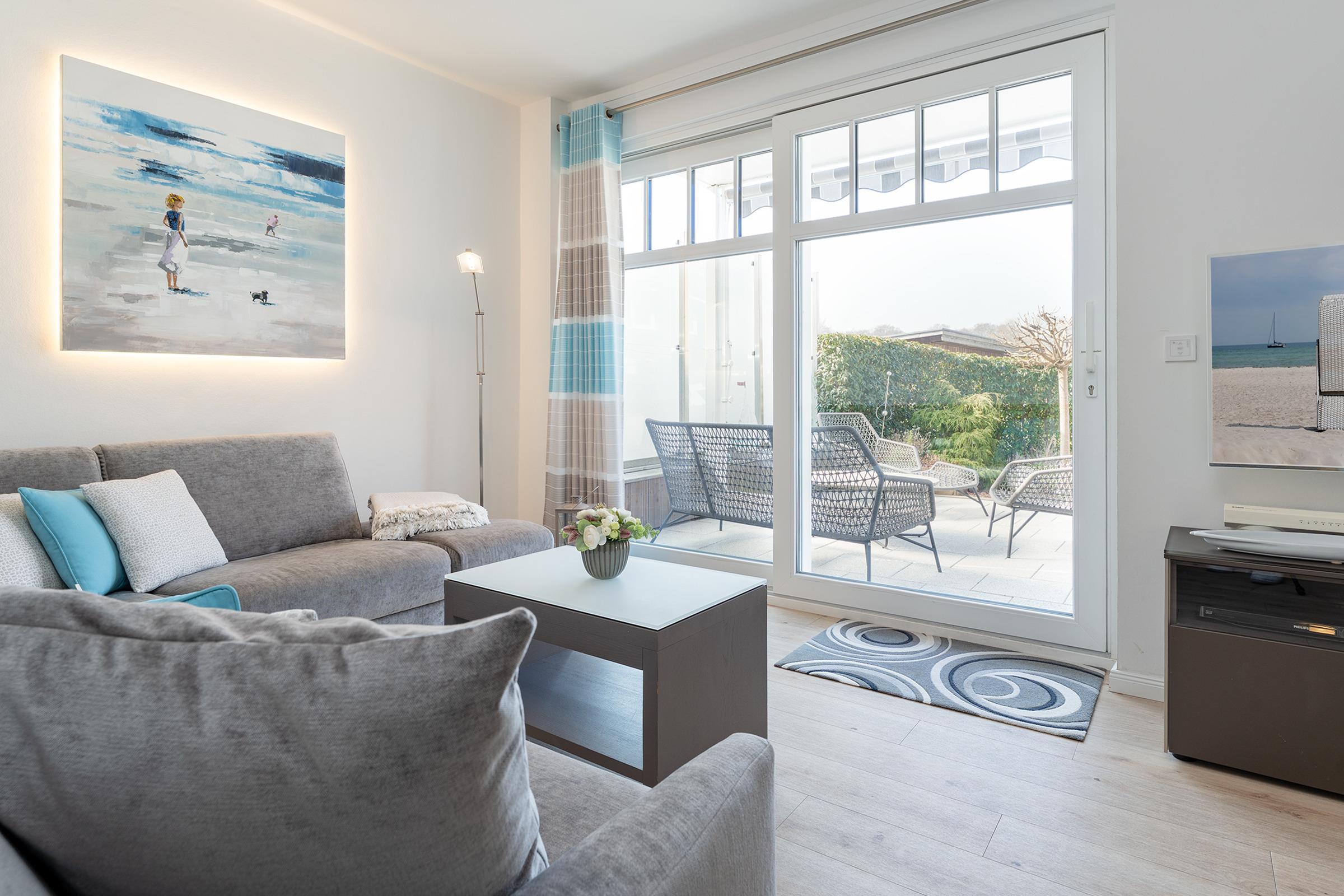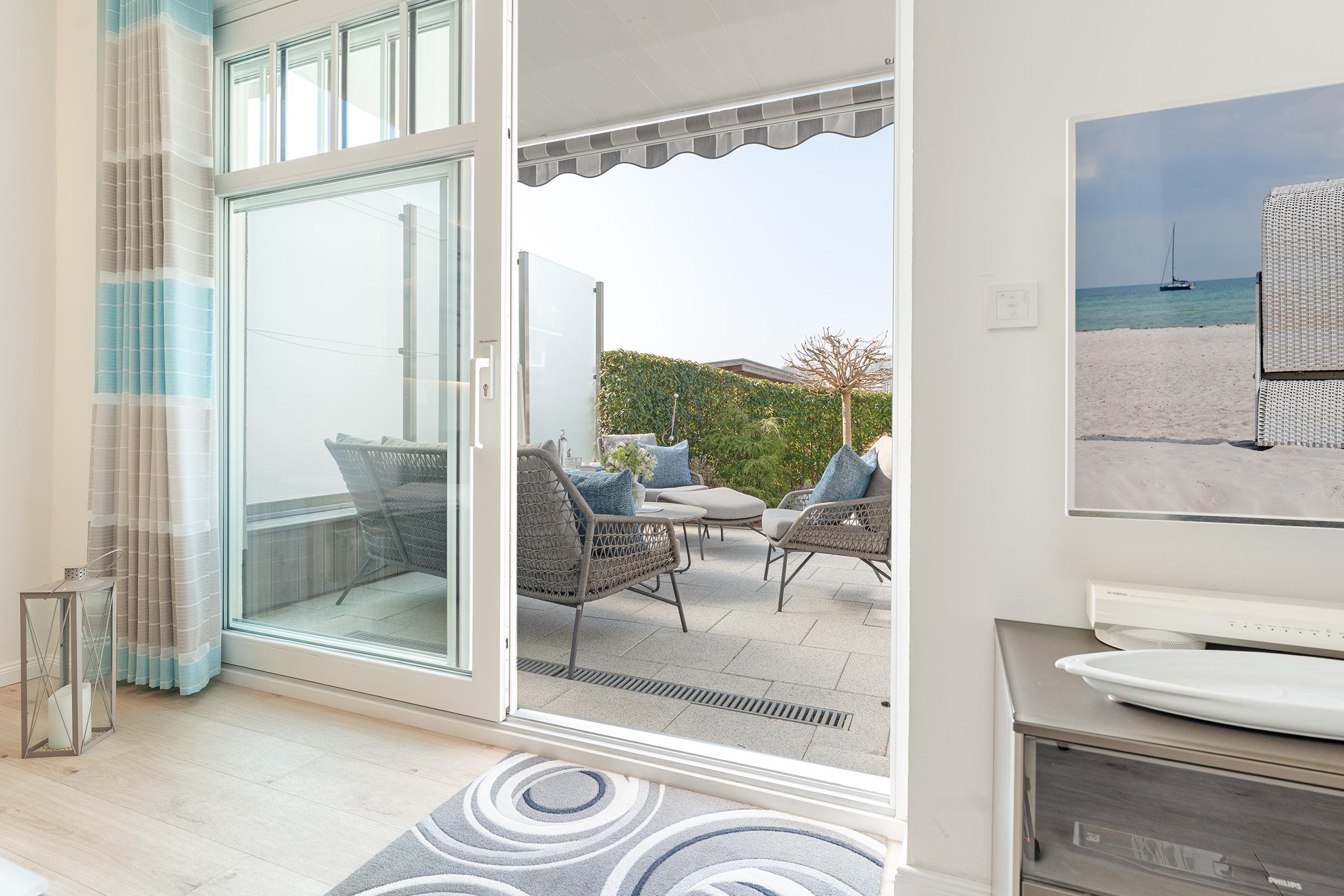 Der großzügige Wohnbereich ist modern eingerichtet und bietet eine gemütliche Sofaecke sowie einen TV für entspannte Abende. Durch große Fenster ist der Raum lichtdurchflutet. Die angrenzende Terrasse mit Gartenmöbeln lädt dazu ein, die frische Meeresbrise zu genießen. WLAN ist inklusive.
