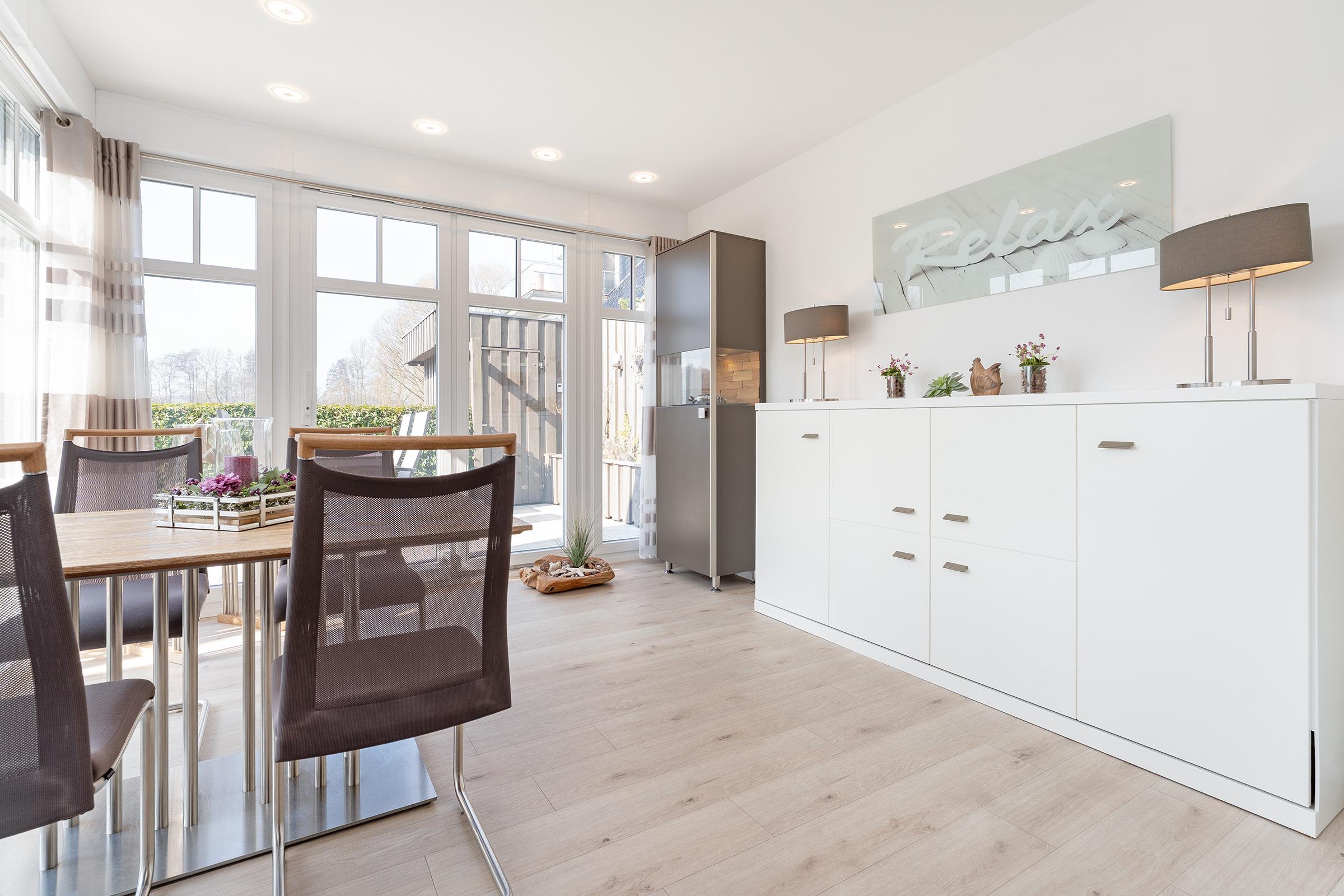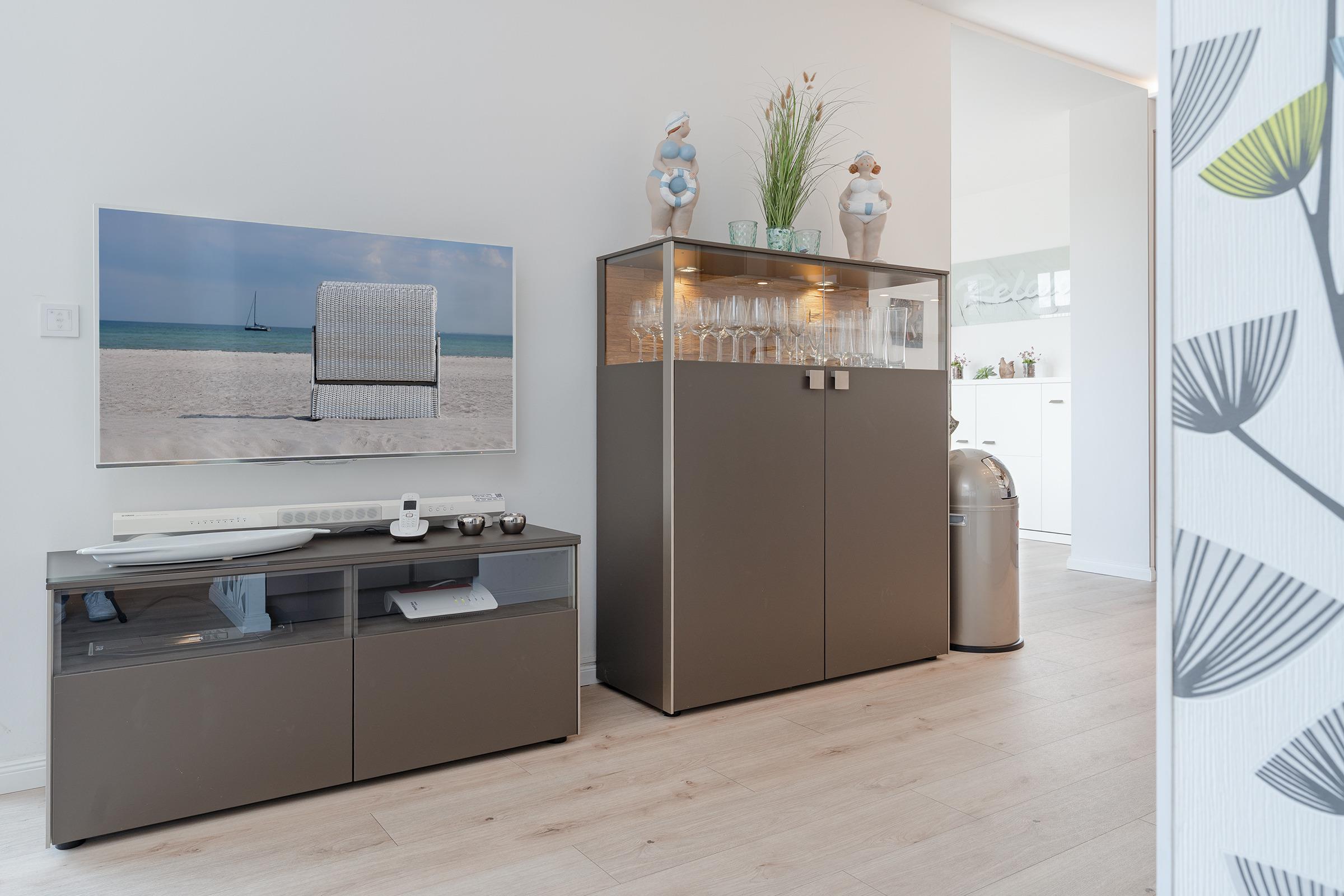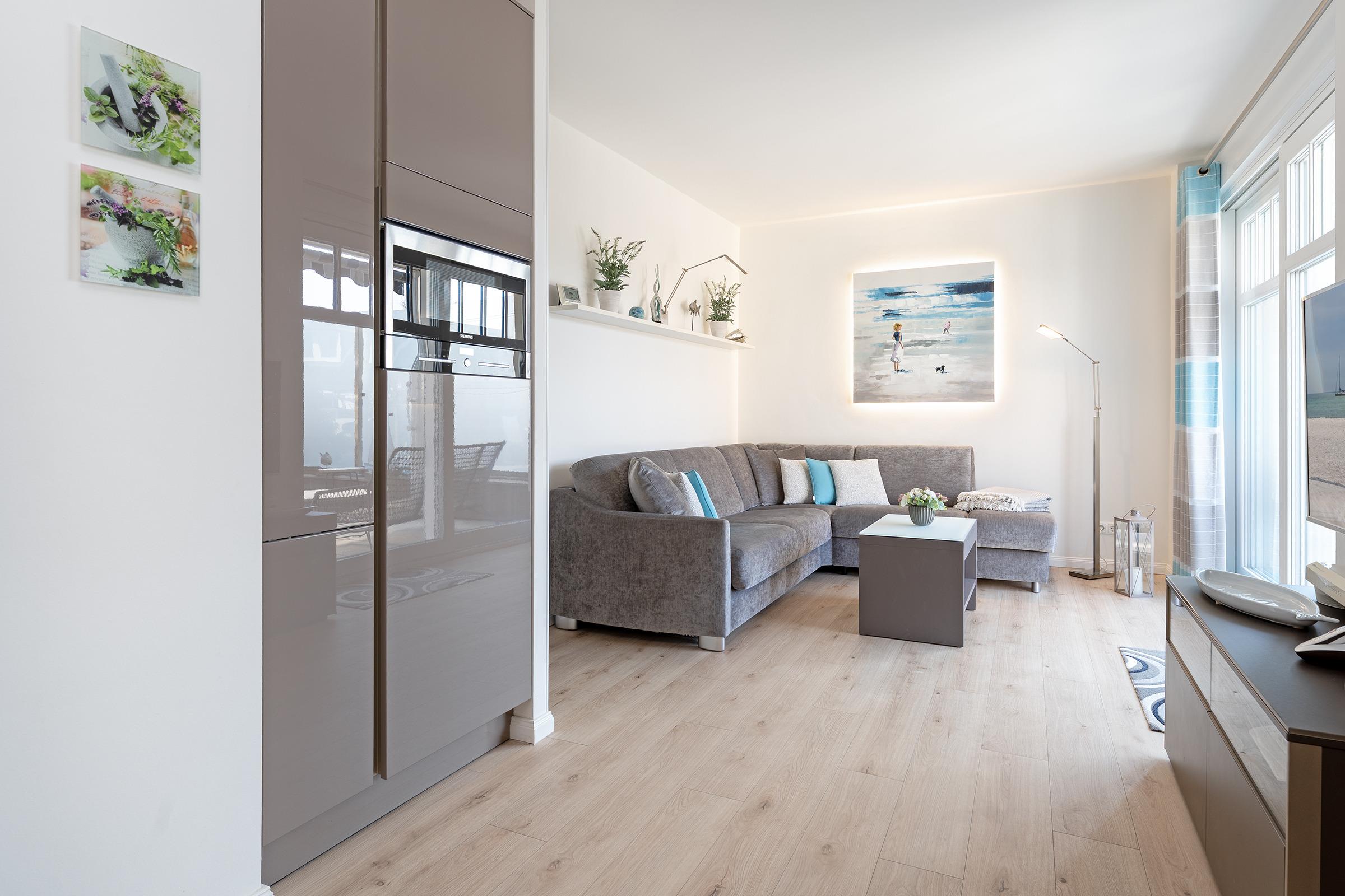 Der großzügige Wohnbereich ist modern eingerichtet und bietet eine gemütliche Sofaecke sowie einen TV für entspannte Abende. Durch große Fenster ist der Raum lichtdurchflutet. Die angrenzende Terrasse mit Gartenmöbeln lädt dazu ein, die frische Meeresbrise zu genießen. WLAN ist inklusive.