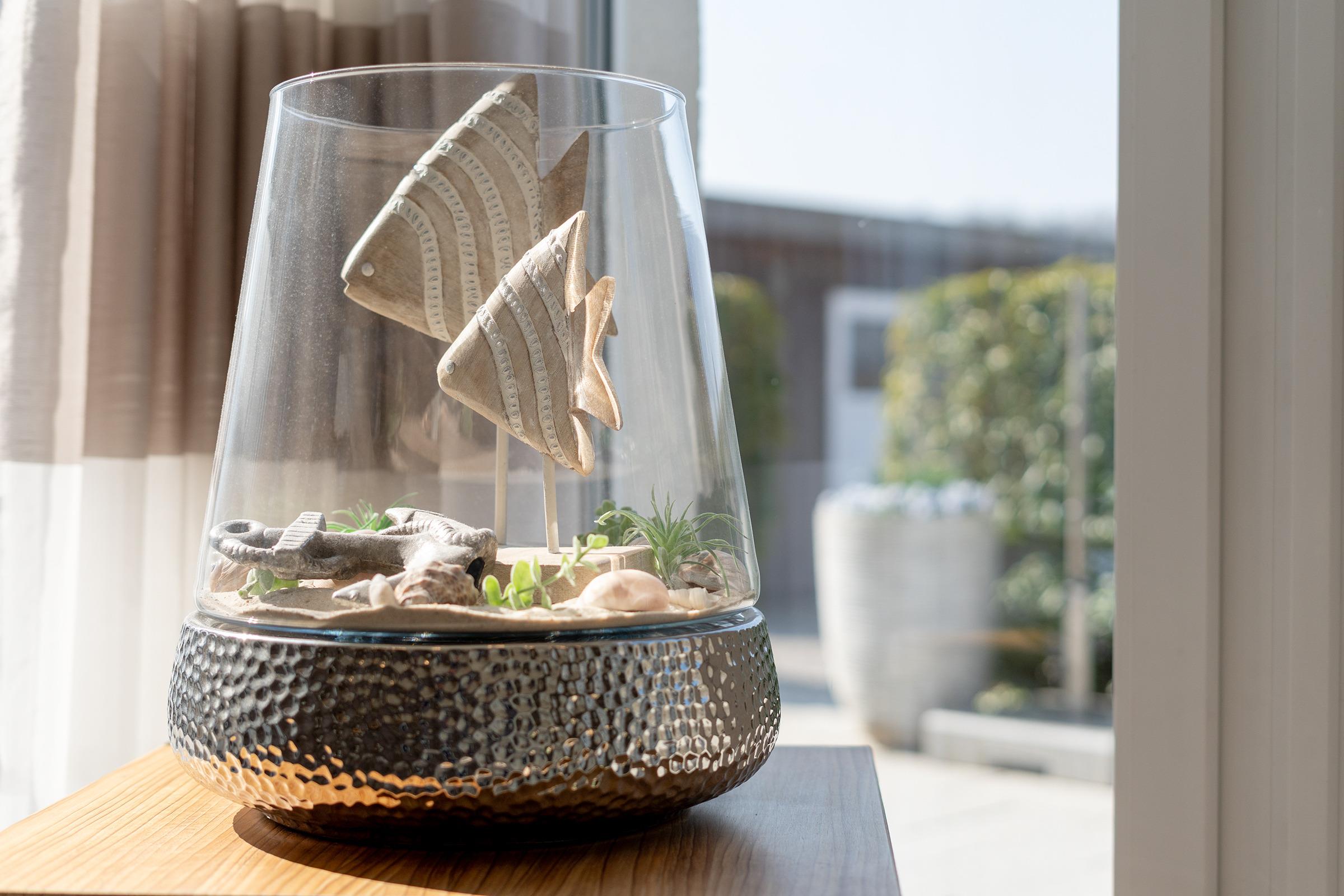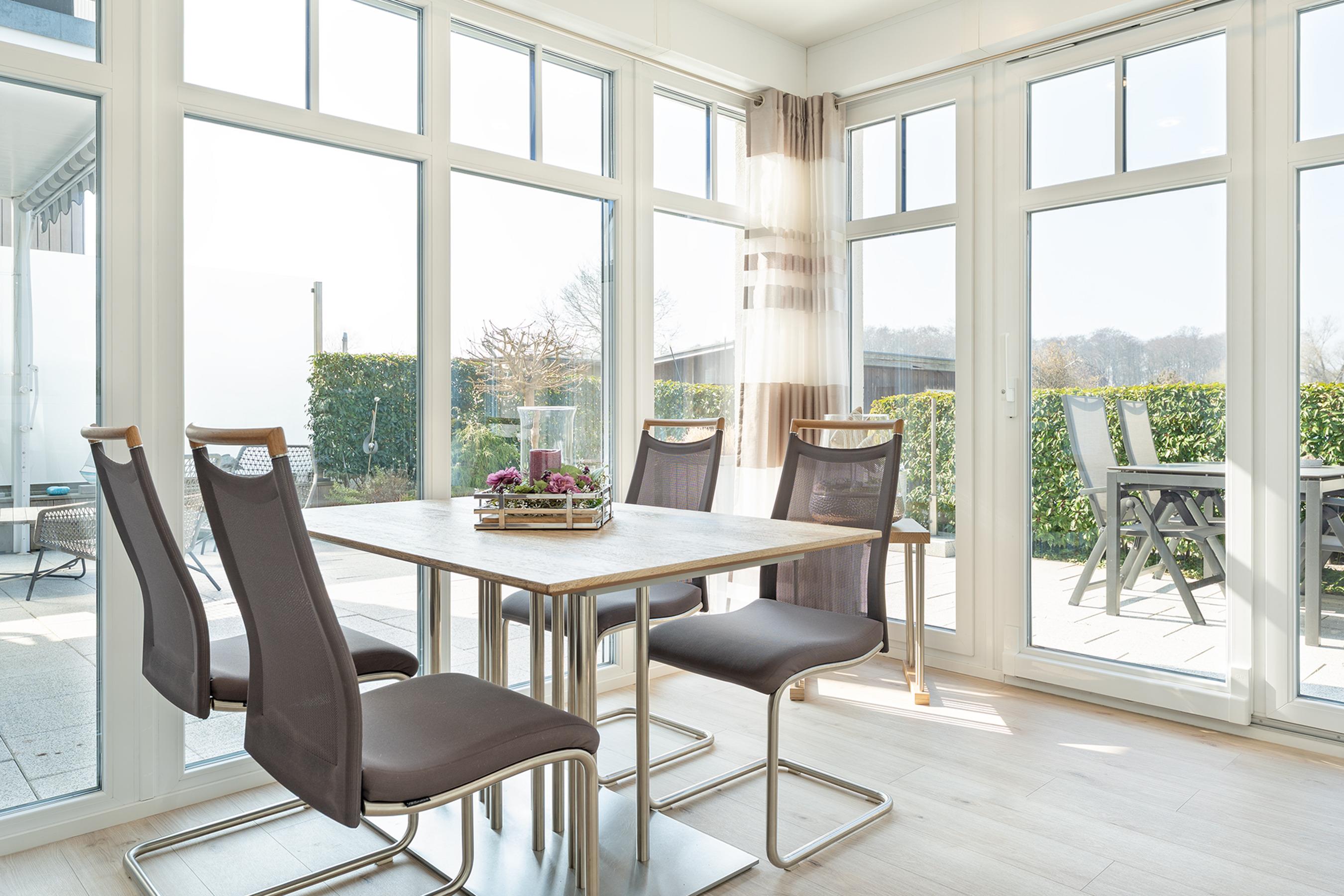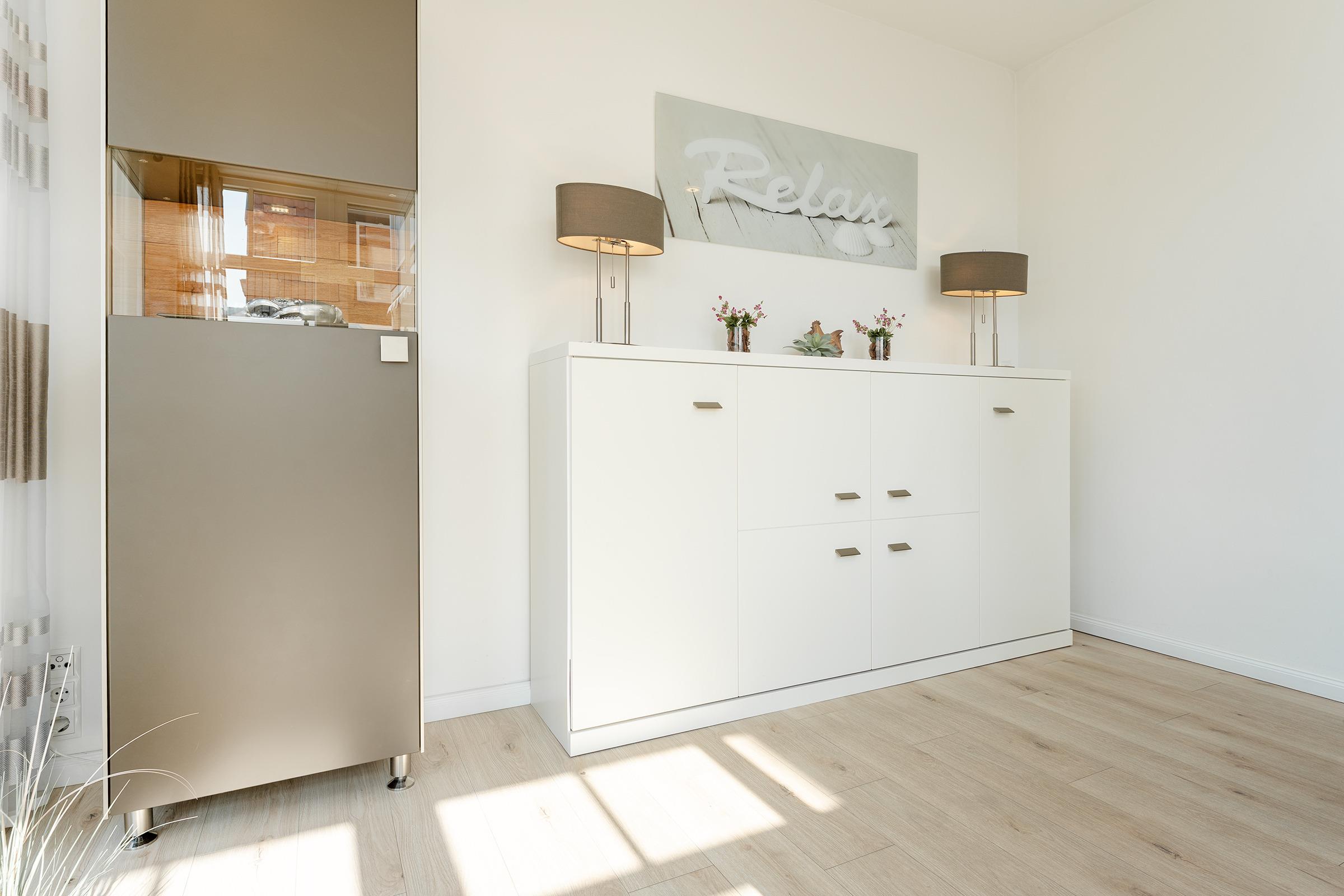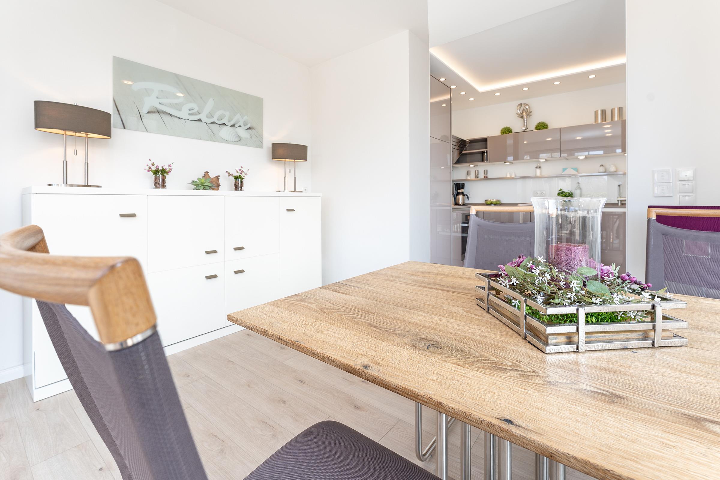 Der großzügige Wohnbereich ist modern eingerichtet und bietet eine gemütliche Sofaecke sowie einen TV für entspannte Abende. Durch große Fenster ist der Raum lichtdurchflutet. Die angrenzende Terrasse mit Gartenmöbeln lädt dazu ein, die frische Meeresbrise zu genießen. WLAN ist inklusive.