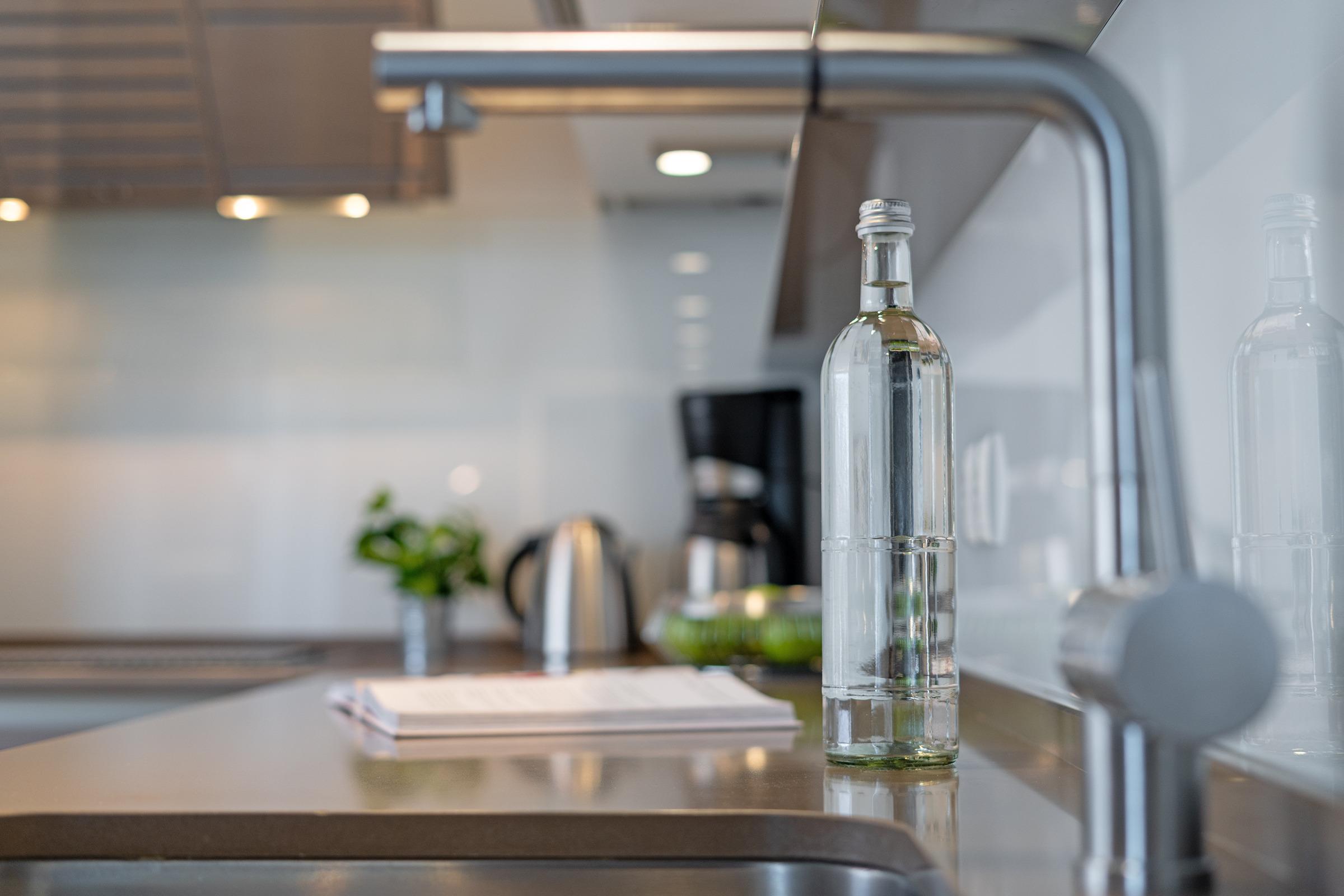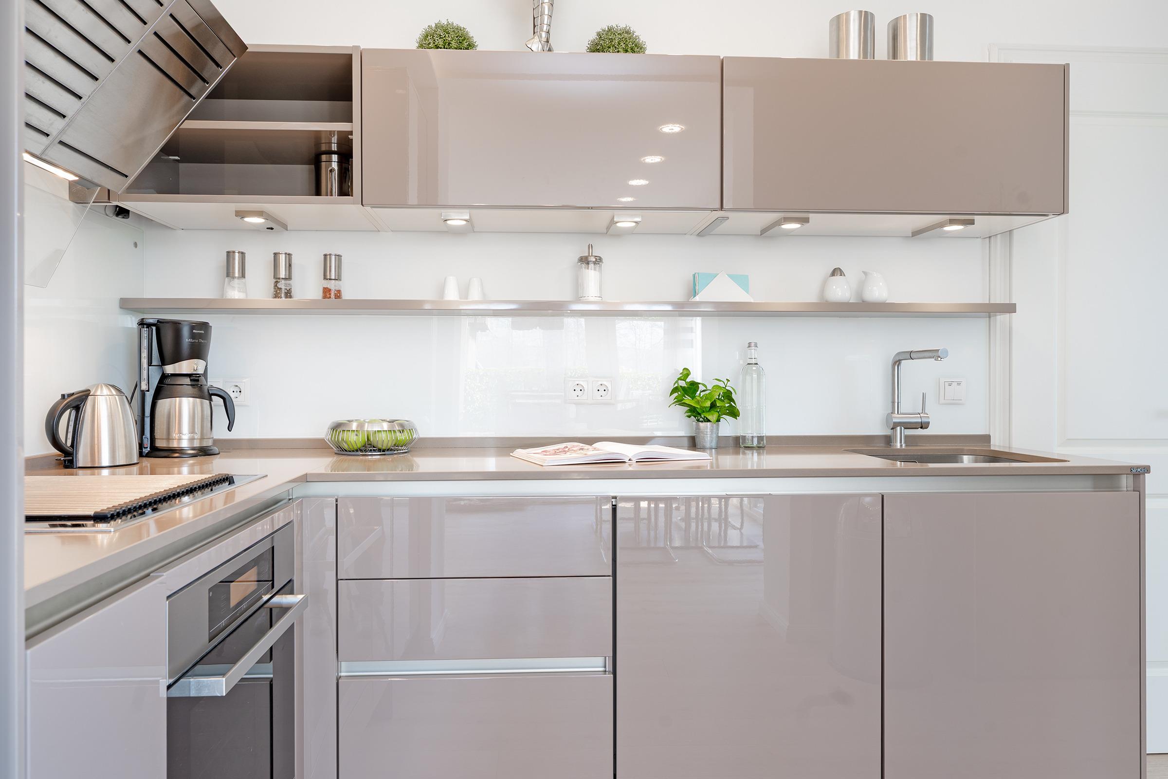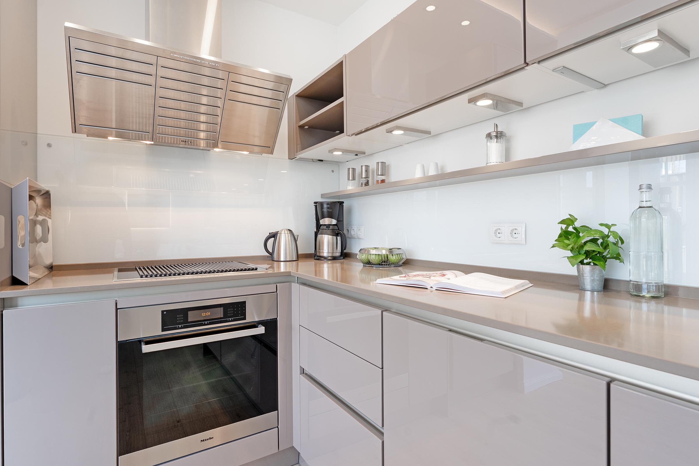 Die offene Küche ist bestens ausgestattet mit Induktionsherd, Backofen, Kühlschrank mit Gefrierfach, Mikrowelle, Spülmaschine, Kaffeemaschine und Toaster. Der Essbereich bietet ausreichend Platz für gemeinsame Mahlzeiten.