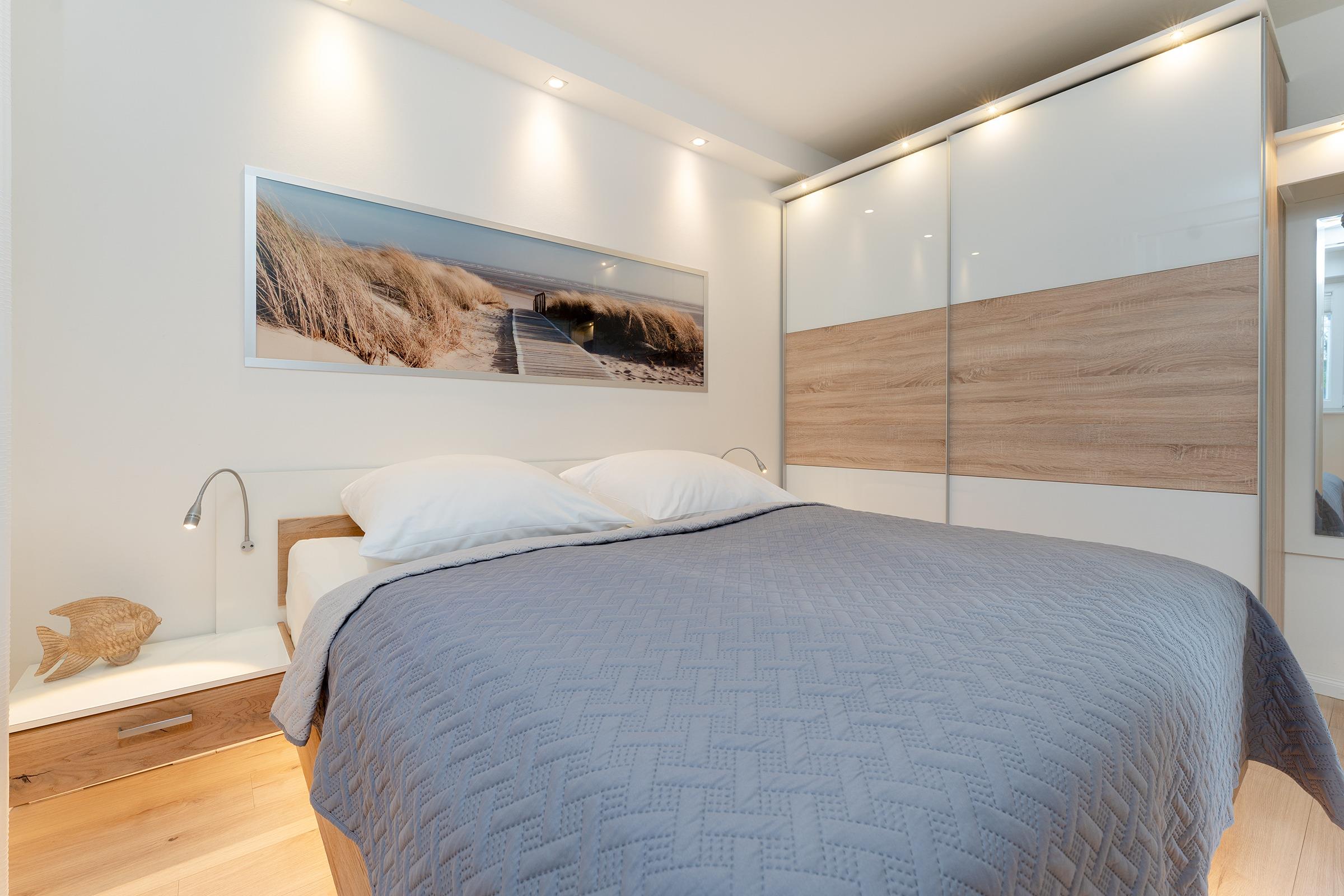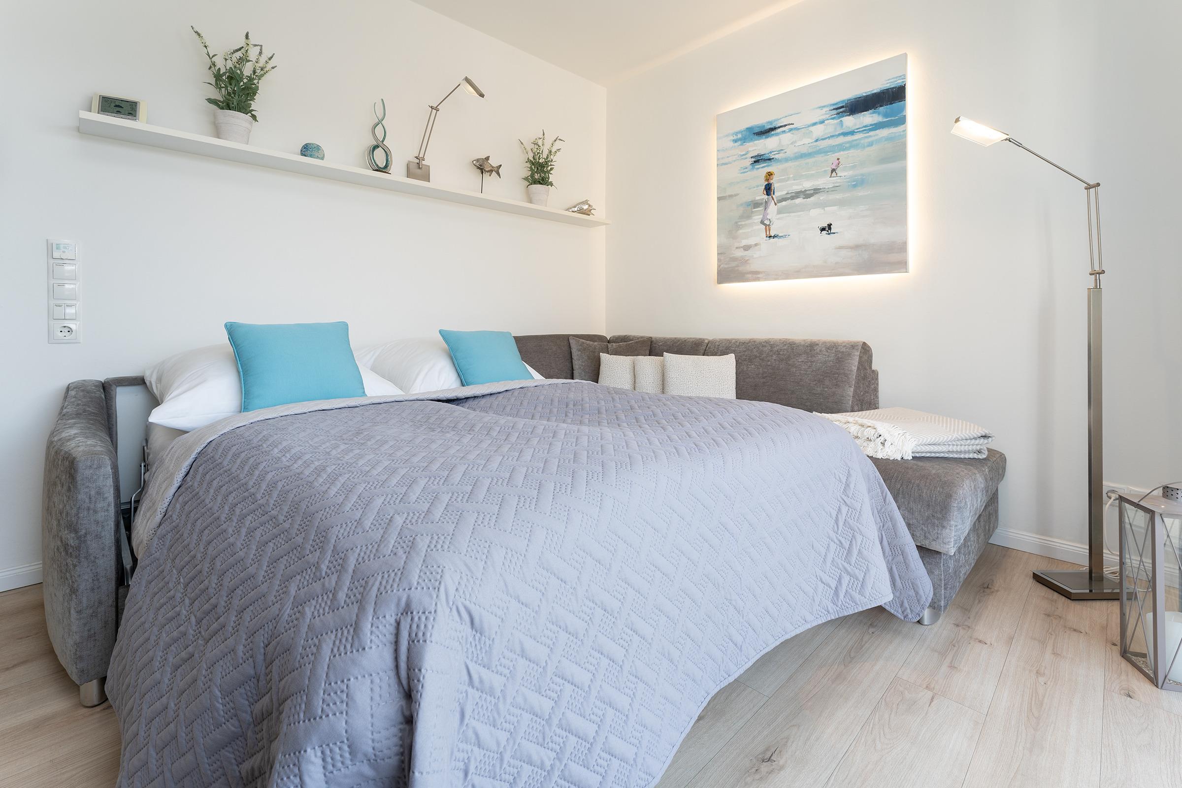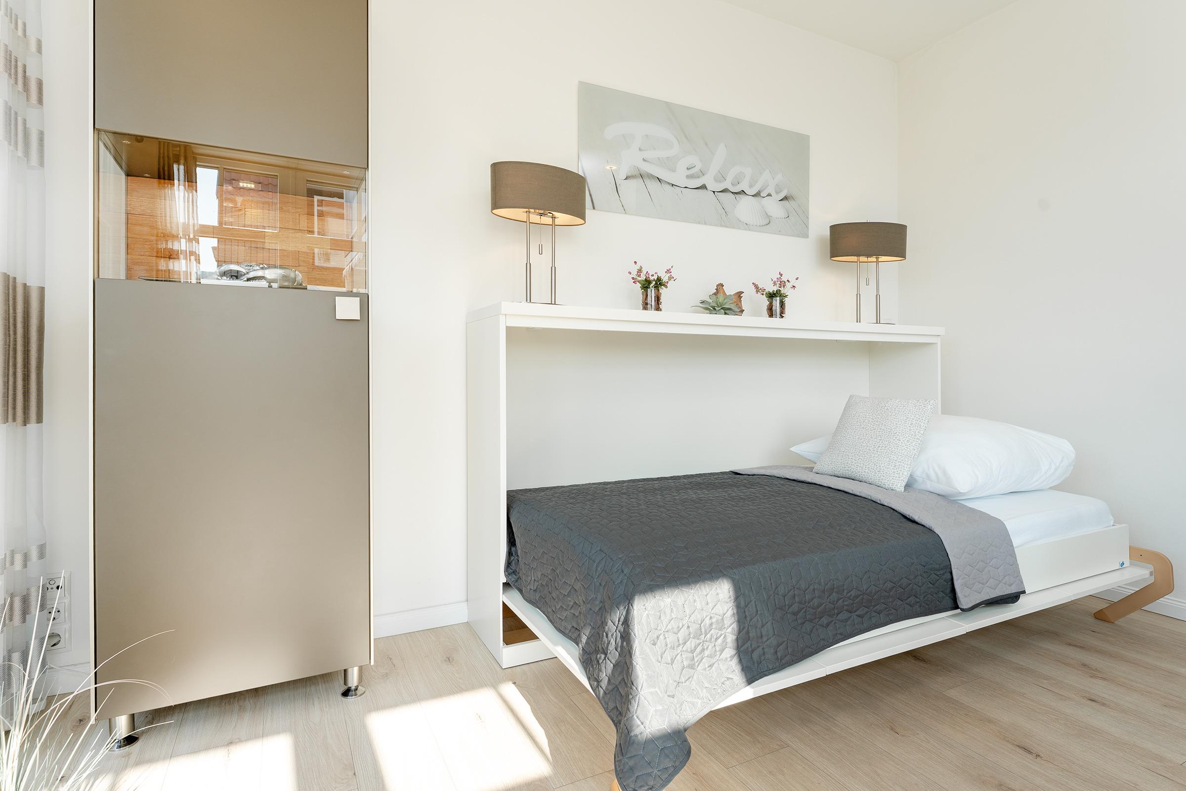 Das Schlafzimmer verfügt über ein komfortables Doppelbett und sorgt für erholsame Nächte. Weitere Gäste kommen auf einem gemütlichen Schlafsofa im Wohnbereich oder einem Schrankbett unter.
