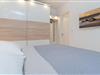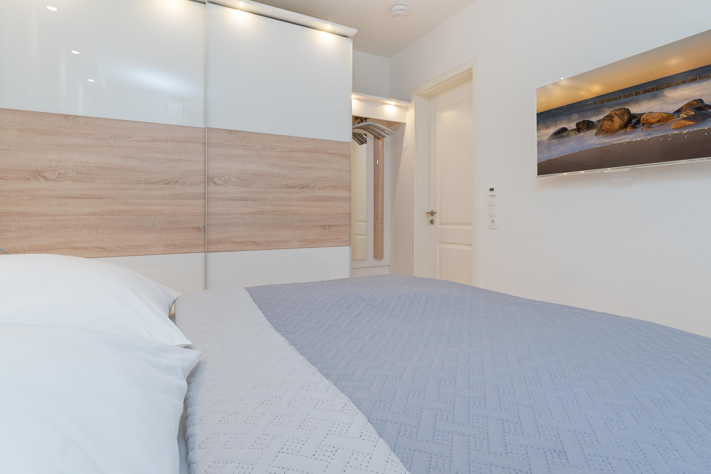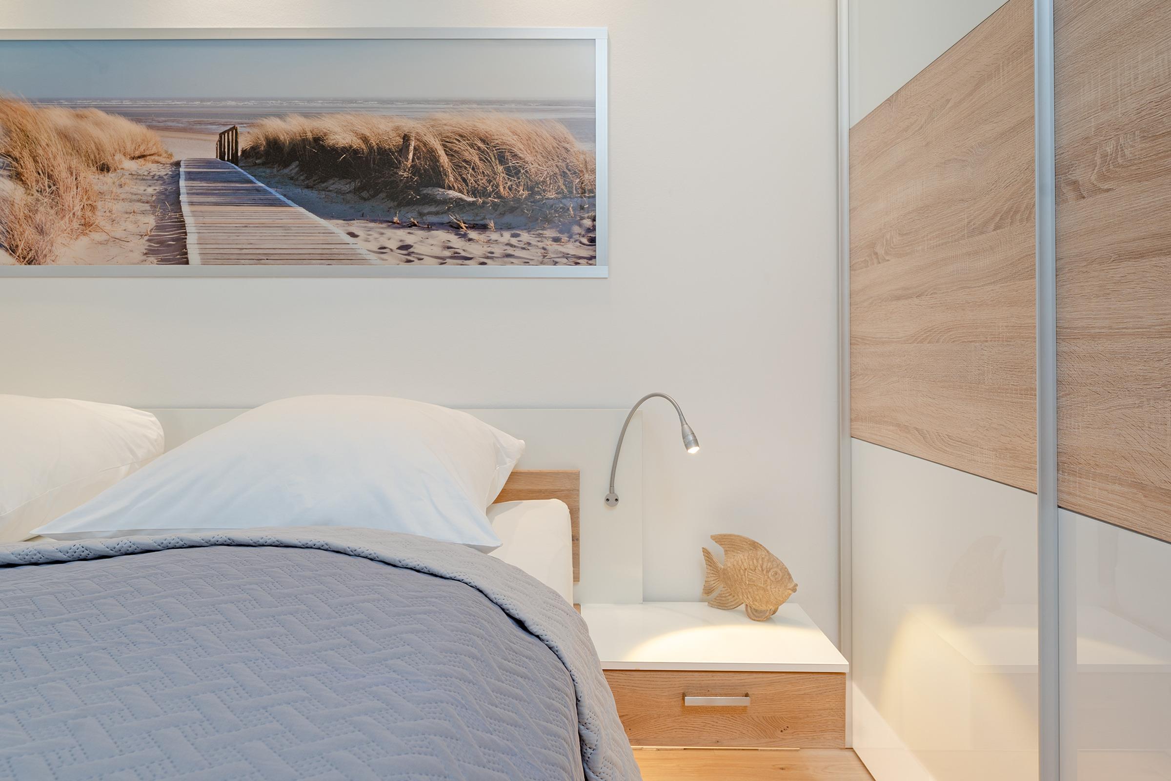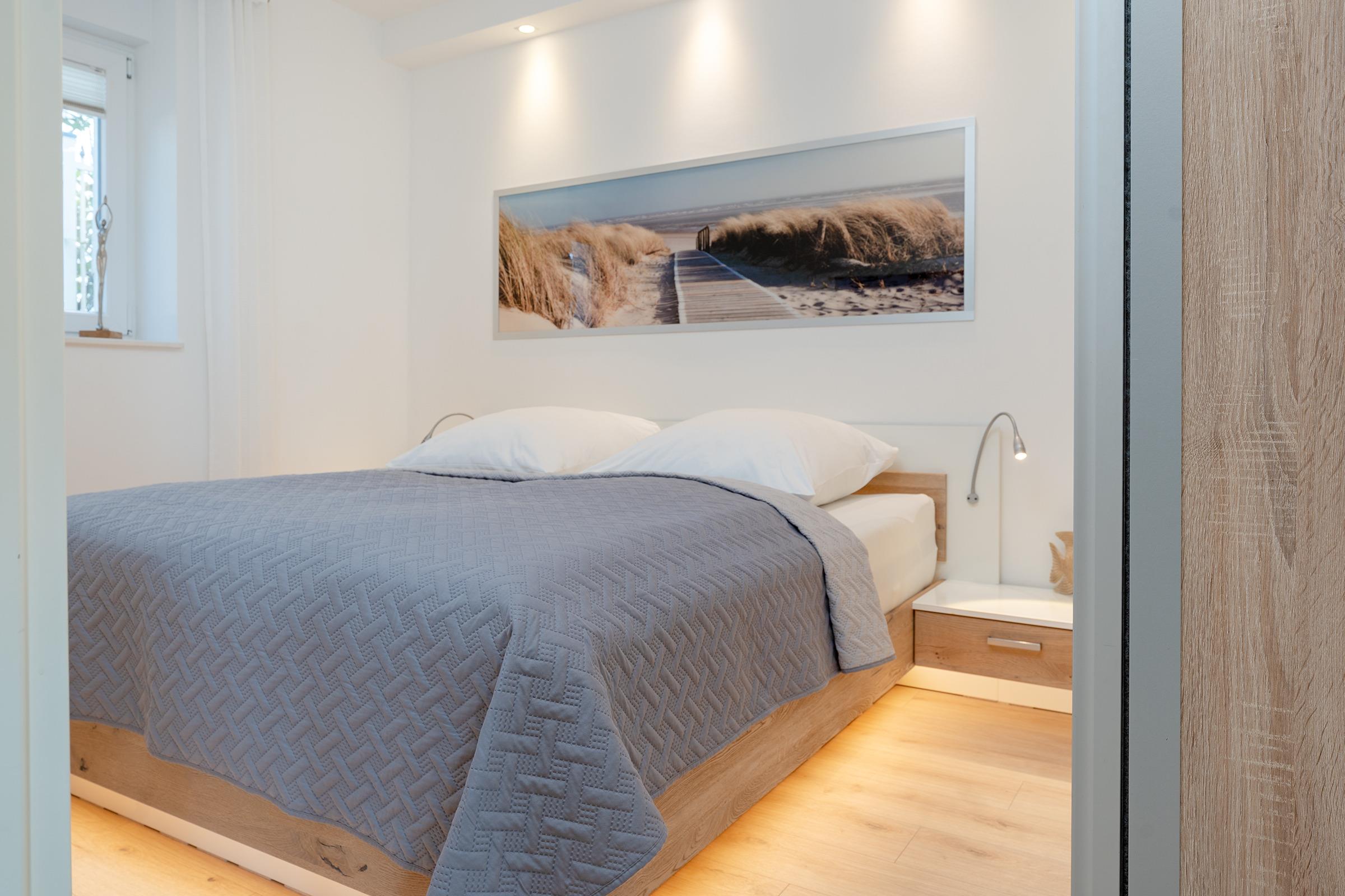 Das Schlafzimmer verfügt über ein komfortables Doppelbett und sorgt für erholsame Nächte. Weitere Gäste kommen auf einem gemütlichen Schlafsofa im Wohnbereich oder einem Schrankbett unter.