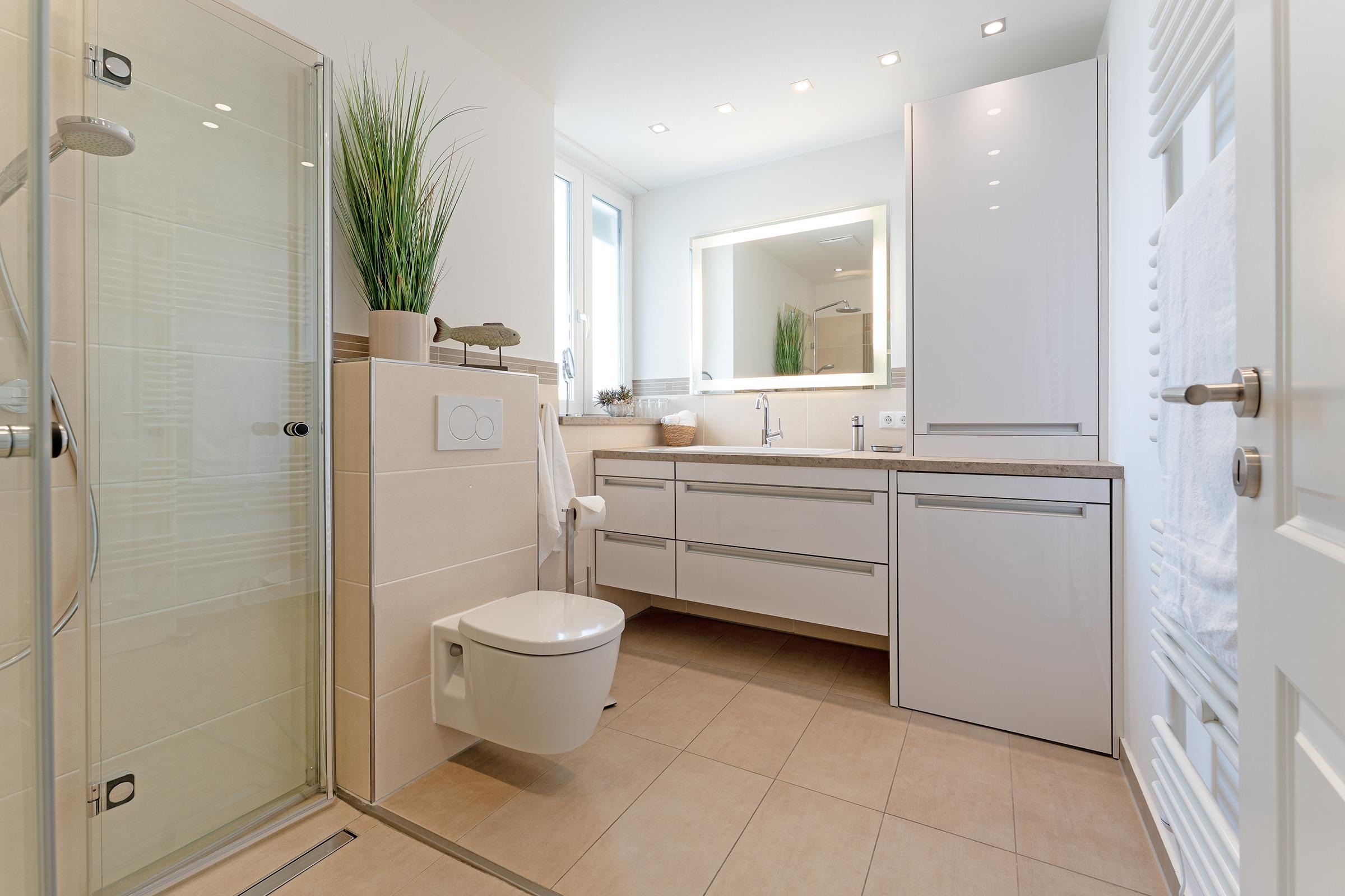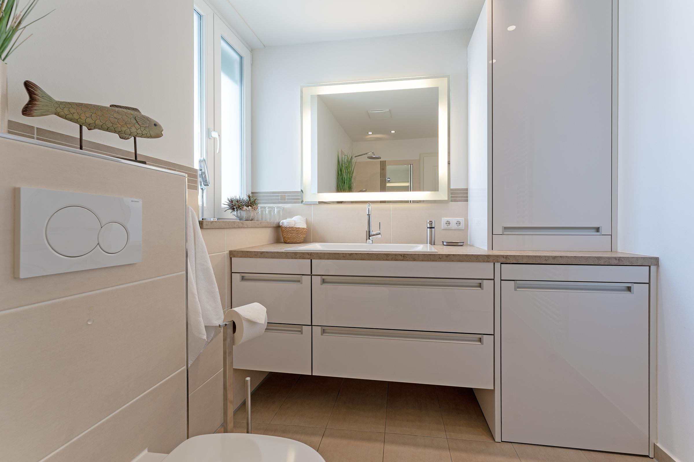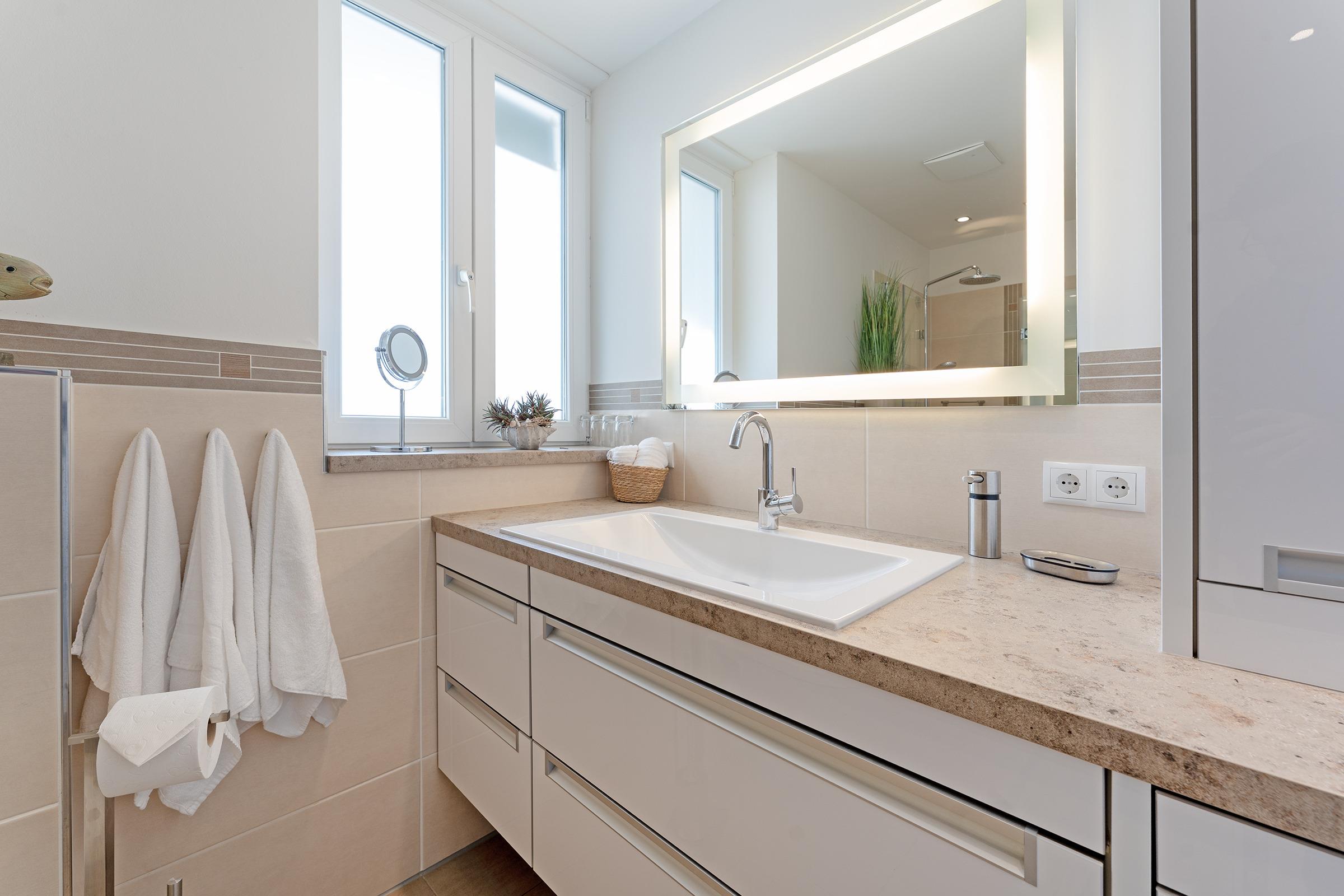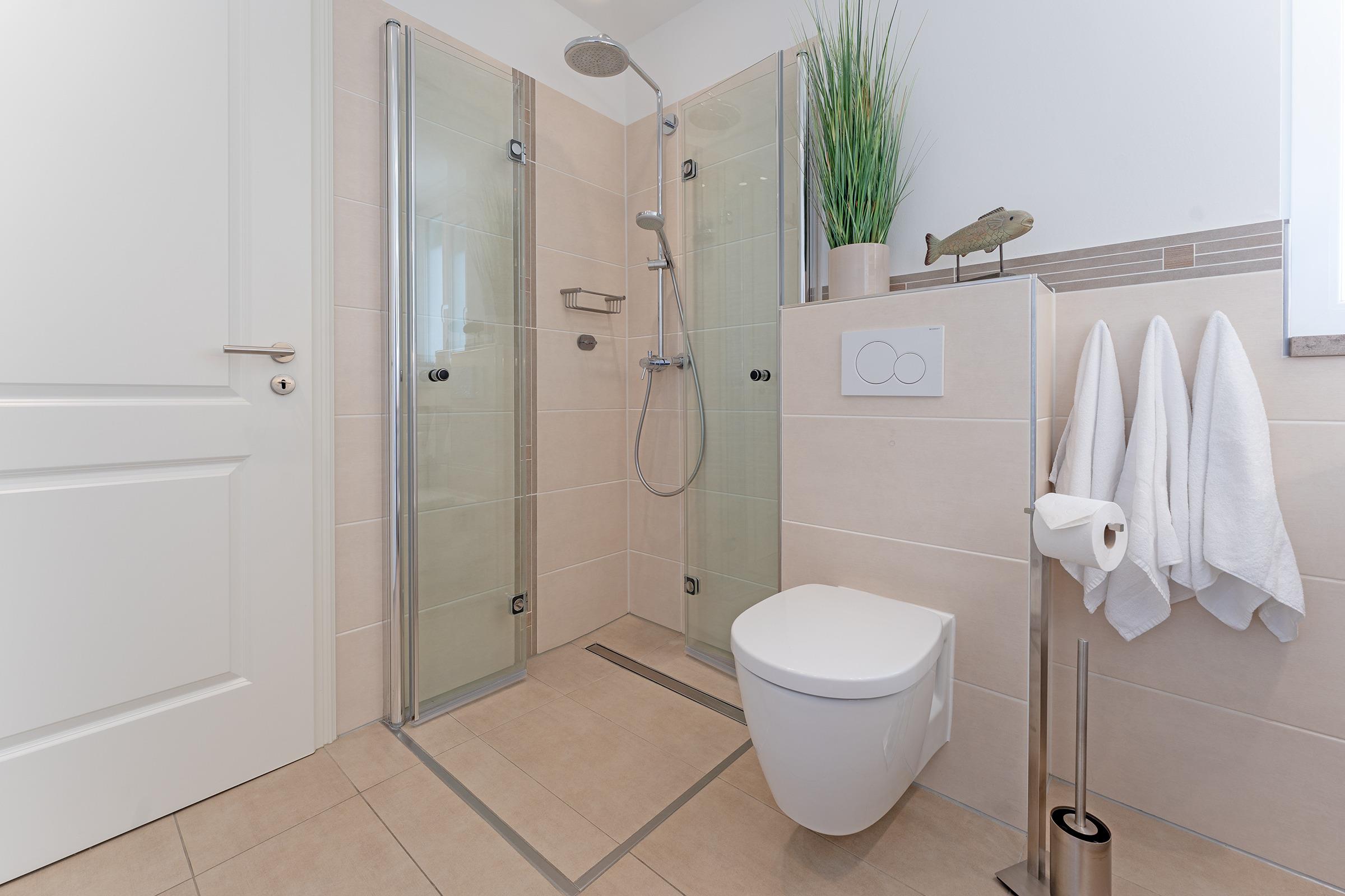 Das moderne Badezimmer bietet eine bodengleiche Dusche, Waschbecken und WC. Zusätzlich stehen ein Haartrockner sowie eine Waschmaschine zur Eigennutzung zur Verfügung.