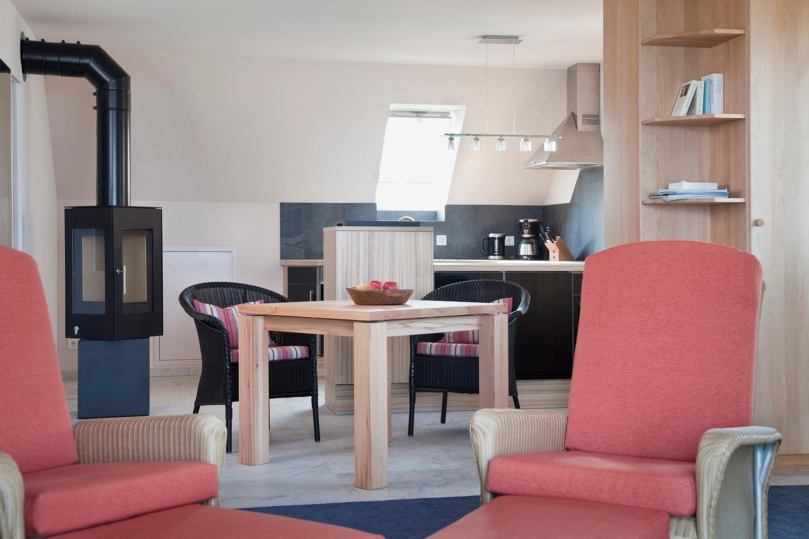 Dieses großzügige Appartement in der zweiten Etage bietet nicht zuletzt mit seinem Designer-Kaminofen und einem Balkon zur Ostsee ein umfassendes Wohlfühlambiente zu jeder Jahreszeit.