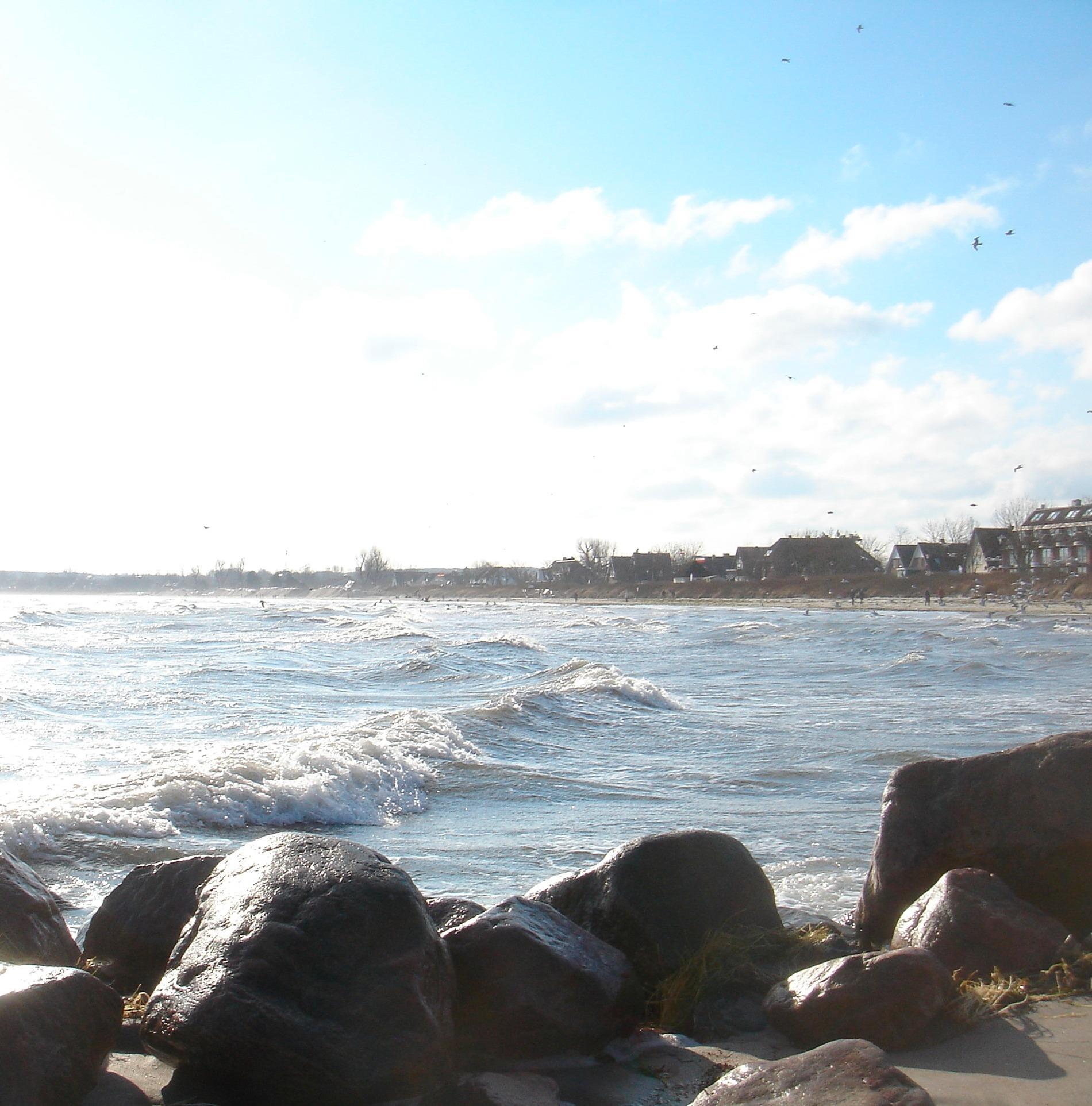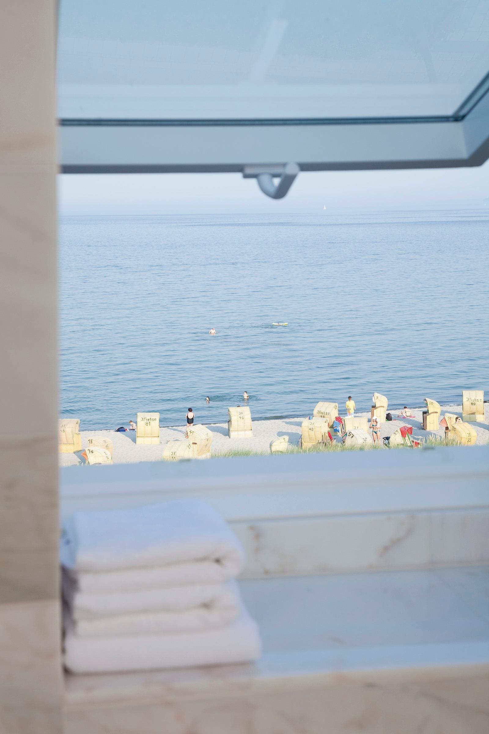Aus dem Wohn-Essraum, aber auch vom Schlafraum aus, haben Sie einen wunderschönen Blick auf das nahe Strandtreiben sowie über die Ostsee bis zum Horizont.