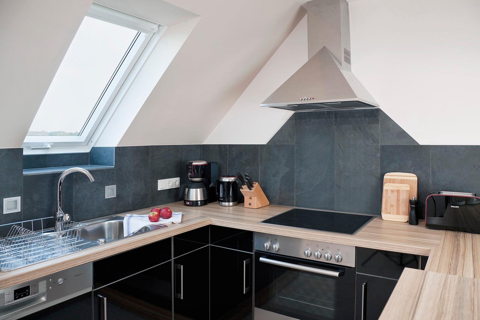Die klug eingeplante Küche ist nicht nur optisch ein Leckerbissen. Man kann bei der Vorbereitung seinen Blick entspannt über die Ostsee bis nach Neustadt und Mecklenburg schweifen lassen – oder die Illumination des ca. 40 m² großen Multifunktionsraums durch die letzte Abendsonne genießen. Zwischen Ess- und Wohnbereich steht als Raumteiler ein maßgefertigter Kleiderschrank zur Aufnahme Ihrer Reiseutensilien bereit.