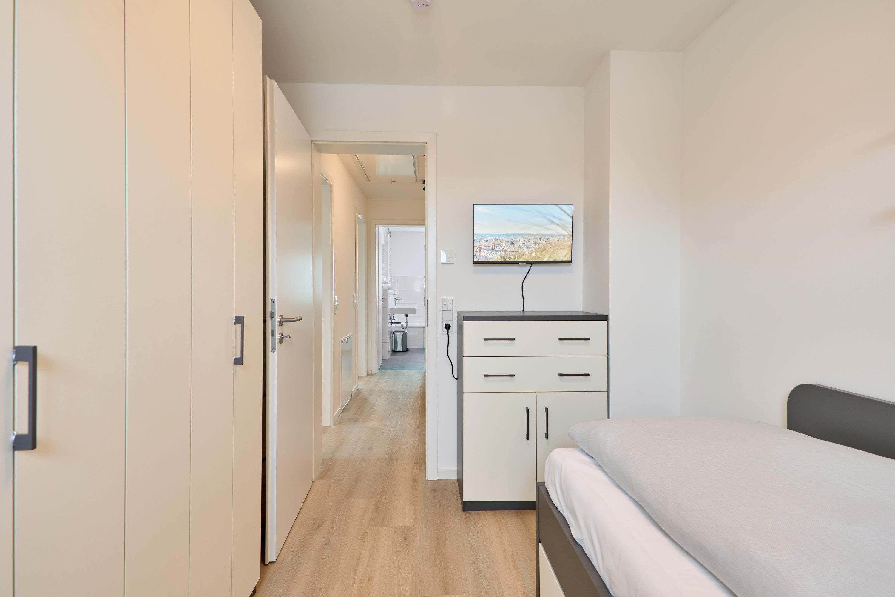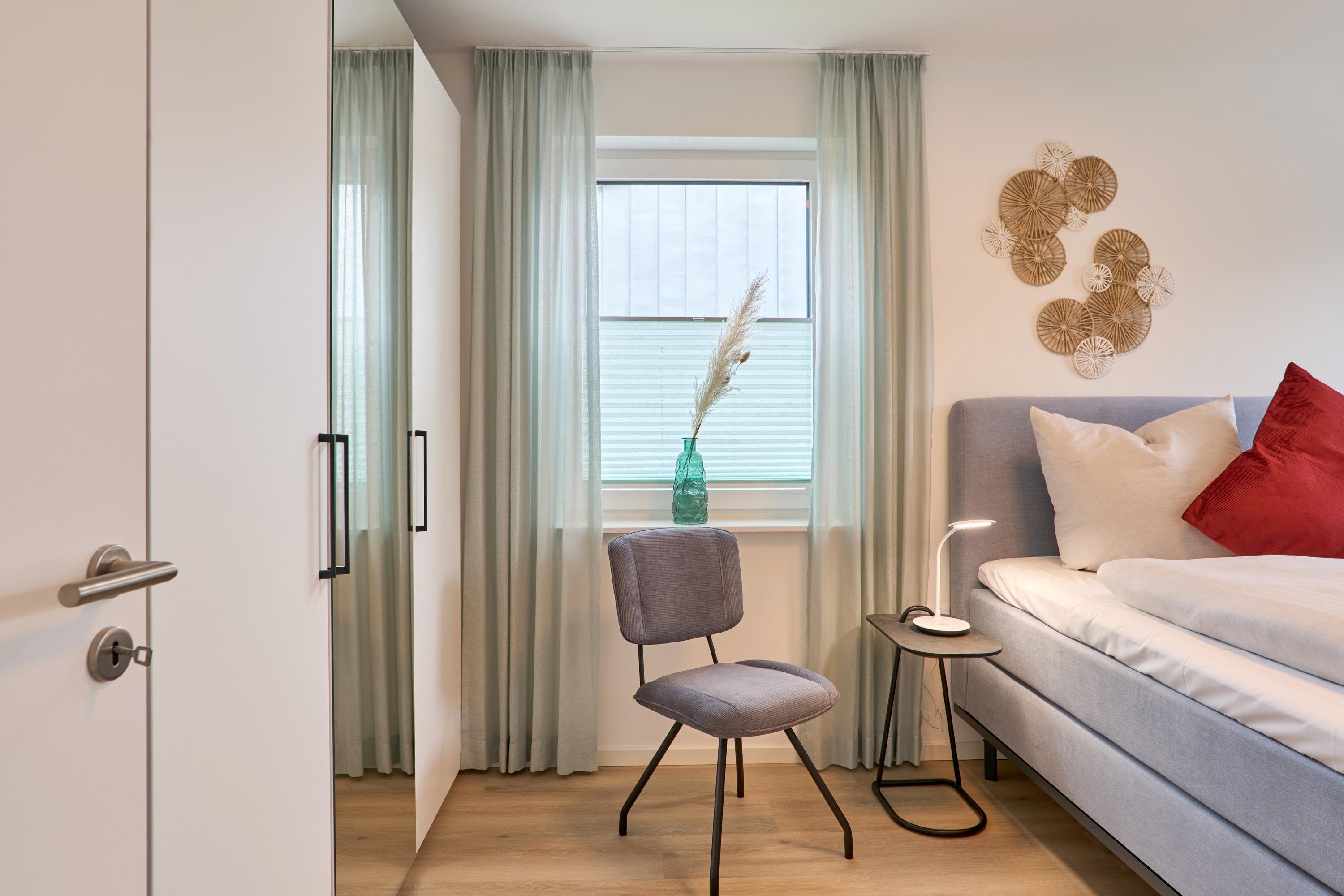 Über eine bequeme Treppe gelangen Sie in das 1. Obergeschoss. Hier befinden sich drei Schlafzimmer sowie das zweite Tageslichtbad, ausgestattet mit einer Badewanne sowie einer bodengleichen Dusche. Zwei Schlafzimmer sind mit je einem Kleiderschrank, zwei Nachttischen sowie mit einem Boxspringbett 1,80x2,00m ausgestattet. Das dritte Schlafzimmer ist mit einem Kombibett eingerichtet. Hier lässt sich aus dem Bettkasten eine weitere Schlafgelegenheit ausziehen. Alle Räume lassen sich mit elektrischen Rollläden verdunkeln.