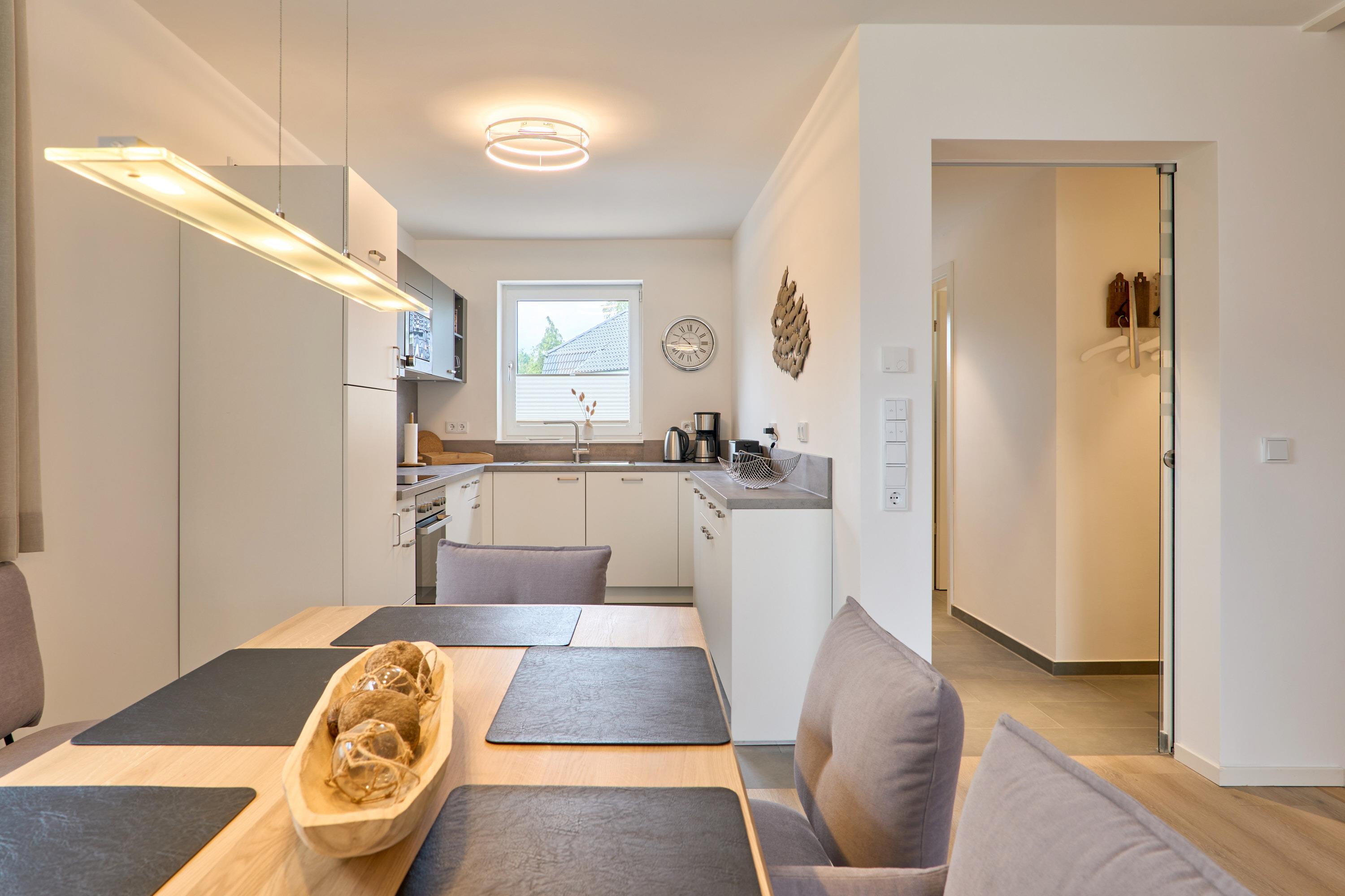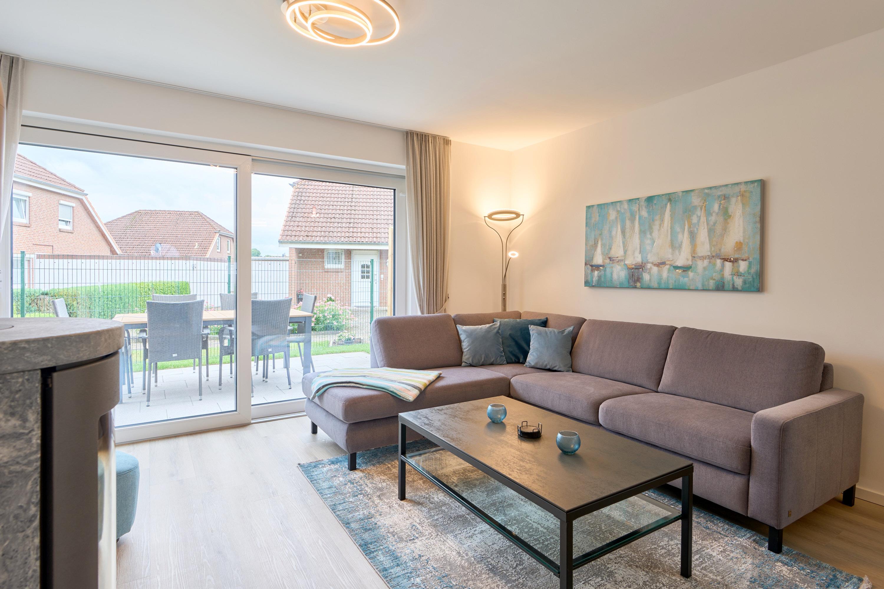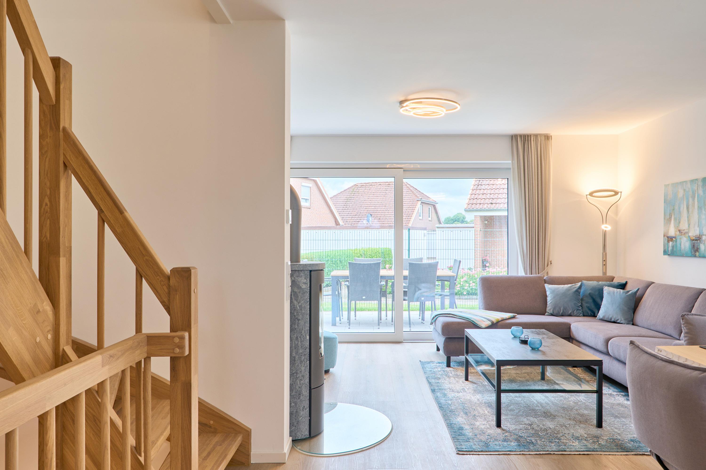 Dieses sehr ansprechende Ferienhaus hat eine Wohnfläche von ca. 100 m² und ist auf zwei Etagen aufgeteilt. Der Eingangsbereich ist großzügig mit einer Garderobe und einem Tageslichtbad ausgestattet und trennt den Wohn-Essbereich mit einer Glastür. Die Küchenzeile ist großzügig in U-Form angelegt. Alles da … Geschirrspüler, Herd, Kochfeld, Kaffeemaschine, Toaster, Wasserkocher, Waschmaschine und vieles mehr. Der Essbereich bietet Platz für 6 Personen. Im Anschluss das gemütliche Wohnzimmer mit Sofa, Tisch, Relaxsessel, 55-Zoll-Smart-TV und Kamin für gemütliche Stunden in der kalten Jahreszeit. Vom Wohnzimmer aus betreten Sie die große Südterrasse.