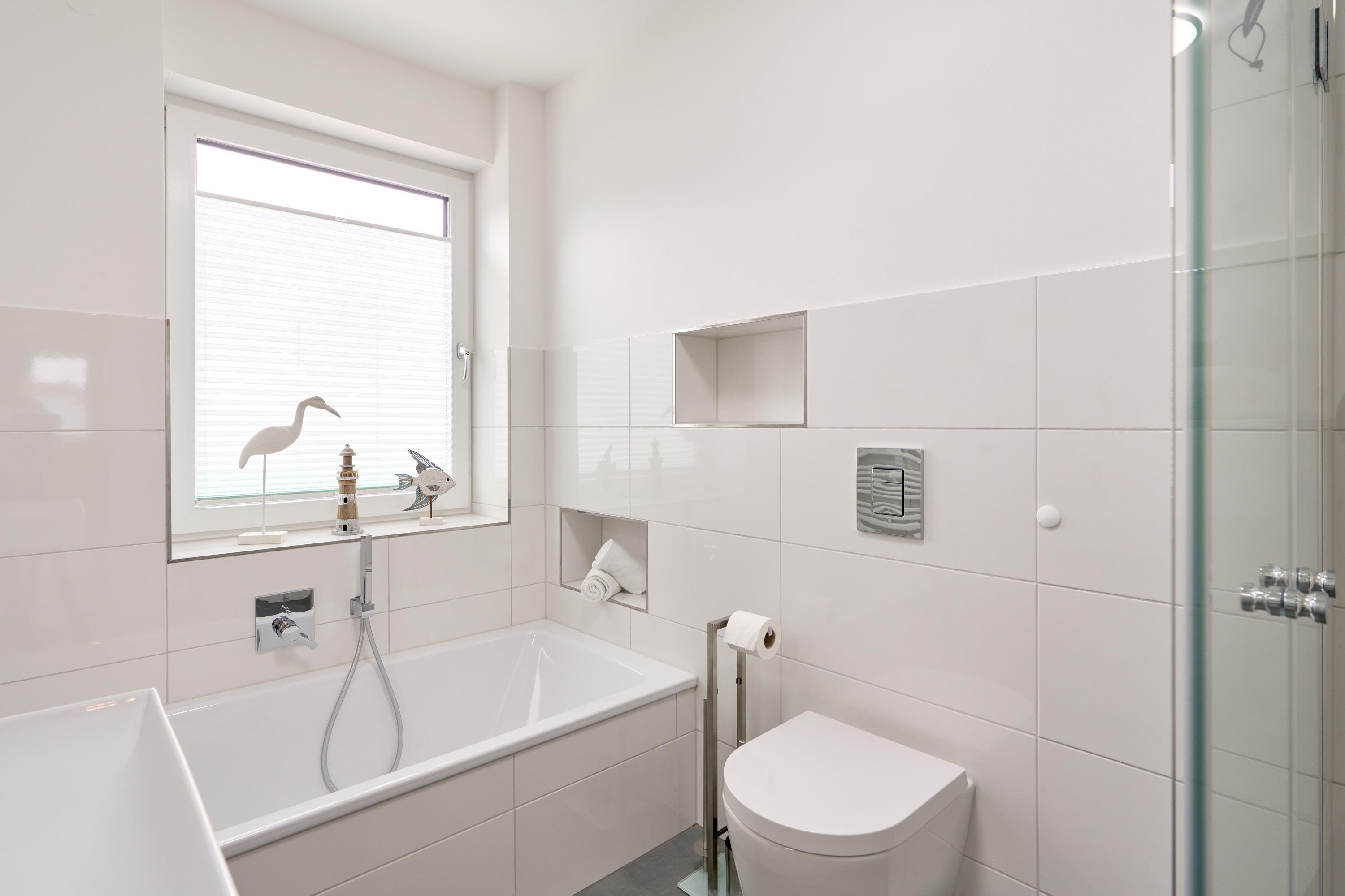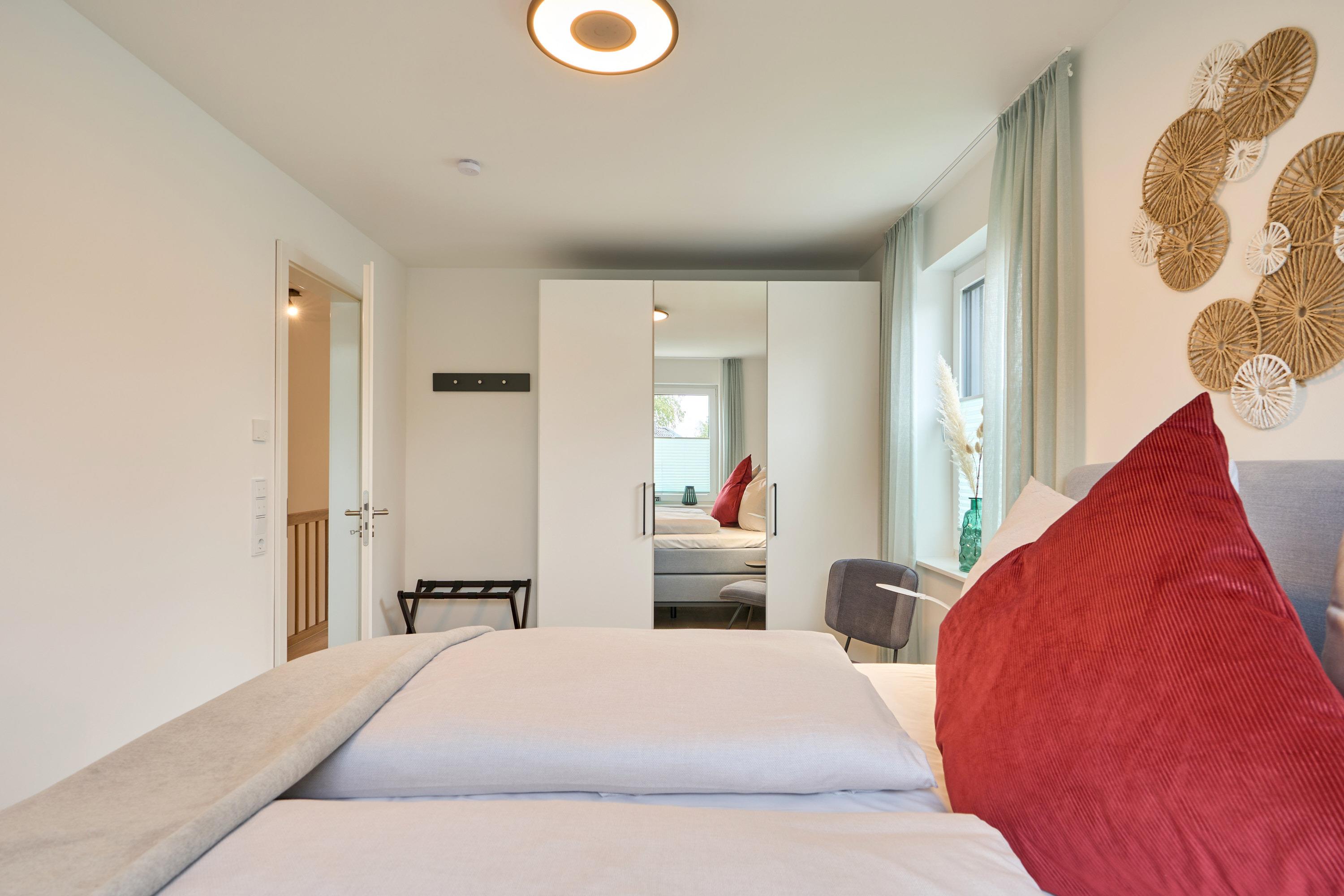 Über eine bequeme Treppe gelangen Sie in das 1. Obergeschoss. Hier befinden sich drei Schlafzimmer sowie das zweite Tageslichtbad, ausgestattet mit einer Badewanne sowie einer bodengleichen Dusche. Zwei Schlafzimmer sind mit je einem Kleiderschrank, zwei Nachttischen sowie mit einem Boxspringbett (1,80x2,00m) ausgestattet. Das dritte Schlafzimmer ist mit einem Kombibett eingerichtet, hier lässt sich aus dem Bettkasten eine weitere Schlafgelegenheit ausziehen. Alle Räume lassen sich mit elektrischen Rollläden verdunkeln.