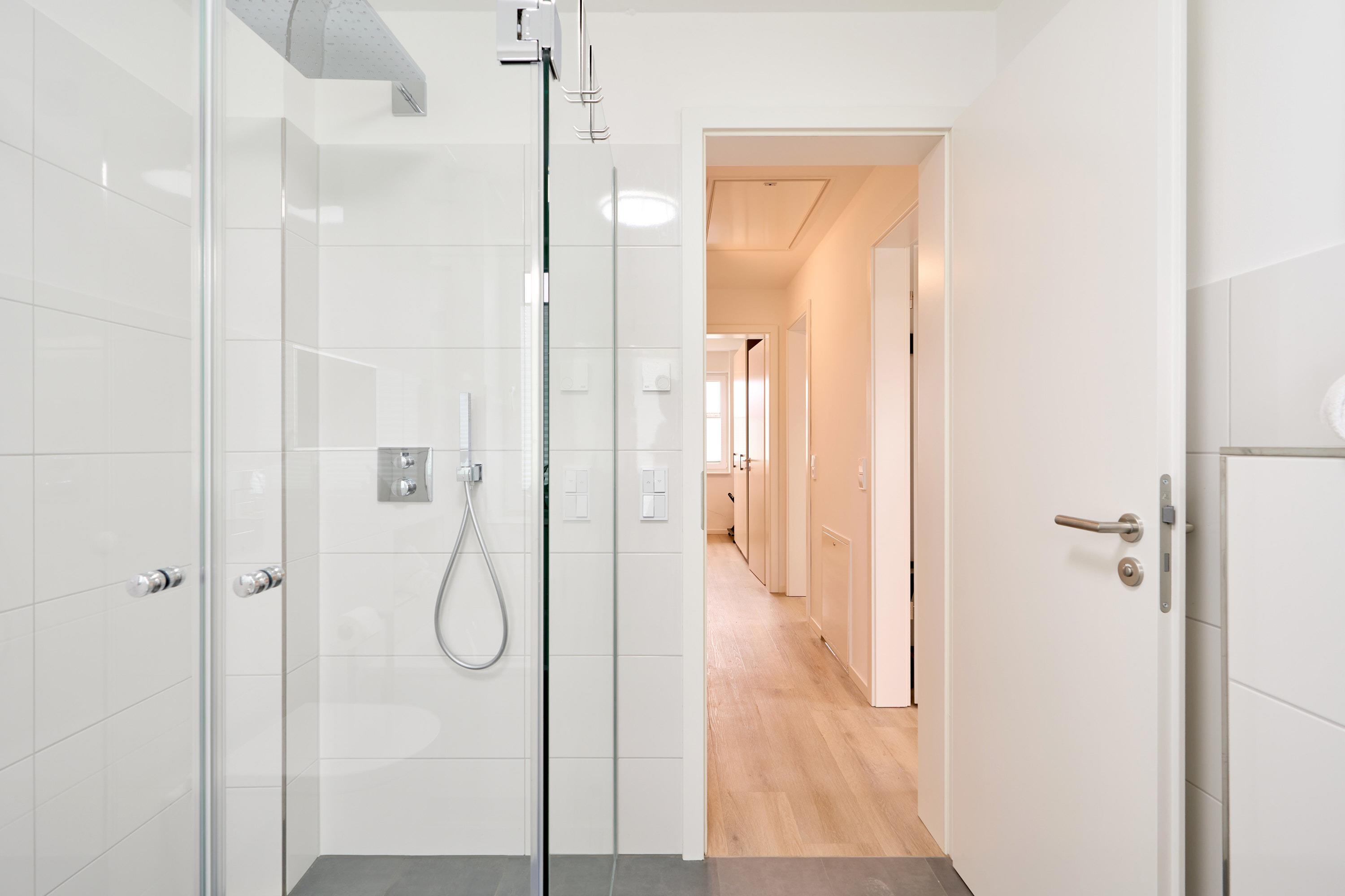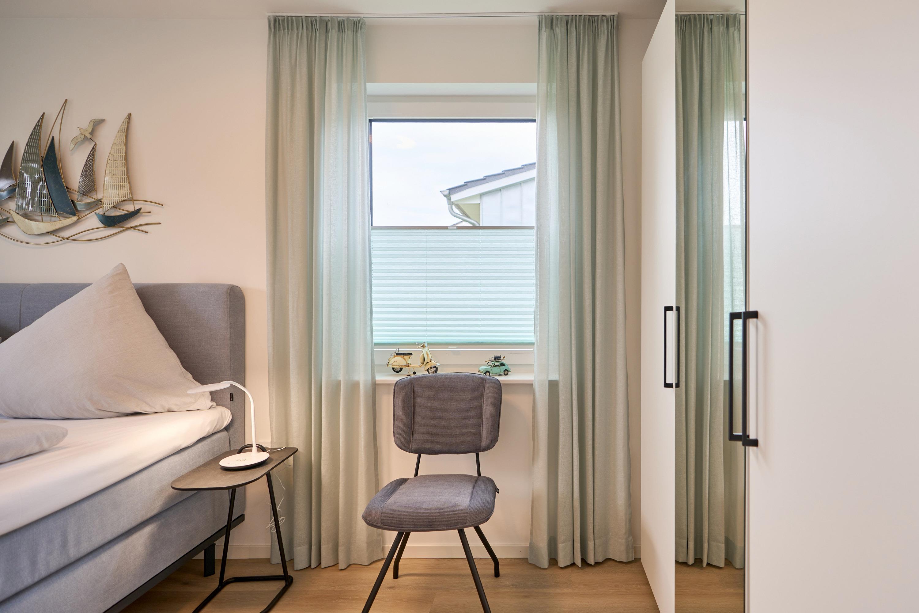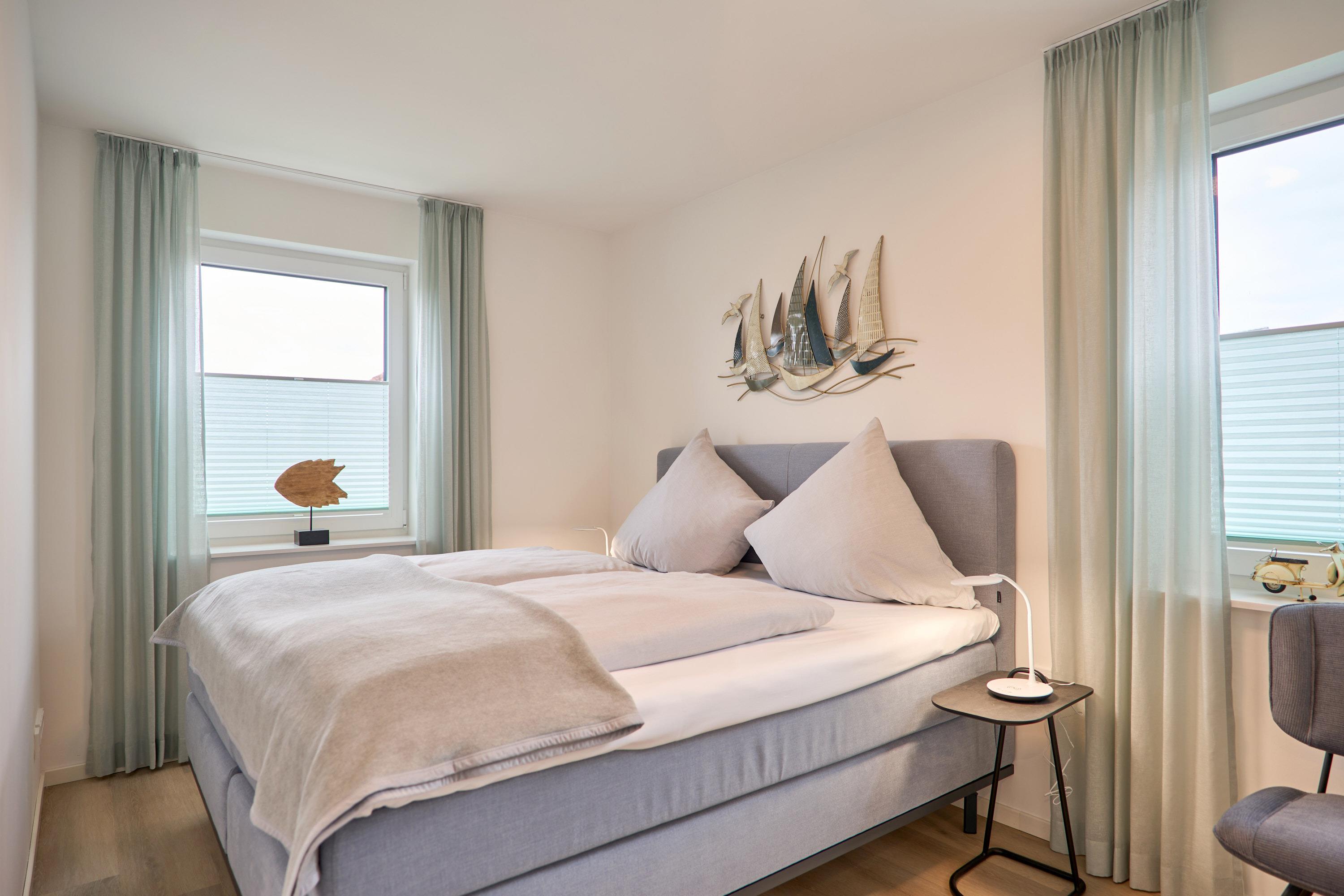 Über eine bequeme Treppe gelangen Sie in das 1. Obergeschoss. Hier befinden sich drei Schlafzimmer sowie das zweite Tageslichtbad, ausgestattet mit einer Badewanne sowie einer bodengleichen Dusche. Zwei Schlafzimmer sind mit je einem Kleiderschrank, zwei Nachttischen sowie mit einem Boxspringbett (1,80x2,00m) ausgestattet. Das dritte Schlafzimmer ist mit einem Kombibett eingerichtet, hier lässt sich aus dem Bettkasten eine weitere Schlafgelegenheit ausziehen. Alle Räume lassen sich mit elektrischen Rollläden verdunkeln.