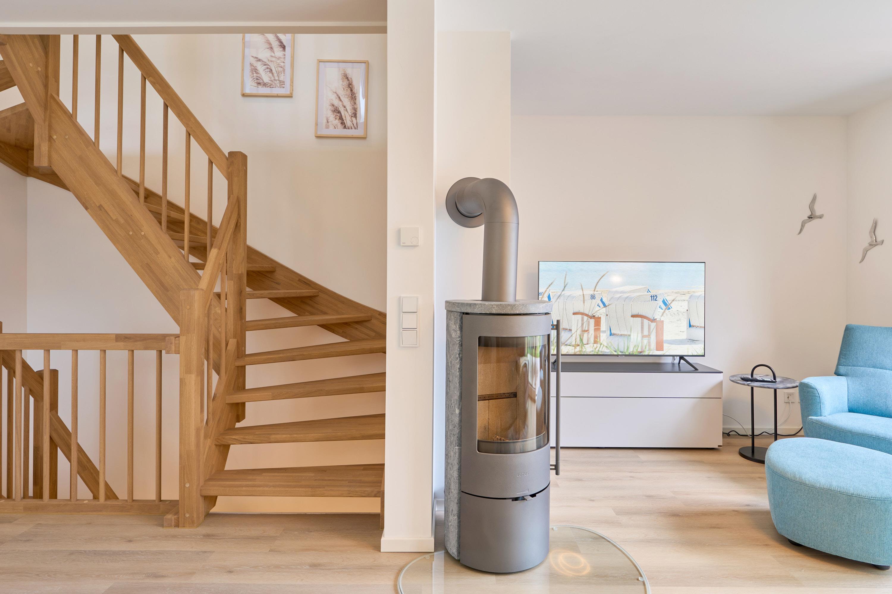 Dieses sehr ansprechende Ferienhaus hat eine Wohnfläche von ca. 100 m², auf zwei Etagen aufgeteilt. Der Eingangsbereich ist großzügig mit einer Garderobe und einem Tageslichtbad ausgestattet und ist durch eine Glastür vom Wohn-Essbereich abgetrennt. Die Küchenzeile ist großzügig in U-Form angelegt. Alles da … Geschirrspüler, Herd, Kochfeld, Kaffeemaschine, Toaster, Wasserkocher, Waschmaschine und vieles mehr. Der Essbereich bietet Platz für 6 Personen. Im Anschluss das gemütliche Wohnzimmer, mit Sofa, Tisch, Relaxsessel und einem 55"-Smart-TV sowie einem Kaminofen für die kalte Jahreszeit. Vom Wohnzimmer haben Sie Zugang zur Terrasse.