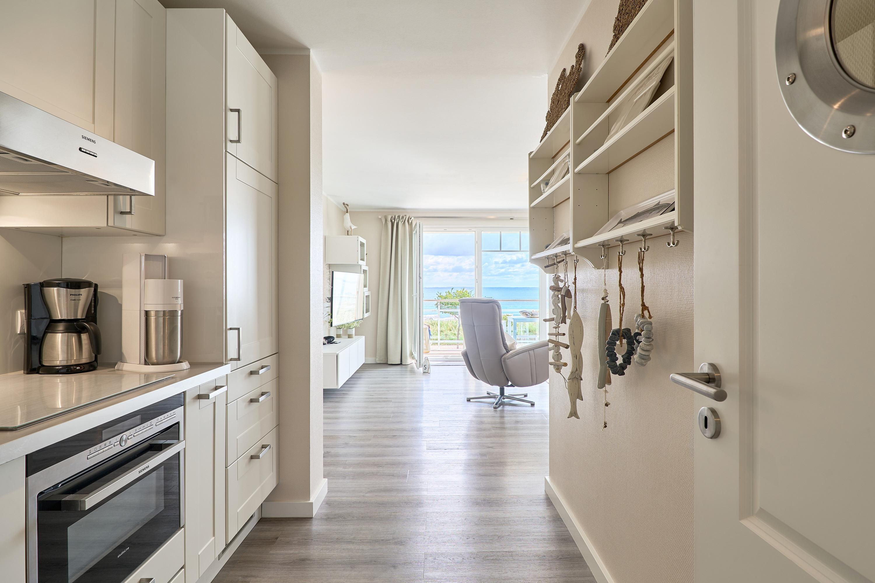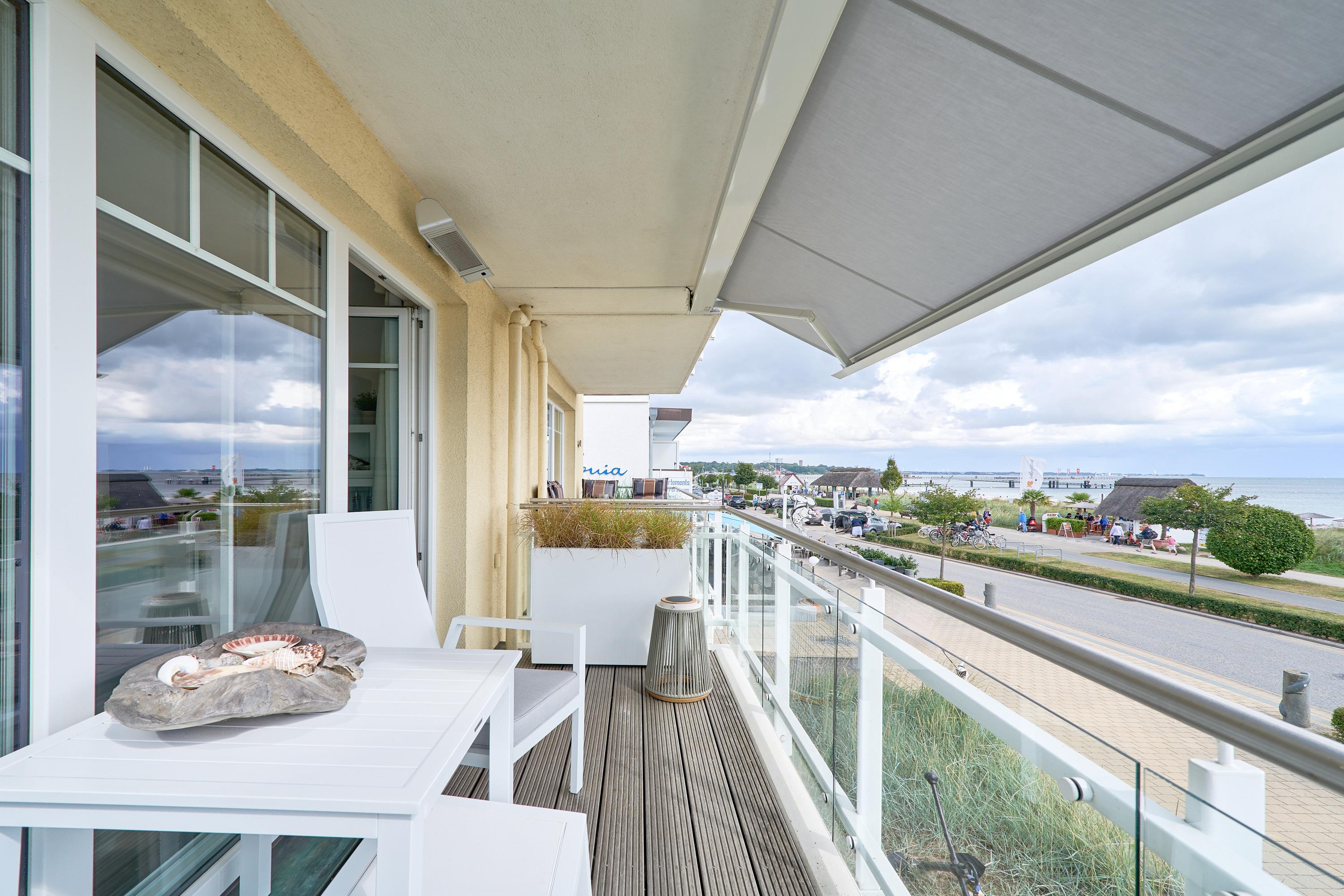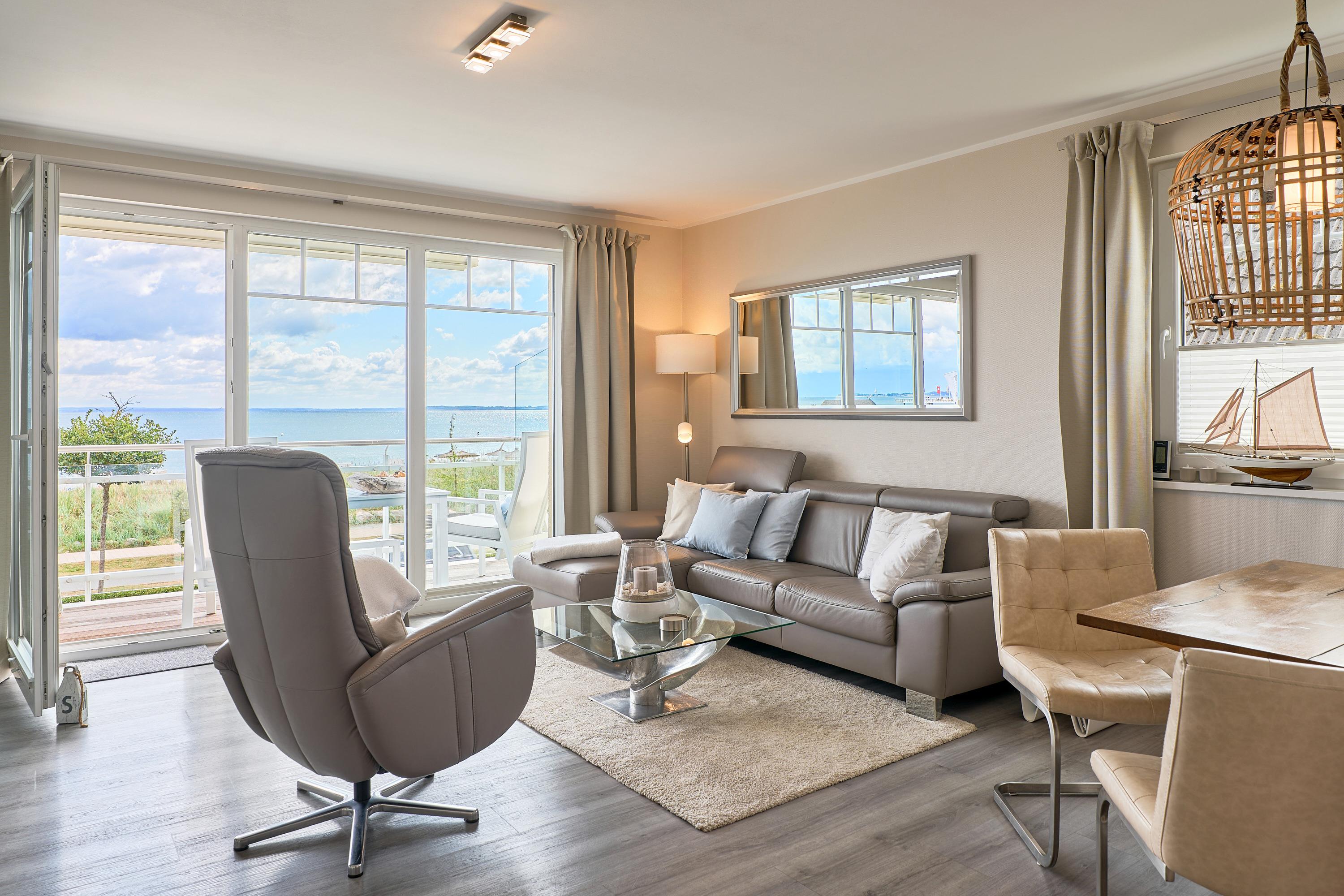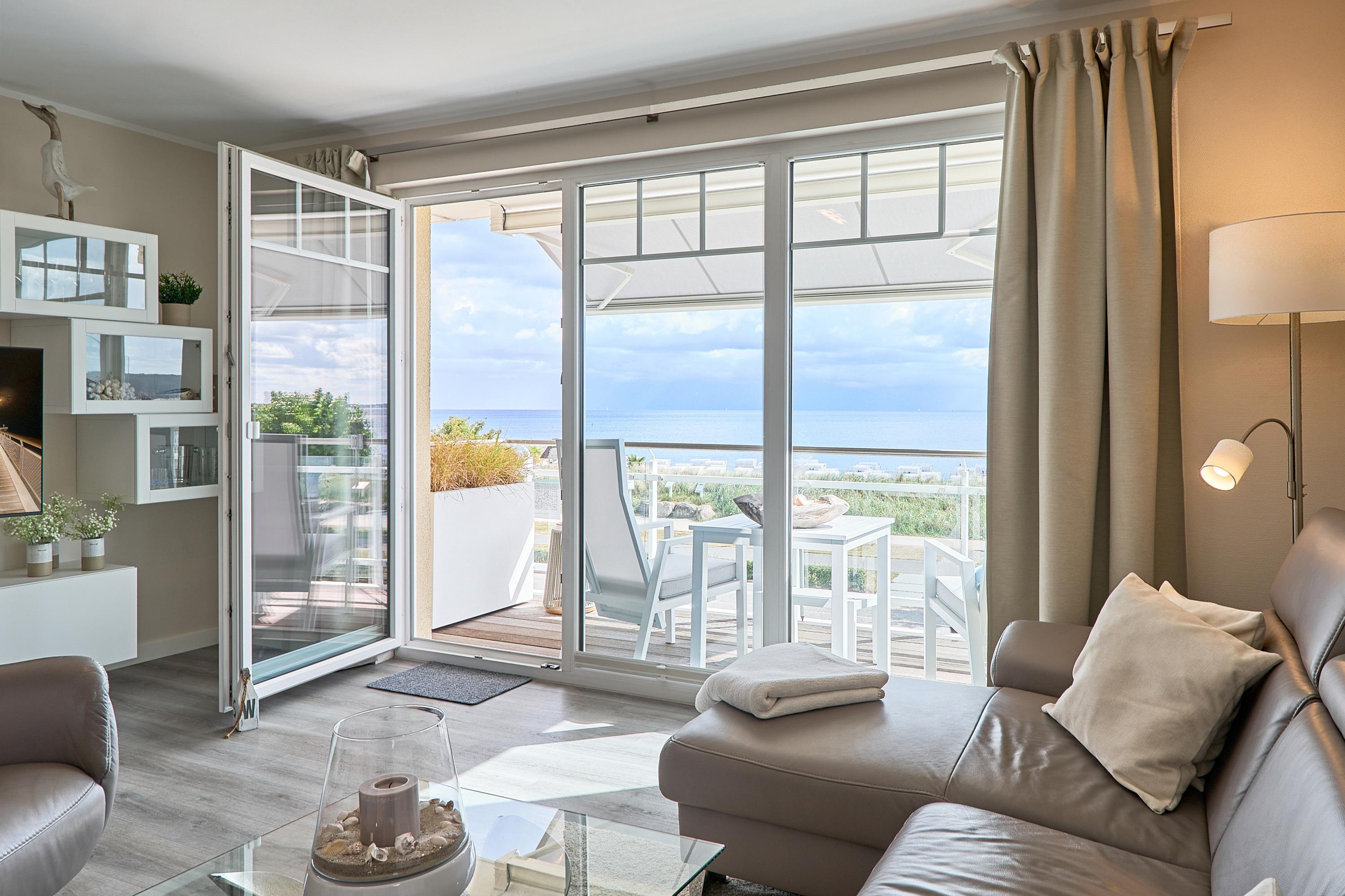 Die schöne Ferienwohnung Maison Baltique ist modern und freundlich eingerichtet. Vom offenen Wohn-Essbereich haben Sie einen direkten Blick auf die Ostsee. Die Küchenzeile ist mit einer Kaffeemaschine sowie einer Nespresso Maschine und einem Wasserkocher ausgestattet. Geschirrspüler, Kombigerät Backofen mit Mikrowelle, Ceran-Kochfeld und Kühlschrank sind für Sie vorhanden. Der Wohn- und Essbereich verfügt über einen Essplatz mit Meerblick sowie einen gemütlichen Sitzbereich mit Eck-Couch und einen bequemen Relax-Sessel sowie einem Schreibtisch. Smart-TV, kostenloses WLAN und Bluetooth-Lautsprecher stehen für Sie zur Verfügung. Das Tageslicht Badezimmer verfügt über eine Regendusche sowie einen Handtuchheizkörper und ist mit einer Waschmaschine und Fußbodenheizung ausgestattet. Das Schlafzimmer verzaubert mit einem bequemen Boxspringbett (1,80x2,00m), einem geräumigen Kleiderschrank sowie einem Flat TV. Beide Balkone sind möbliert. Ein Sonnenschutz steht für Sie zur Verfügung. Der Balkon zur Meerseite verfügt zudem über eine elektrische Markise.
